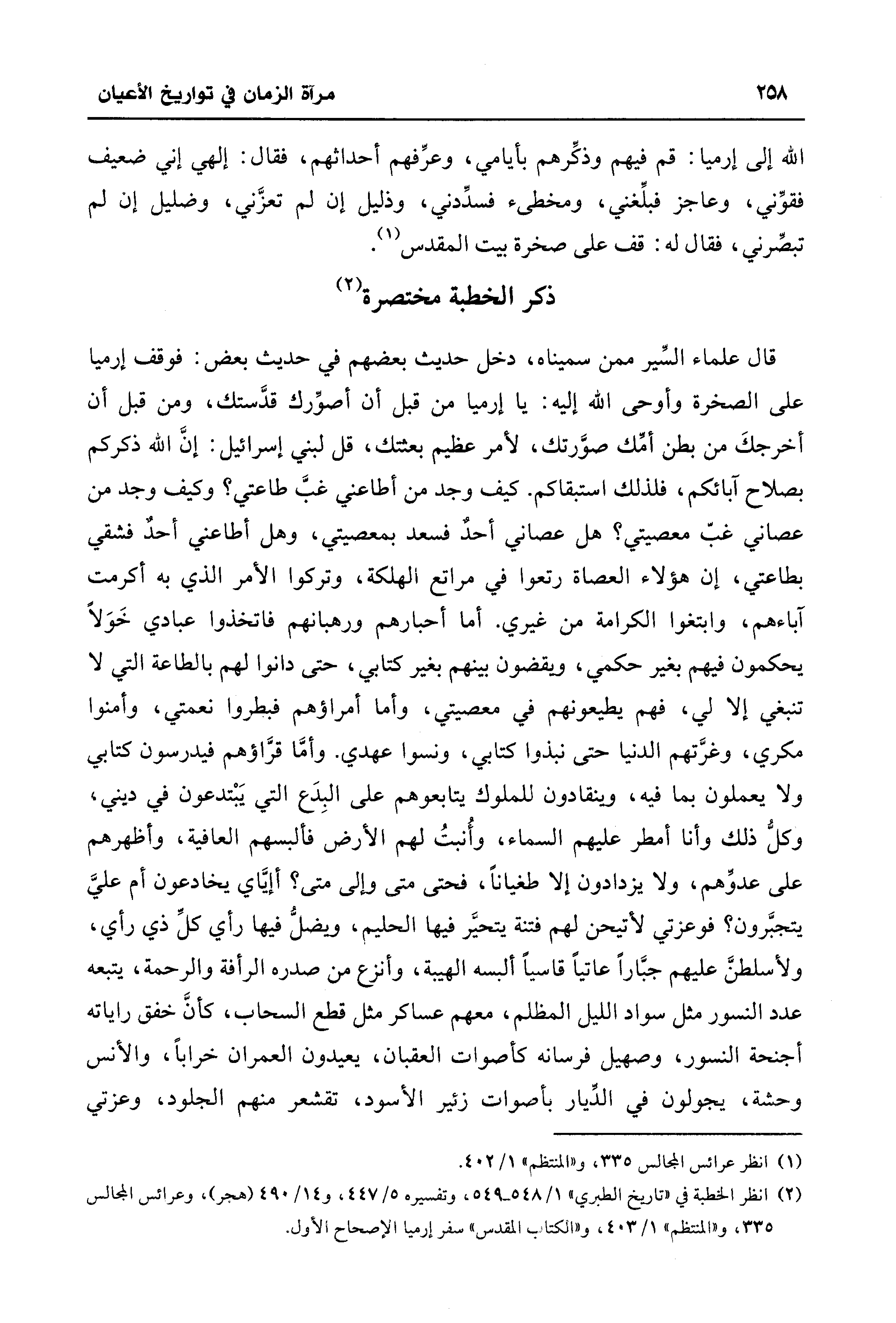 (¬2) انظر الخطبة في "تاريخ الطبري" 1/ 548 - 549، وتفسيره 5/ 447، و 14/ 490 (هجر)، وعرائس المجالس 335، و"المنتظم" 1/ 403، و"الكتاب المقدس" سفر إرميا الإصحاح الأول.
