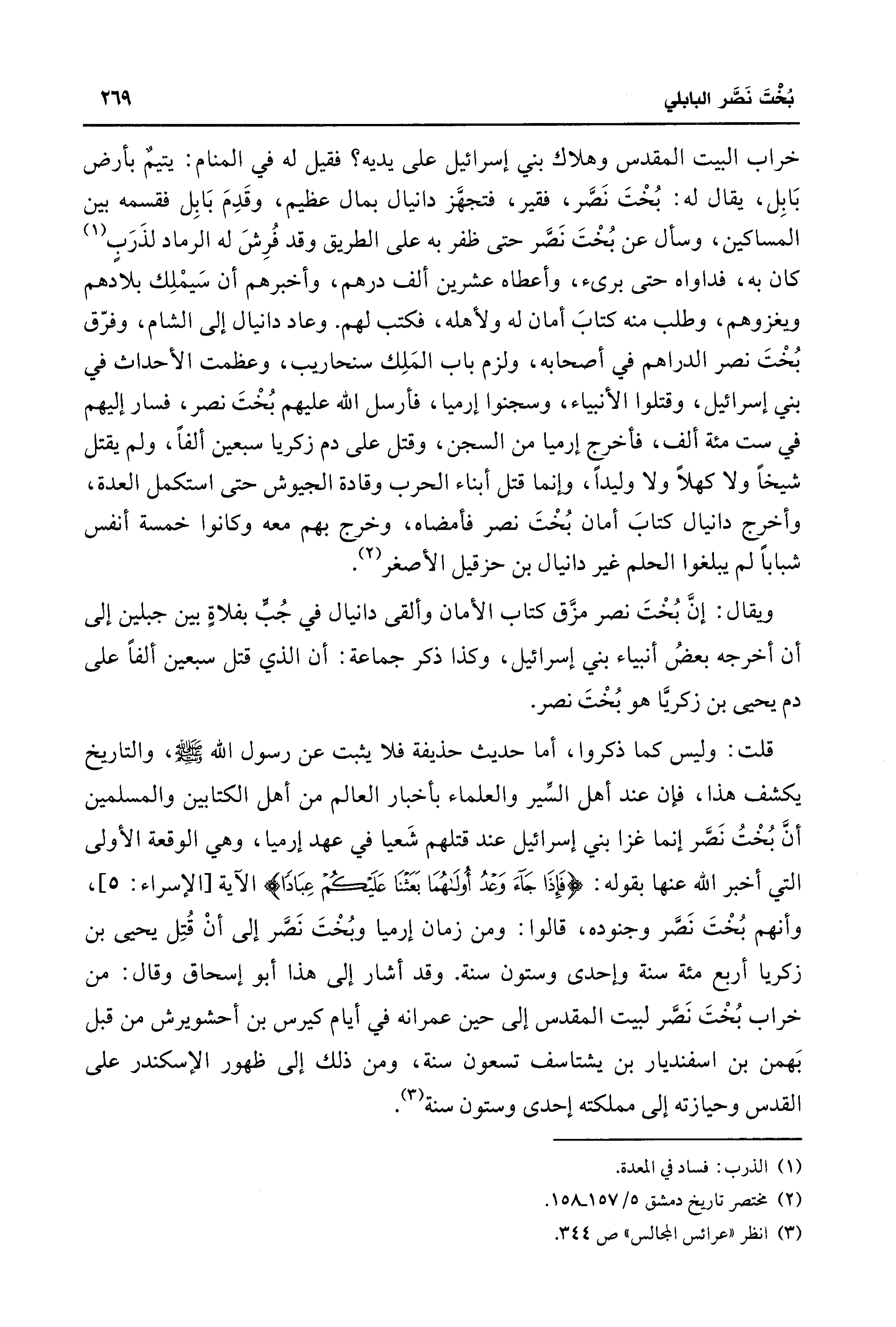 قلت: وليس كما ذكروا، أما حديث حذيفة فلا يثبت عن رسول الله - صلى الله عليه وسلم -، والتاريخ يكشف هذا، فإن عند أهل السِّير والعلماء بأخبار العالم من أهل الكتابين والمسلمين أنَّ بُخْتُ نَصَّر إنما غزا بني إسرائيل عند قتلهم شَعيا في عهد إرميا، وهي الوقعة الأولى التي أخبر الله عنها بقوله: {فَإِذَا جَاءَ وَعْدُ أُولَاهُمَا بَعَثْنَا عَلَيْكُمْ عِبَادًا} الآية [الإسراء: 5]، وأنهم بُخْتَ نَصر وجنوده، قالوا: ومن زمان إرميا وبُخْتَ نَصَّر إلى أنْ قُتِل يحيى بن زكريا أربع مئة سنة وإحدى وستون سنة. وقد أشار إلى هذا أبو إسحاق وقال: من خراب بُخْتَ نَصَّر لبيت المقدس إلى حين عمرانه في أيام كيرس بن أحشويرش من قبل بَهمن بن اسفنديار بن يشتاسف تسعون سنة، ومن ذلك إلى ظهور الإسكندر على القدس وحيازته إلى مملكته إحدى وستون سنة (¬3).
