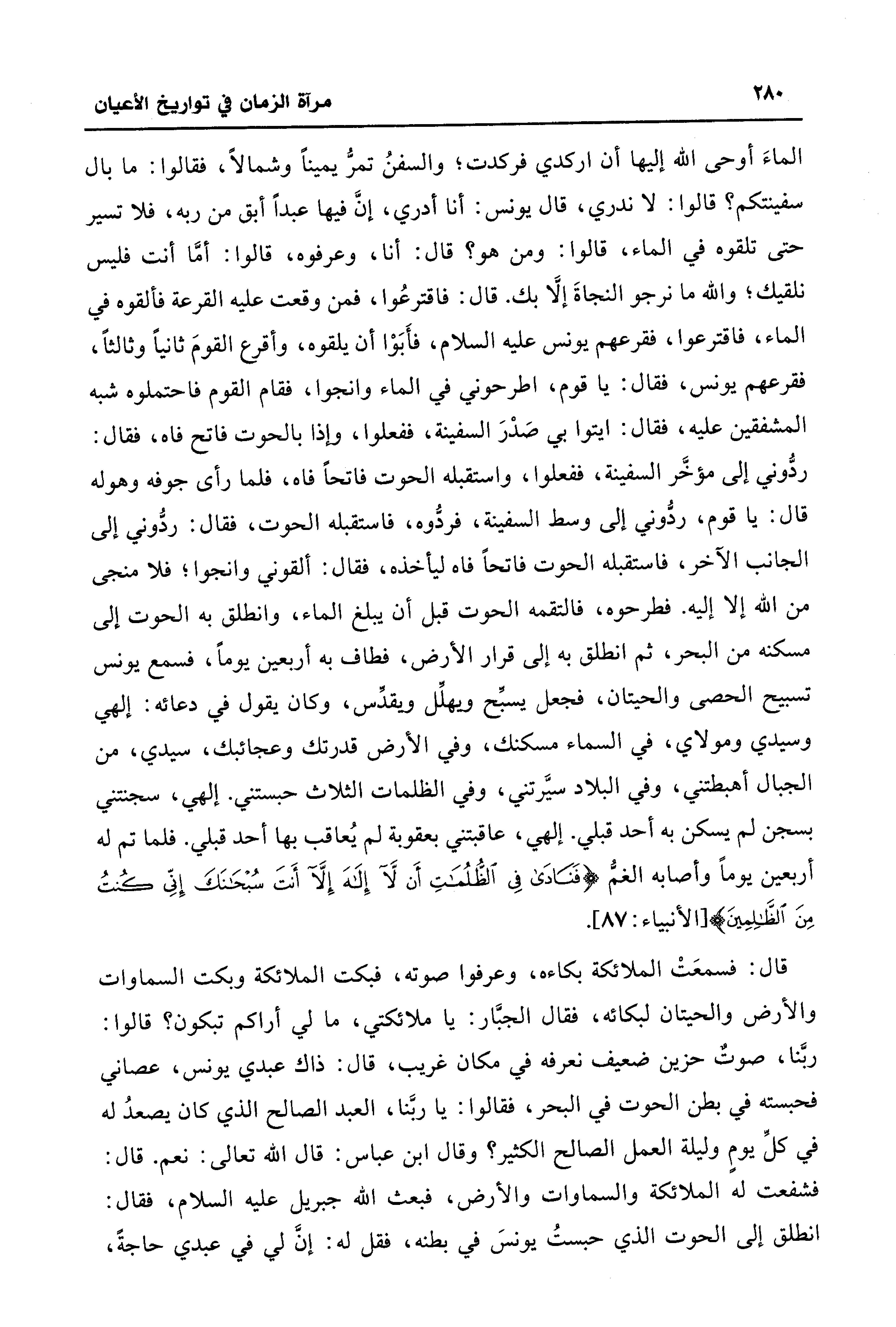 الماءَ أوحى الله إليها أن اركدي فركدت؛ والسفنُ تمرُّ يمينًا وشمالًا، فقالوا: ما بال سفينتكم؟ قالوا: لا ندري، قال يونس: أنا أدري، إنَّ فيها عبدًا أبق من ربه، فلا تسير حتى تلقوه في الماء، قالوا: ومن هو؟ قال: أنا، وعرفوه، قالوا: أمَّا أنت فليس نلقيك؛ والله ما نرجو النجاةَ إلَّا بك. قال: فاقترعُوا، فمن وقعت عليه القرعة فألقوه في الماء، فاقترعوا، فقرعهم يونس عليه السلام، فأَبَوْا أن يلقوه، وأقرع القومَ ثانيًا وثالثًا، فقرعهم يونس، فقال: يا قوم، اطرحوني في الماء وانجوا، فقام القوم فاحتملوه شبه المشفقين عليه، فقال: ايتوا بي صَدْرَ السفينة، ففعلوا، وإذا بالحوت فاتح فاه، فقال: ردُّوني إلى مؤخَّر السفينة، ففعلوا، واستقبله الحوت فاتحًا فاه، فلما رأى جوفه وهوله قال: يا قوم، ردُّوني إلى وسط السفينة، فردُّوه، فاستقبله الحوت، فقال: ردُّوني إلى الجانب الآخر، فاستقبله الحوت فاتحًا فاه ليأخذه، فقال: ألقوني وانجوا؛ فلا منجى من الله إلا إليه. فطرحوه، فالتقمه الحوت قبل أن يبلغ الماء، وانطلق به الحوت إلى مسكنه من البحر، ثم انطلق به إلى قرار الأرض، فطاف به أربعين يومًا، فسمع يونس تسبيح الحصى والحيتان، فجعل يسبِّح ويهلِّل ويقدِّس، وكان يقول في دعائه: إلهي وسيدي ومولاي، في السماء مسكنك، وفي الأرض قدرتك وعجائبك، سيدي، من الجبال أهبطتني، وفي البلاد سيَّرتني، وفي الظلمات الثلاث حبستني. إلهي، سجنتني بسجن لم يسكن به أحد قبلي. إلهي، عاقبتني بعقوبة لم يُعاقب بها أحد قبلي. فلما تم له أربعين يومًا وأصابه الغمُّ {فَنَادَى فِي الظُّلُمَاتِ أَنْ لَا إِلَهَ إِلَّا أَنْتَ سُبْحَانَكَ إِنِّي كُنْتُ مِنَ الظَّالِمِينَ} [الأنبياء: 87].