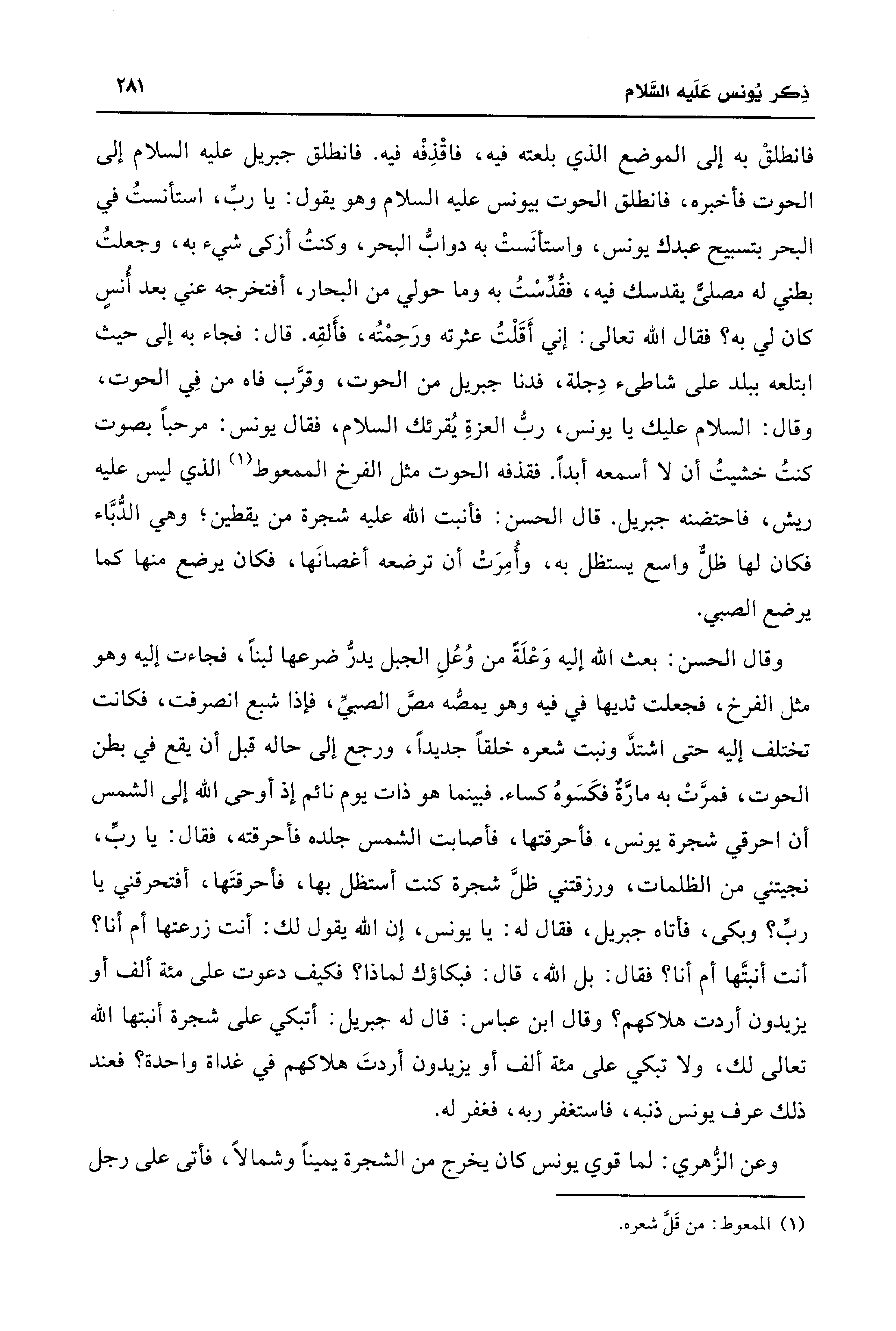 فانطلقْ به إلى الموضع الذي بلعته فيه، فاقْذِفْه فيه. فانطلق جبريل عليه السلام إلى الحوت فأخبره، فانطلق الحوت بيونس عليه السلام وهو يقول: يا ربِّ، استأنستُ في البحر بتسبيح عبدك يونس، واستأنَستْ به دوابُّ البحر، وكنتُ أزكى شيء به، وجعلتُ بطني له مصلىَّ يقدسك فيه، فقُدِّسْتُ به وما حولي من البحار، أفتخرجه عني بعد أُنسٍ كان لي به؟ فقال الله تعالى: إني أَقَلْتُ عثرته ورَحِمْتُه، فأَلقِه. قال: فجاء به إلى حيث ابتلعه ببلد على شاطئ دِجلة، فدنا جبريل من الحوت، وقرَّب فاه من فِي الحوت، وقال: السلام عليك يا يونس، ربُّ العزةِ يُقرئك السلام، فقال يونس: مرحبًا بصوت كنتُ خشيتُ أن لا أسمعه أبدًا. فقذفه الحوت مثل الفرخ الممعوط (¬1) الذي ليس عليه ريش، فاحتضنه جبريل. قال الحسن: فأنبت الله عليه شجرة من يقطين؛ وهي الدُّبَّاء فكان لها ظلٌّ واسع يستظل به، وأُمِرَتْ أن ترضعه أغصانَها، فكان يرضع منها كما يرضع الصبي.