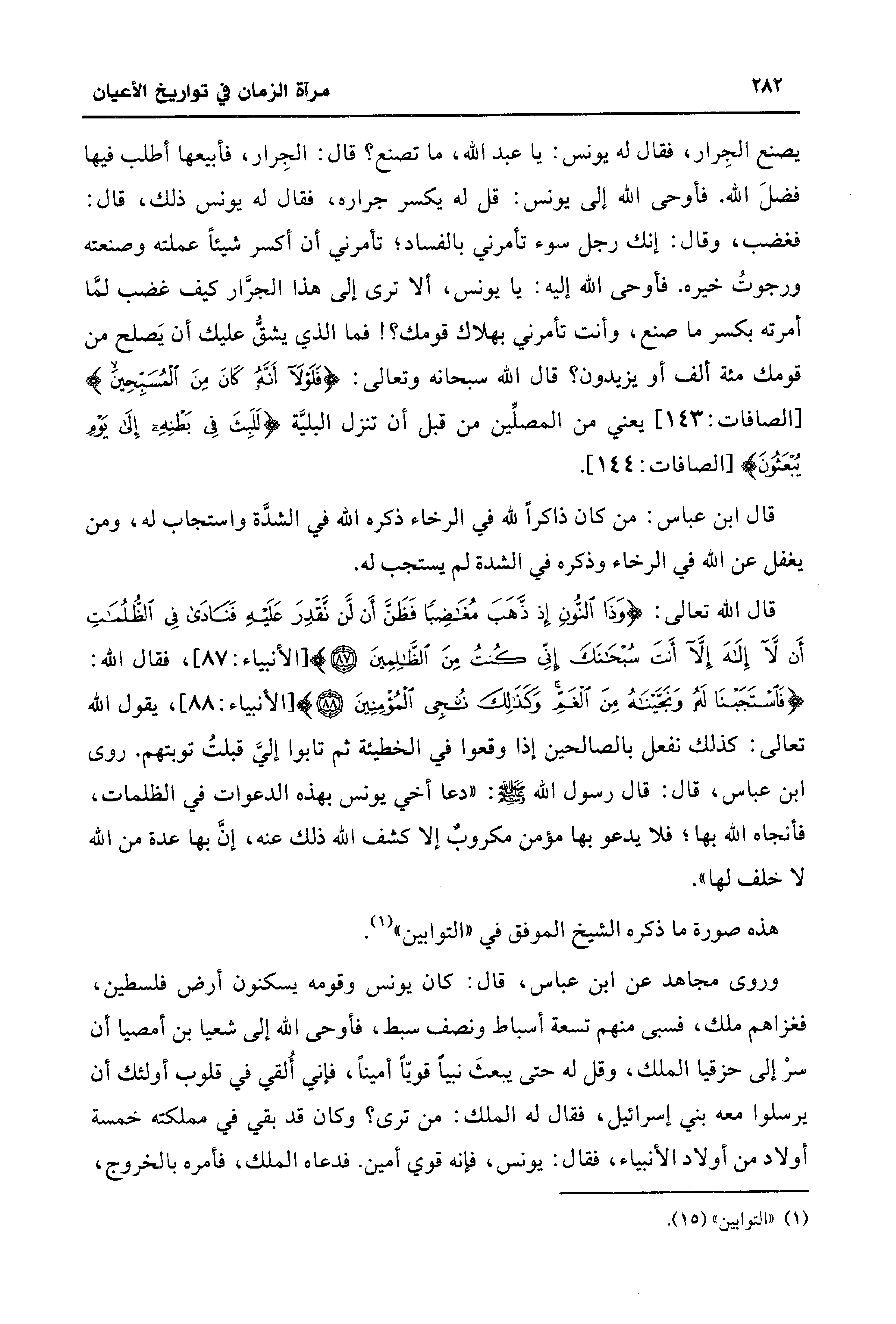 يصنع الجِوار، فقال له يونس: يا عبد الله، ما تصنع؟ قال: الجِرار، فأبيعها أطلب فيها فضلَ الله. فأوحى الله إلى يونس: قل له يكسر جراره، فقال له يونس ذلك، قال: فغضب، وقال: إنك رجل سوء تأمرني بالفساد؛ تأمرني أن أكسر شيئًا عملته وصنعته ورجوتُ خيره. فأوحى الله إليه: يا يونس، ألا ترى إلى هذا الجرَّار كيف غضب لمَّا أمرته بكسر ما صنع، وأنت تأمرني بهلاك قومك؟ ! فما الذي يشقُّ عليك أن يَصلح من قومك مئة ألف أو يزيدون؟ قال الله سبحانه وتعالى: {فَلَوْلَا أَنَّهُ كَانَ مِنَ الْمُسَبِّحِينَ} [الصافات: 143] يعني من المصلِّين من قبل أن تنزل البليَّة {لَلَبِثَ فِي بَطْنِهِ إِلَى يَوْمِ يُبْعَثُونَ} [الصافات: 144].