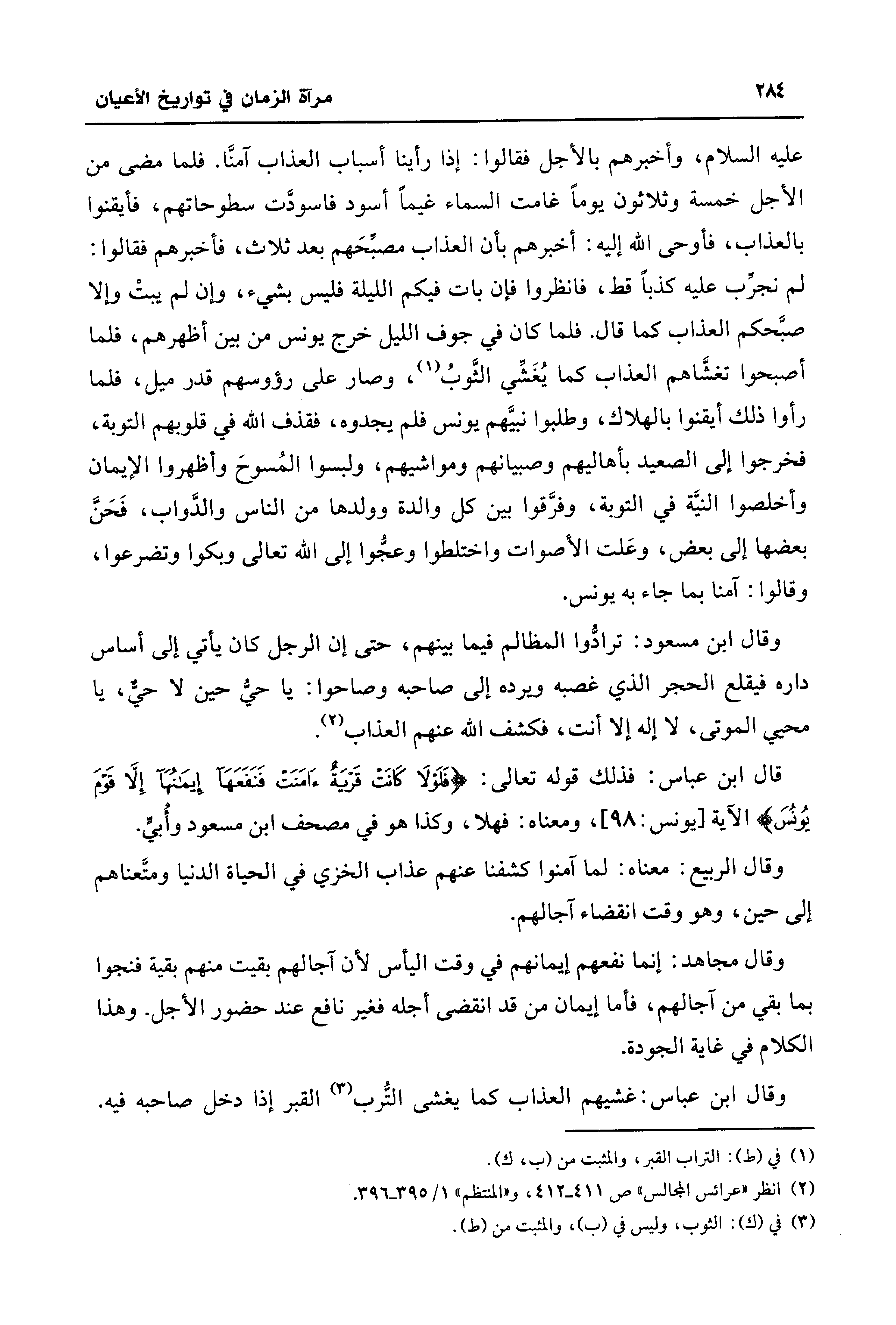عليه السلام، وأخبرهم بالأجل فقالوا: إذا رأينا أسباب العذاب آمنَّا. فلما مضى من الأجل خمسة وثلاثون يومًا غامت السماء غيمًا أسود فاسودَّت سطوحاتهم، فأيقنوا بالعذاب، فأوحى الله إليه: أخبرهم بأن العذاب مصبِّحَهم بعد ثلاث، فأخبرهم فقالوا: لم نجرِّب عليه كذبًا قط، فانظروا فإن بات فيكم الليلة فليس بشيء، وإن لم يبتْ وإلا صبَّحكم العذاب كما قال. فلما كان في جوف الليل خرج يونس من بين أظهرهم، فلما أصبحوا تغشَّاهم العذاب كما يُغَشِّي الثَّوبُ (¬1)، وصار على رؤوسهم قدر ميل، فلما رأوا ذلك أيقنوا بالهلاك، وطلبوا نبيَّهم يونس فلم يجدوه، فقذف الله في قلوبهم التوبة، فخرجوا إلى الصعيد بأهاليهم وصبيانهم ومواشيهم، ولبسوا المُسوحَ وأظهروا الإيمان وأخلصوا النيَّة في التوبة، وفرَّقوا بين كل والدة وولدها من الناس والدَّواب، فَحَنَّ بعضها إلى بعض، وعَلت الأصوات واختلطوا وعجُّوا إلى الله تعالى وبكوا وتضرعوا، وقالوا: آمنا بما جاء به يونس.