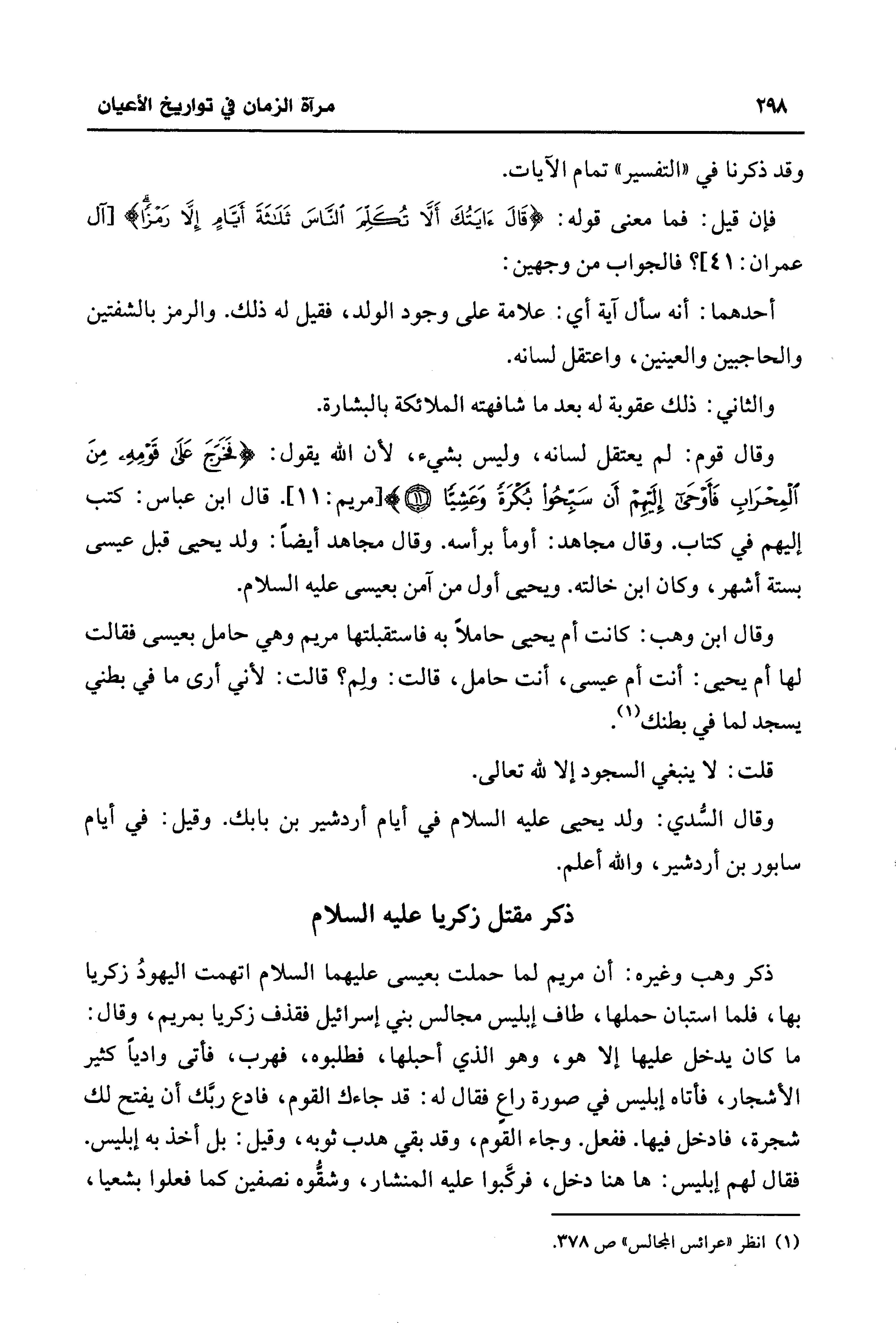 وقال قوم: لم يعتقل لسانه، وليس بشيء، لأن الله يقول: {فَخَرَجَ عَلَى قَوْمِهِ مِنَ الْمِحْرَابِ فَأَوْحَى إِلَيْهِمْ أَنْ سَبِّحُوا بُكْرَةً وَعَشِيًّا (11)} [مريم: 11]. قال ابن عباس: كتب إليهم في كتاب. وقال مجاهد: أومأ برأسه. وقال مجاهد أيضًا: ولد يحيى قبل عيسى بستة أشهر، وكان ابن خالته. ويحيى أول من آمن بعيسى عليه السلام.