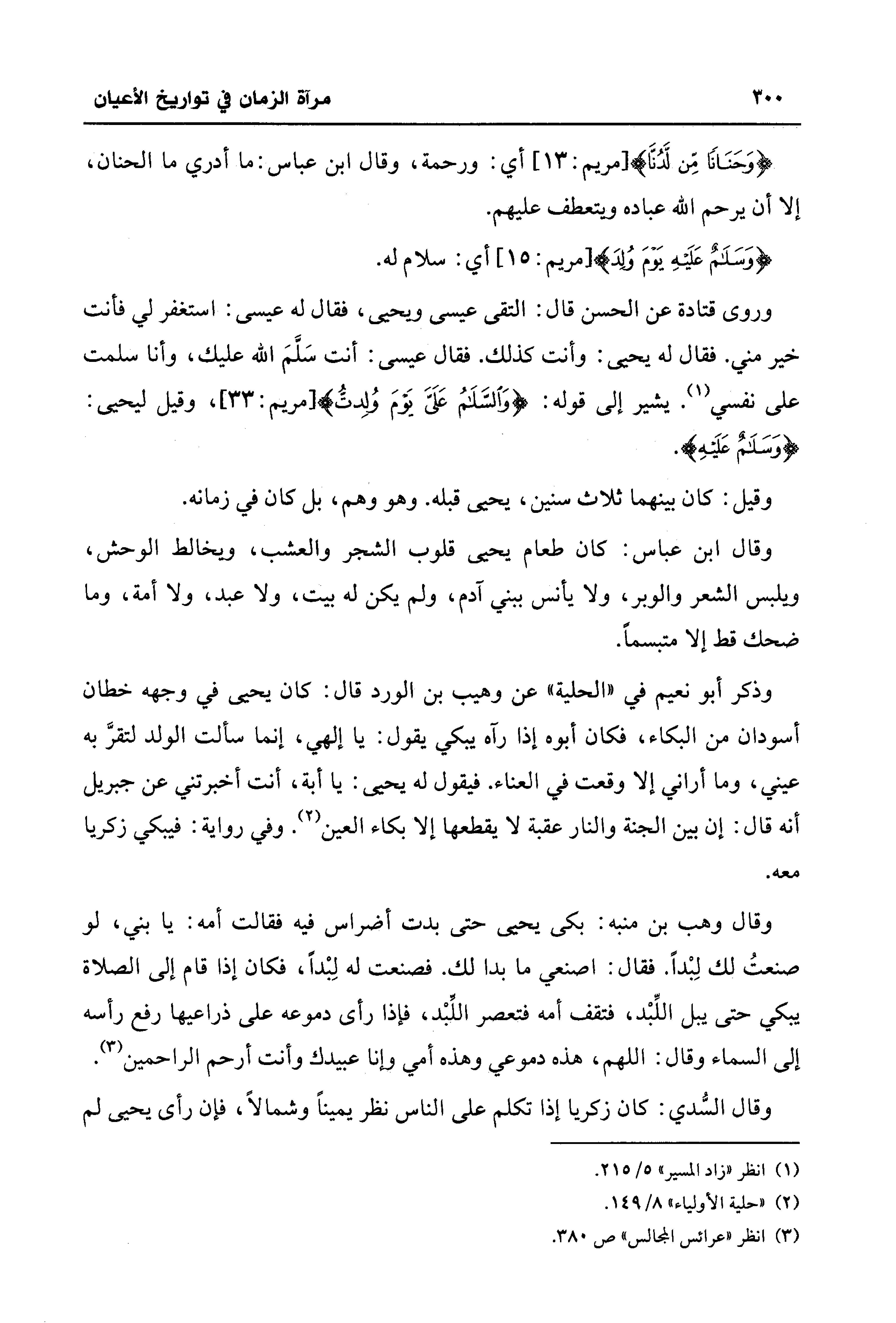 وذكر أبو نعيم في "الحلية" عن وهيب بن الورد قال: كان يحيى في وجهه خطان أسودان من البكاء، فكان أبوه إذا رآه يبكي يقول: يا إلهي، إنما سألت الولد لتقرَّ به عيني، وما أراني إلا وقعت في العناء. فيقول له يحيى: يا أبة، أنت أخبرتني عن جبريل أنه قال: إن بين الجنة والنار عقبة لا يقطعها إلا بكاء العين (¬2). وفي رواية: فيبكي زكريا معه.