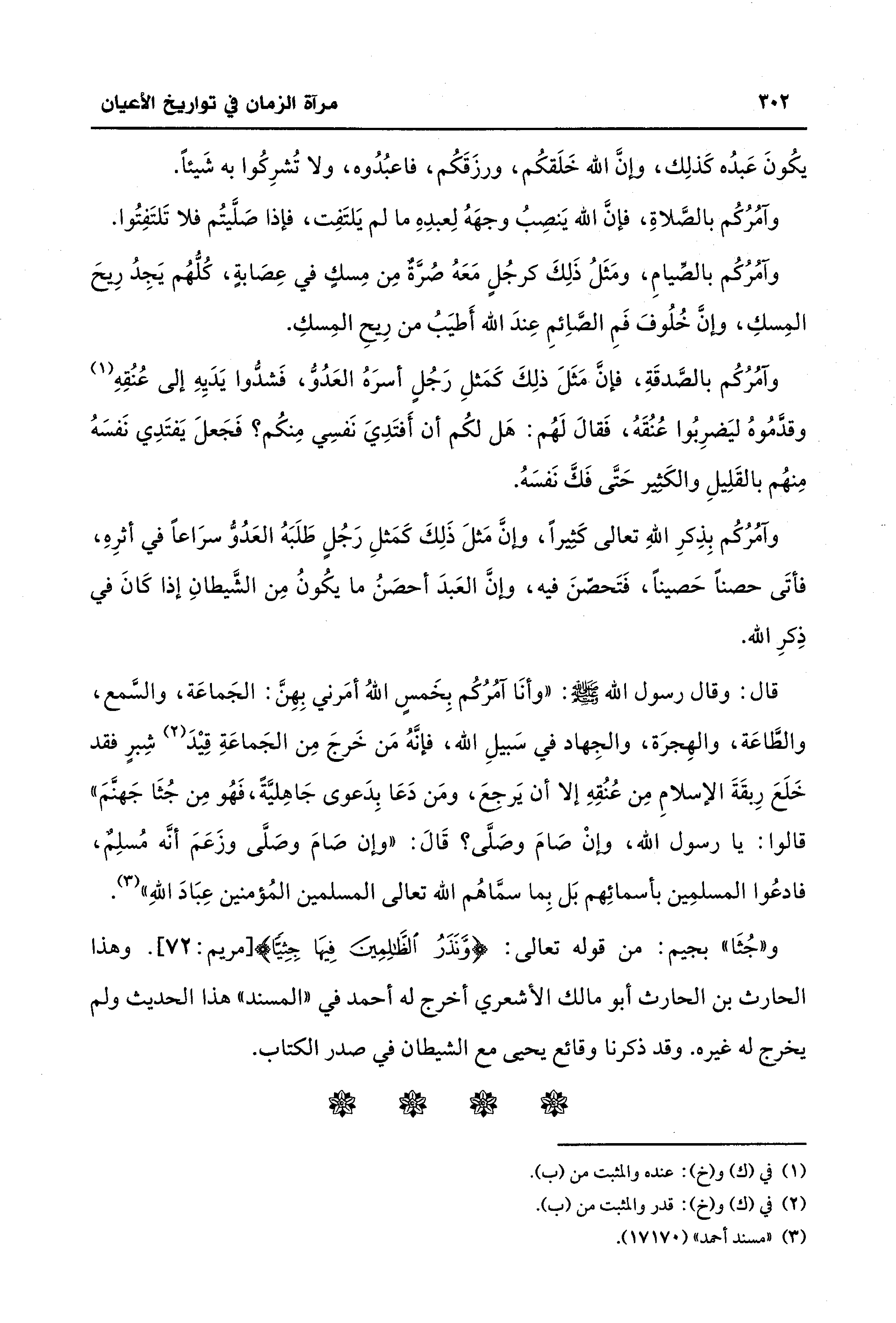قال: وقال رسول الله - صلى الله عليه وسلم -: "وأنَا آمُرُكُم بِخَمسٍ اللهُ أمَرني بِهِنَّ: الجَماعَة، والسَّمع، والطَّاعَة، والهِجرَة، والجِهاد في سَبيلِ الله، فإنَّهُ مَن خَرجَ مِن الجَماعَةِ قِيْدَ (¬2) شِبرٍ فقد خَلَعَ رِبقَةَ الإسلامِ مِن عُنُقِهِ إلا أن يَرجعَ، ومَن دَعَا بِدَعوى جَاهِليَّةً، فَهُو مِن جُثَا جَهنَّمَ" قالوا: يا رسول الله، وإنْ صَامَ وصَلَّى؟ قَالَ: "وإن صَامَ وصَلَّى وزَعَمَ أنَّه مُسلِمٌ، فادعُوا المسلمِين بأسمائِهم بَل بِما سمَّاهُم الله تعالى المسلمين المُؤمنين عِبَادَ اللهِ" (¬3).