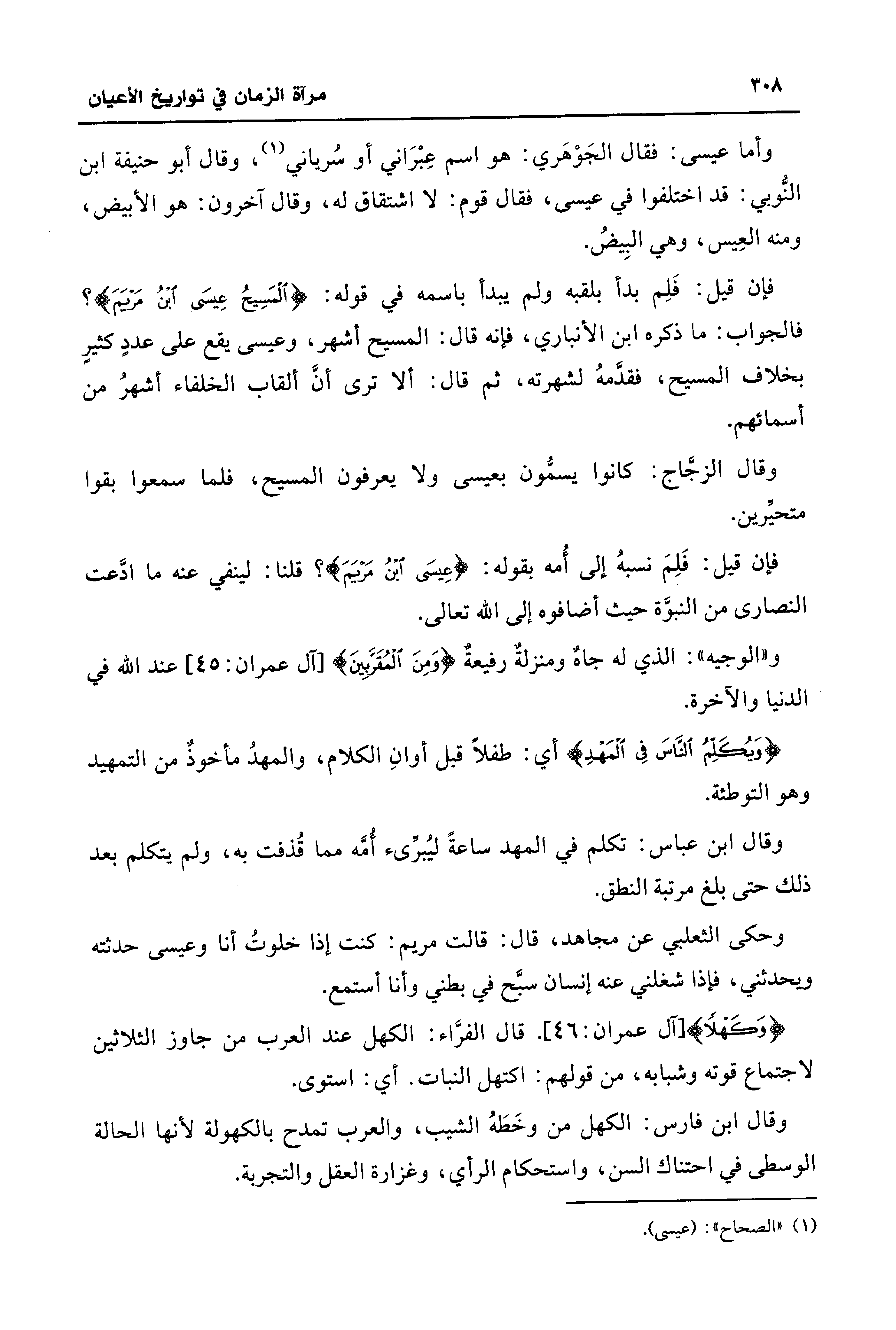 وقال ابن عباس: تكلم في المهد ساعةً ليُبرِّئ أُمَّه مما قُذفت به، ولم يتكلم بعد ذلك حتى بلغ مرتبة النطق.