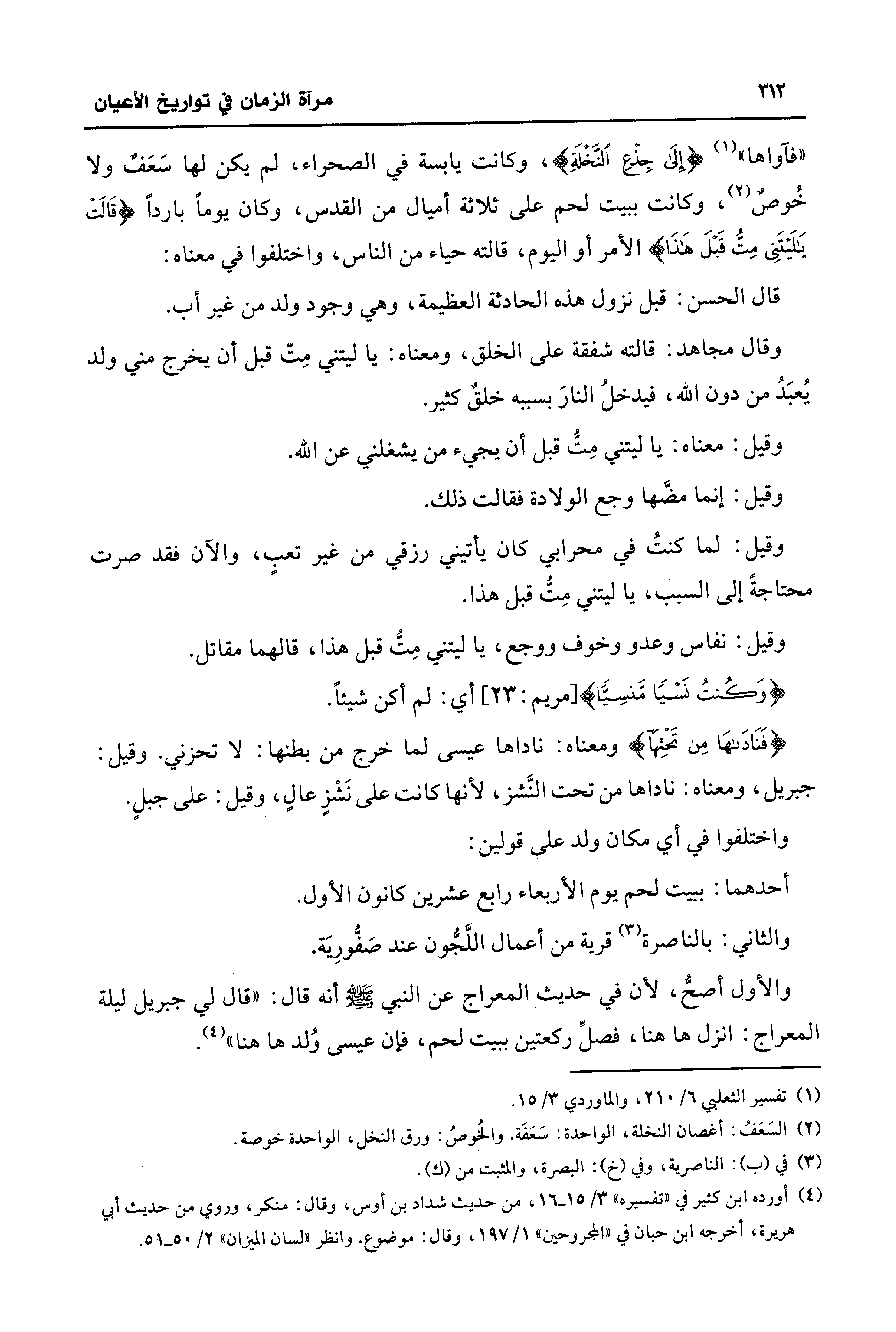 "فآواها" (¬1) {إِلَى جِذْعِ النَّخْلَةِ}، وكانت يابسة في الصحراء، لم يكن لها سَعَفٌ ولا خُوصٌ (¬2)، وكانت ببيت لحم على ثلاثة أميال من القدس، وكان يومًا باردًا {قَالَتْ يَالَيْتَنِي مِتُّ قَبْلَ هَذَا} الأمر أو اليوم، قالته حياء من الناس، واختلفوا في معناه: