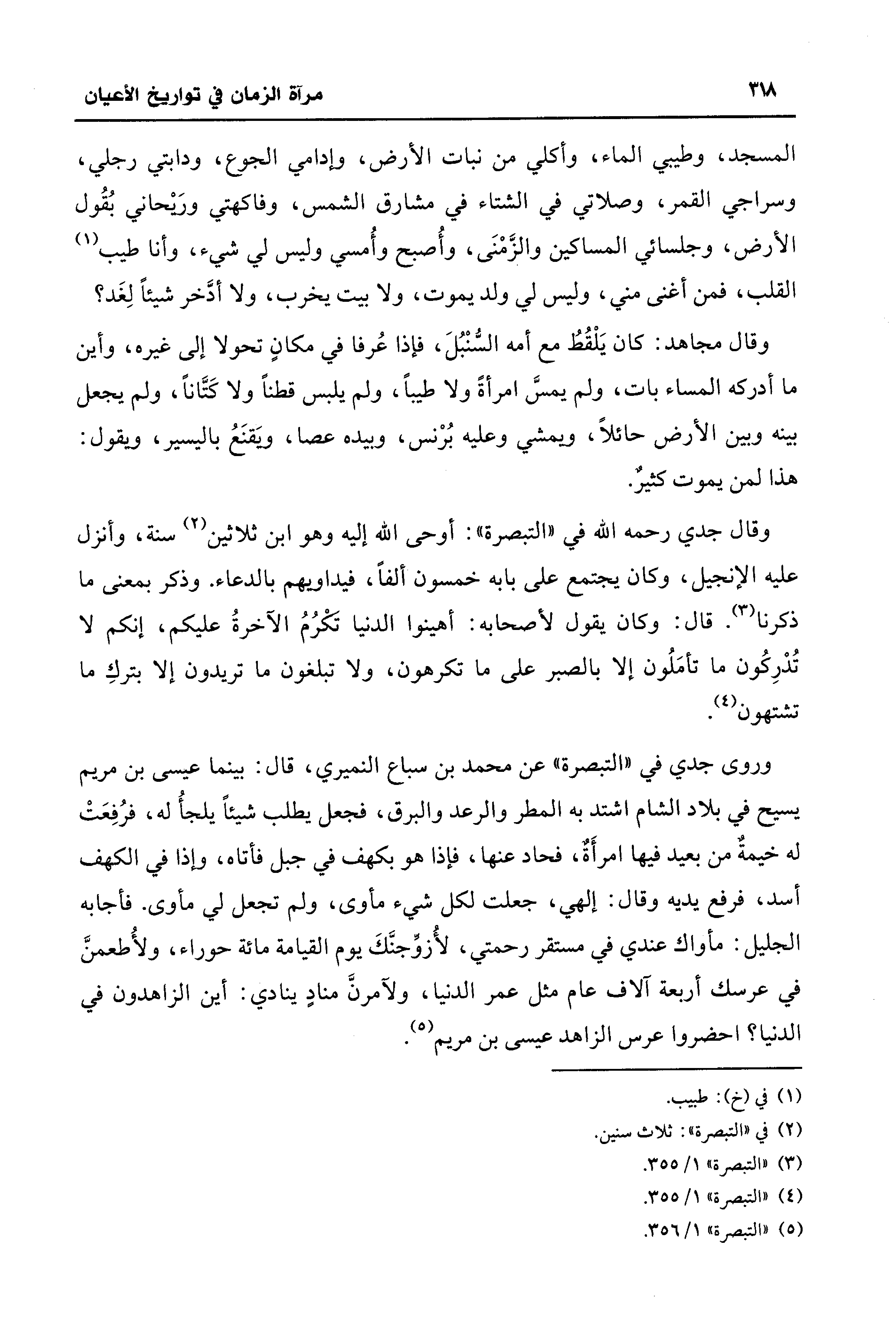 وروى جدي في "التبصرة" عن محمد بن سباع النميري، قال: بينما عيسى بن مريم يسيح في بلاد الشام اشتد به المطر والرعد والبرق، فجعل يطلب شيئًا يلجأُ له، فرُفِعَتْ له خيمةٌ من بعيد فيها امرأَةٌ، فحاد عنها، فإذا هو بكهف في جبل فأتاه، وإذا في الكهف أسد، فرفع يديه وقال: إلهي، جعلت لكل شيء مأوى، ولم تجعل لي مأوى. فأجابه الجليل: مأواك عندي في مستقر رحمتي، لأُزوِّجنَّكَ يوم القيامة مائة حوراء، ولأُطعمنَّ في عرسك أربعة آلاف عام مثل عمر الدنيا، ولآمرنَّ منادٍ ينادي: أين الزاهدون في الدنيا؟ احضروا عرس الزاهد عيسى بن مريم (¬5).