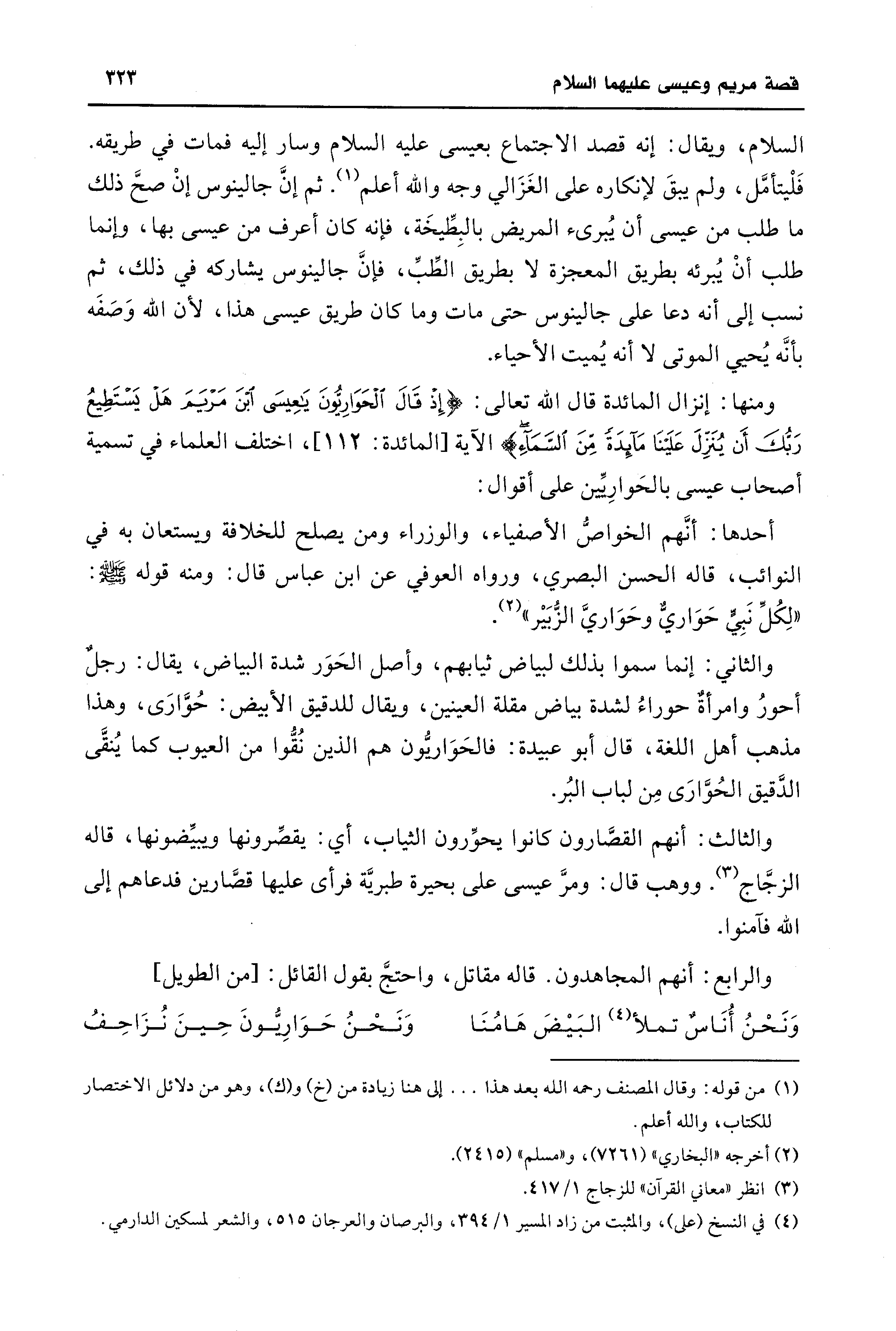 والثاني: إنما سموا بذلك لبياض ثيابهم، وأصل الحَوَر شدة البياض، يقال: رجلٌ أحورُ وامرأةٌ حوراءُ لشدة بياض مقلة العينين، ويقال للدقيق الأبيض: حُوَّارَى، وهذا مذهب أهل اللغة، قال أبو عبيدة: فالحَوَاريُّون هم الذين نُقُّوا من العيوب كما يُنقَّى الدَّقيق الحُوَّارَى مِن لباب البُر.