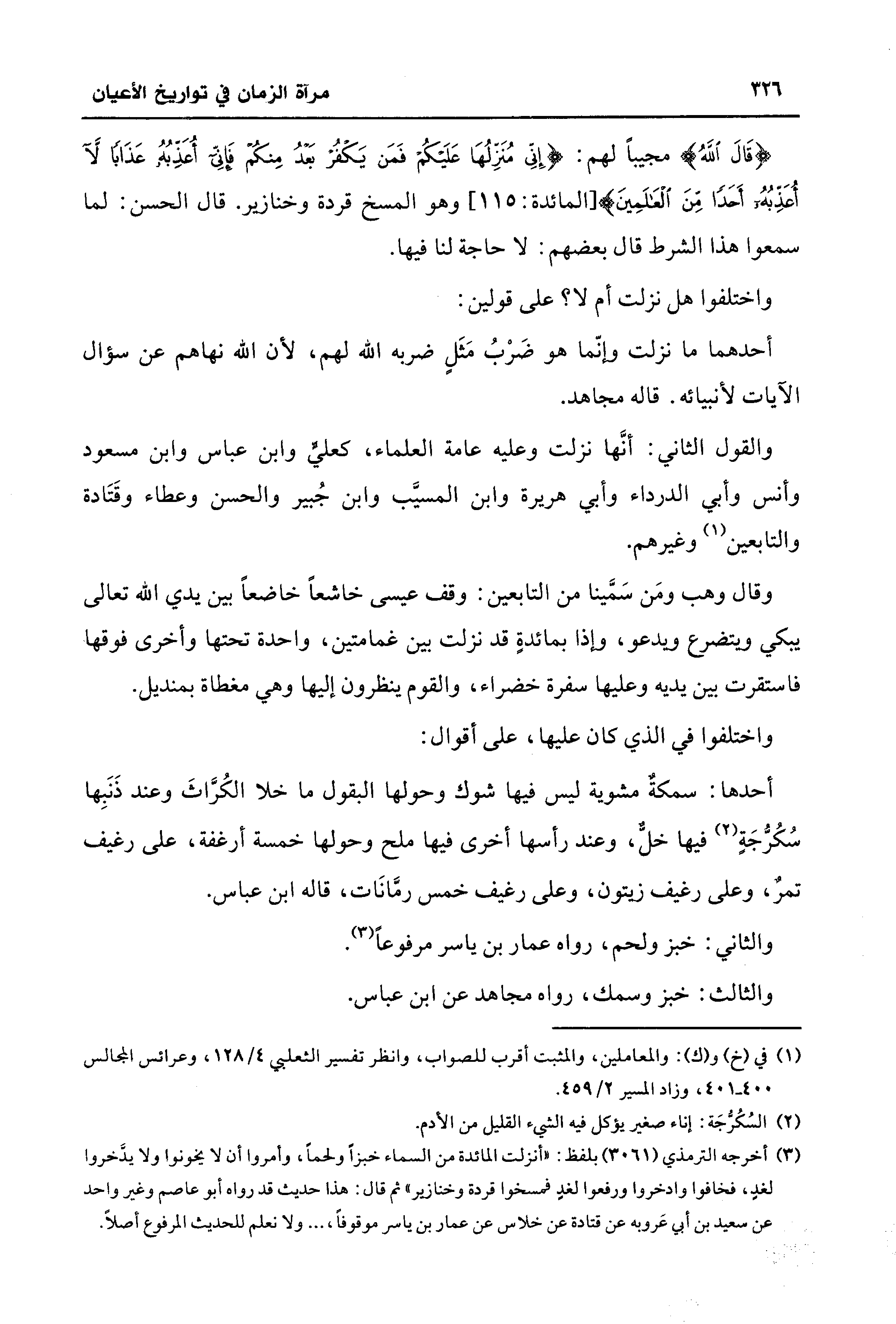 (¬3) أخرجه الترمذي (3061) بلفظ: "أنزلت المائدة من السماء خبزًا ولحمًا، وأمروا أن لا يخونوا ولا يدَّخروا لغدٍ، فخافوا وادخروا ورفعوا لغدٍ فمسخوا قردة وخنازير" ثم قال: هذا حديث قد رواه أبو عاصم وغير واحد عن سعيد بن أبي عَروبة عن قتادة عن خلاس عن عمار بن ياسر موقوفًا، . . . ولا نعلم للحديث المرفوع أصلًا.