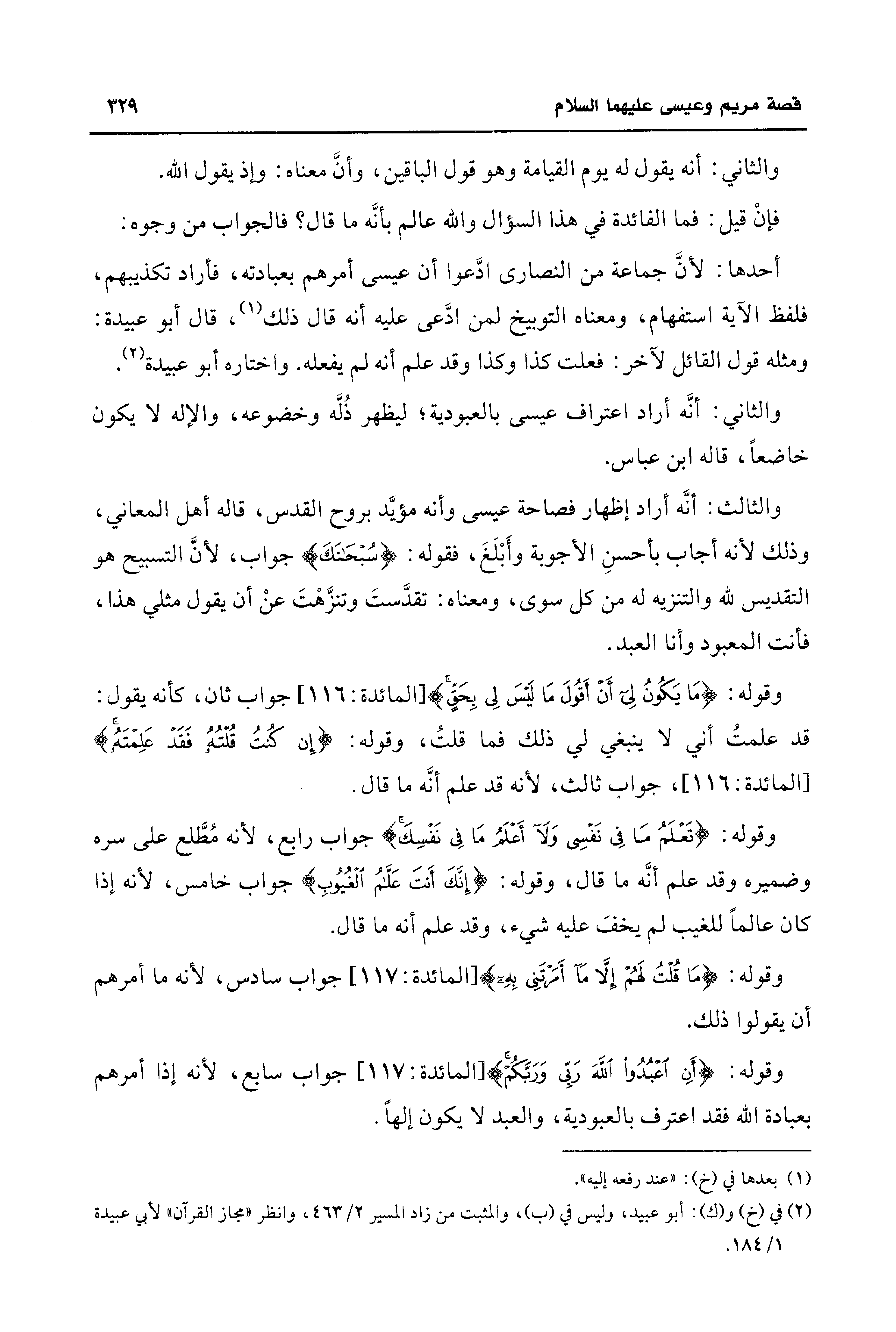 وقوله: {أَنِ اعْبُدُوا اللَّهَ رَبِّي وَرَبَّكُمْ} [المائدة: 117] جواب سابع، لأنه إذا أمرهم بعبادة الله فقد اعترف بالعبودية، والعبد لا يكون إلهًا.