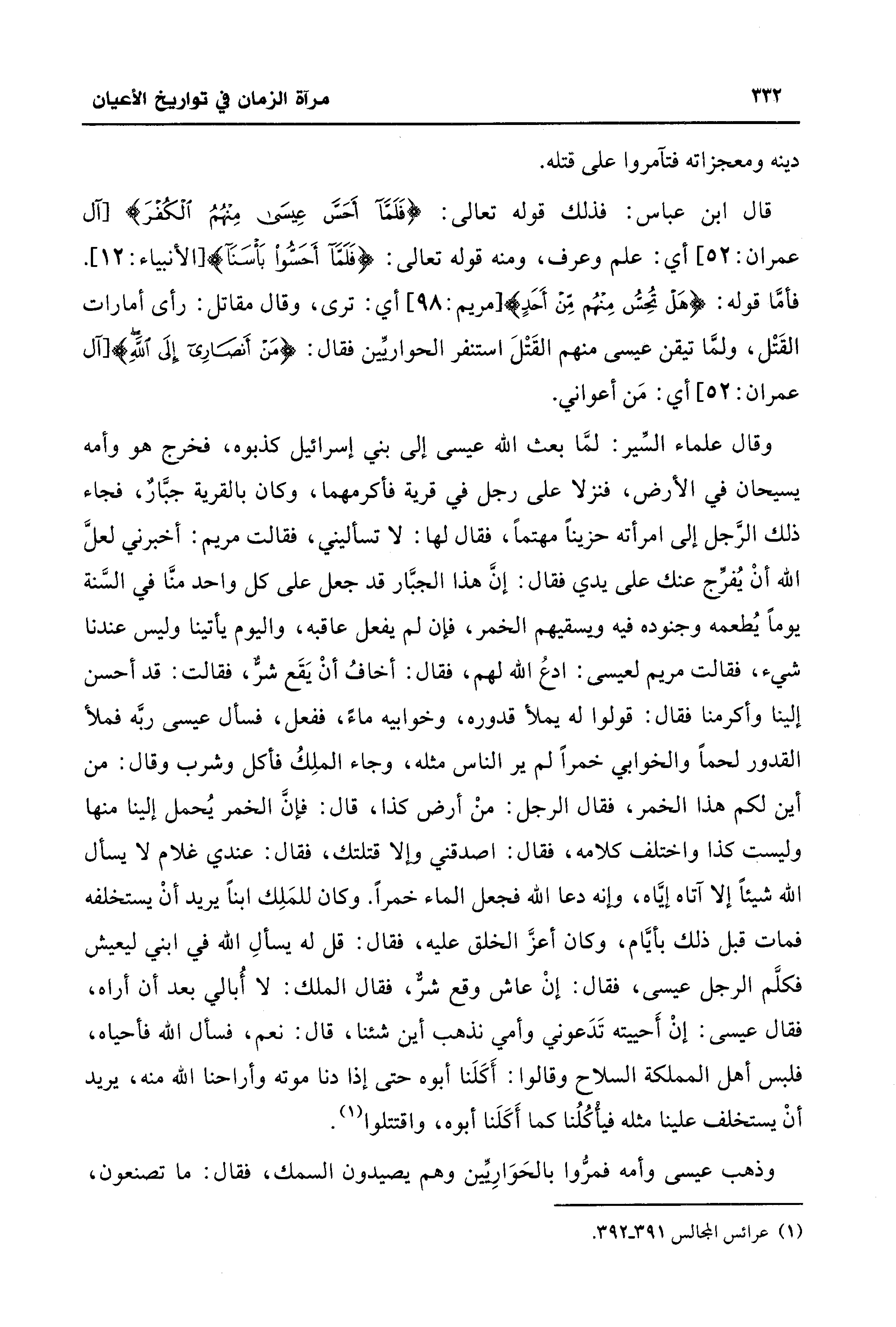 وقال علماء السِّير: لمَّا بعث الله عيسى إلى بني إسرائيل كذبوه، فخرج هو وأمه يسيحان في الأرض، فنزلا على رجل في قرية فأكرمهما، وكان بالقرية جبَّارٌ، فجاء ذلك الرَّجل إلى امرأته حزينًا مهتمًا، فقال لها: لا تسأليني، فقالت مريم: أخبرني لعلَّ الله أنْ يُفرِّج عنك على يدي فقال: إنَّ هذا الجبَّار قد جعل على كل واحد منَّا في السَّنة يومًا يُطعمه وجنوده فيه ويسقيهم الخمر، فإن لم يفعل عاقبه، واليوم يأتينا وليس عندنا شيء، فقالت مريم لعيسى: ادعُ الله لهم، فقال: أخافُ أنْ يَقَع شرٌّ، فقالت: قد أحسن إلينا وأكرمنا فقال: قولوا له يملأ قدوره، وخوابيه ماءً، ففعل، فسأل عيسى ربَّه فملأ القدور لحمًا والخوابي خمرًا لم ير الناس مثله، وجاء الملِكُ فأكل وشرب وقال: من أين لكم هذا الخمر، فقال الرجل: منْ أرض كذا، قال: فإنَّ الخمر يُحمل إلينا منها وليست كذا واختلف كلامه، فقال: اصدقني وإلا قتلتك، فقال: عندي غلام لا يسأل الله شيئًا إلا آتاه إيَّاه، وإنه دعا الله فجعل الماء خمرًا. وكان للمَلِك ابنًا يريد أنْ يستخلفه فمات قبل ذلك بأيَّام، وكان أعزَّ الخلق عليه، فقال: قل له يسألِ الله في ابني ليعيش فكلَّم الرجل عيسى، فقال: إنْ عاش وقع شرٌّ، فقال الملك: لا أُبالي بعد أن أراه، فقال عيسى: إنْ أَحييته تَدَعوني وأمي نذهب أين شئنا، قال: نعم، فسأل الله فأحياه، فلبس أهل المملكة السلاح وقالوا: أَكَلَنا أبوه حتى إذا دنا موته وأراحنا الله منه، يريد أنْ يستخلف علينا مثله فيأْكُلُنا كما أَكَلَنا أبوه، واقتتلوا (¬1).