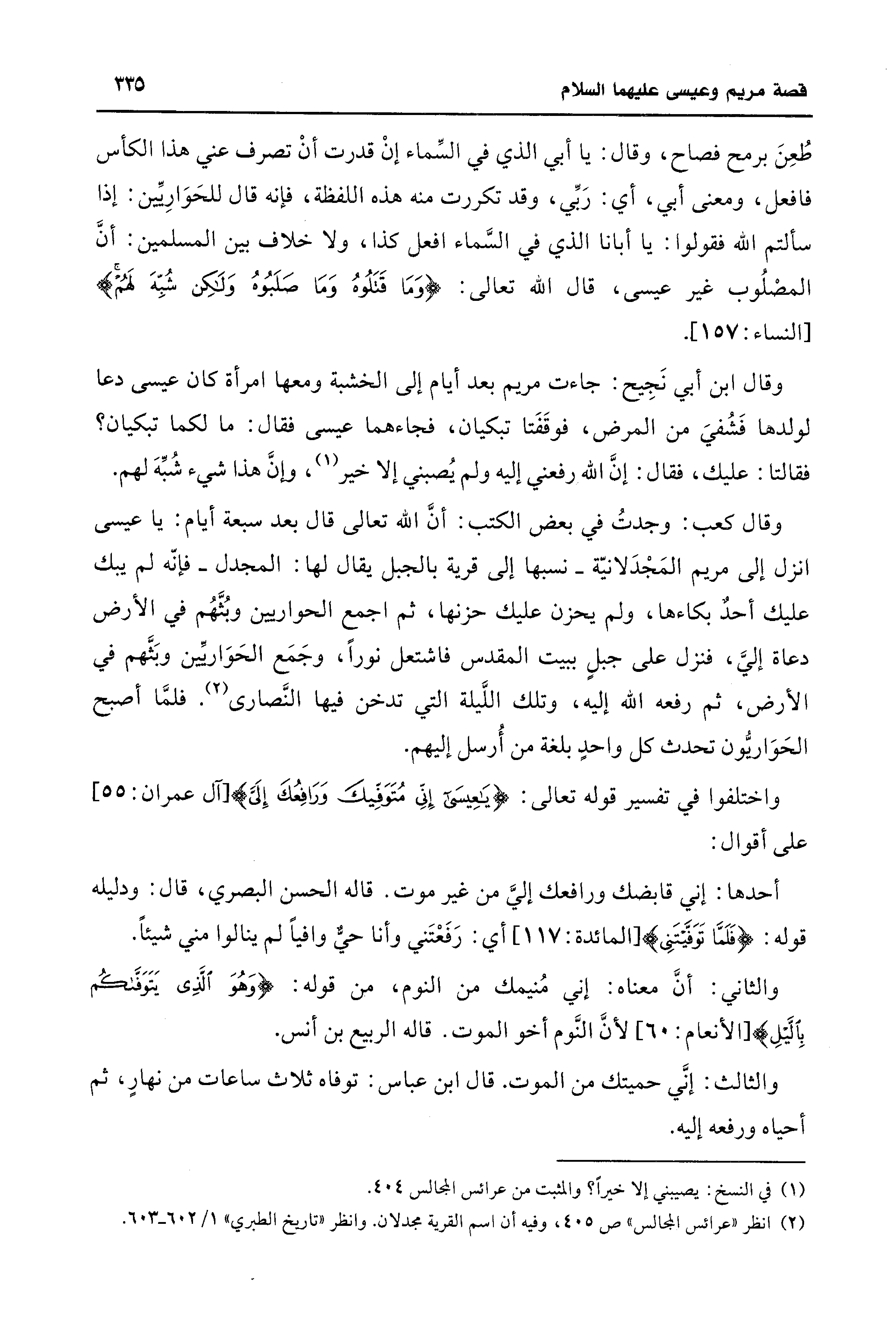 وقال ابن أبي نَجِيح: جاءت مريم بعد أيام إلى الخشبة ومعها امرأة كان عيسى دعا لولدها فَشُفيَ من المرض، فوقَفَتا تبكيان، فجاءهما عيسى فقال: ما لكما تبكيان؟ فقالتا: عليك، فقال: إنَّ الله رفعني إليه ولم يُصبني إلا خير (¬1)، وإنَّ هذا شيء شُبِّهَ لهم.