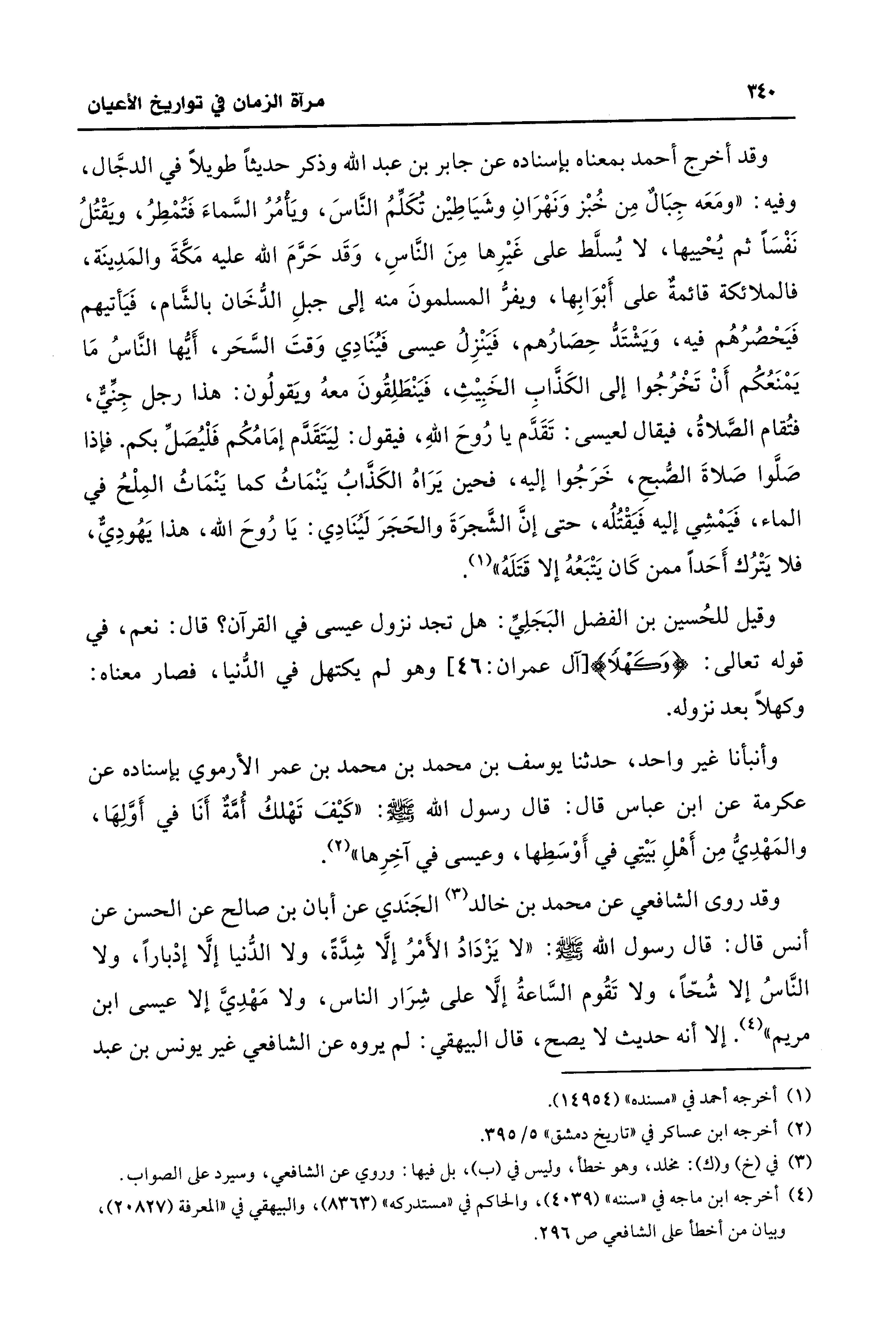 وقد أخرج أحمد بمعناه بإسناده عن جابر بن عبد الله وذكر حديثًا طويلًا في الدجَّال، وفيه: "ومَعَه جِبَالٌ مِن خُبْز وَنَهْرَانِ وشَيَاطِيْن تُكَلِّمُ النَّاسَ، ويَأْمُرُ السَّماءَ فَتُمْطِرُ، ويَقْتُلُ نَفْسًا ثم يُحْييها، لا يُسلَّط على غَيْرِها مِنَ النَّاسِ، وَقَد حَرَّمَ الله عليه مَكَّةَ والمَدِينَة، فالملائكة قائمةٌ على أَبْوَابِها، ويفرُّ المسلمونَ منه إلى جبلِ الدُّخَان بالشَّام، فَيَأتيهم فَيَحْصُرُهُم فيه، وَيَشْتَدُّ حِصَارُهم، فَيَنْزِلُ عيسى فَيُنَادِي وَقتَ السَّحَر، أَيُّها النَّاسُ مَا يَمْنَعُكُم أَنْ تَخْرُجُوا إلى الكَذَّابِ الخَبِيْثِ، فَيَنْطَلِقُونَ معهُ ويَقولُون: هذا رجل جِنِّيٌّ، فتُقام الصَّلاةُ، فيقال لعيسى: تَقَدَّم يا رُوحَ اللهِ، فيقول: ليَتَقَدَّم إمَامُكُم فَلْيُصَلِّ بكم. فإذا صَلَّوا صَلاةَ الصُّبحِ، خَرَجُوا إليه، فحين يَرَاهُ الكَذَّابُ يَنْمَاثُ كما يَنْمَاثُ المِلْحُ في الماء، فَيَمْشِي إليه فَيَقْتُلُه، حتى إنَّ الشَّجرَةَ والحَجَرَ لَيُنَادِي: يَا رُوحَ الله، هذا يَهُودِيٌّ، فلا يَتْرُك أَحَدًا ممن كَان يَتْبَعُهُ إلا قَتَلَهُ" (¬1).