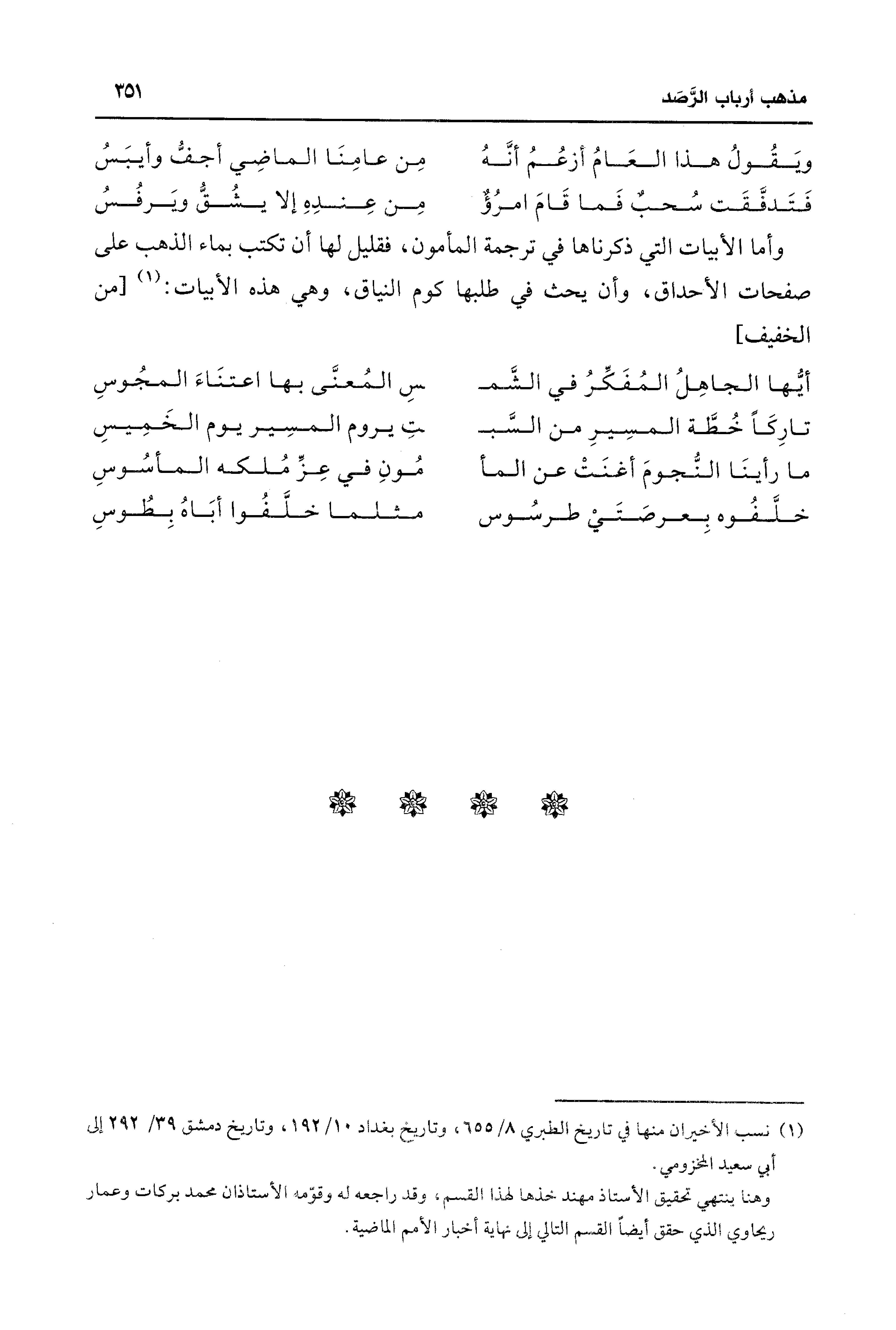 (¬1) نسب الأخيران منها في تاريخ الطبري 8/ 655، وتاريخ بغداد 10/ 192، وتاريخ دمشق 39/ 292 إلى أبي سعيد المخزومي.