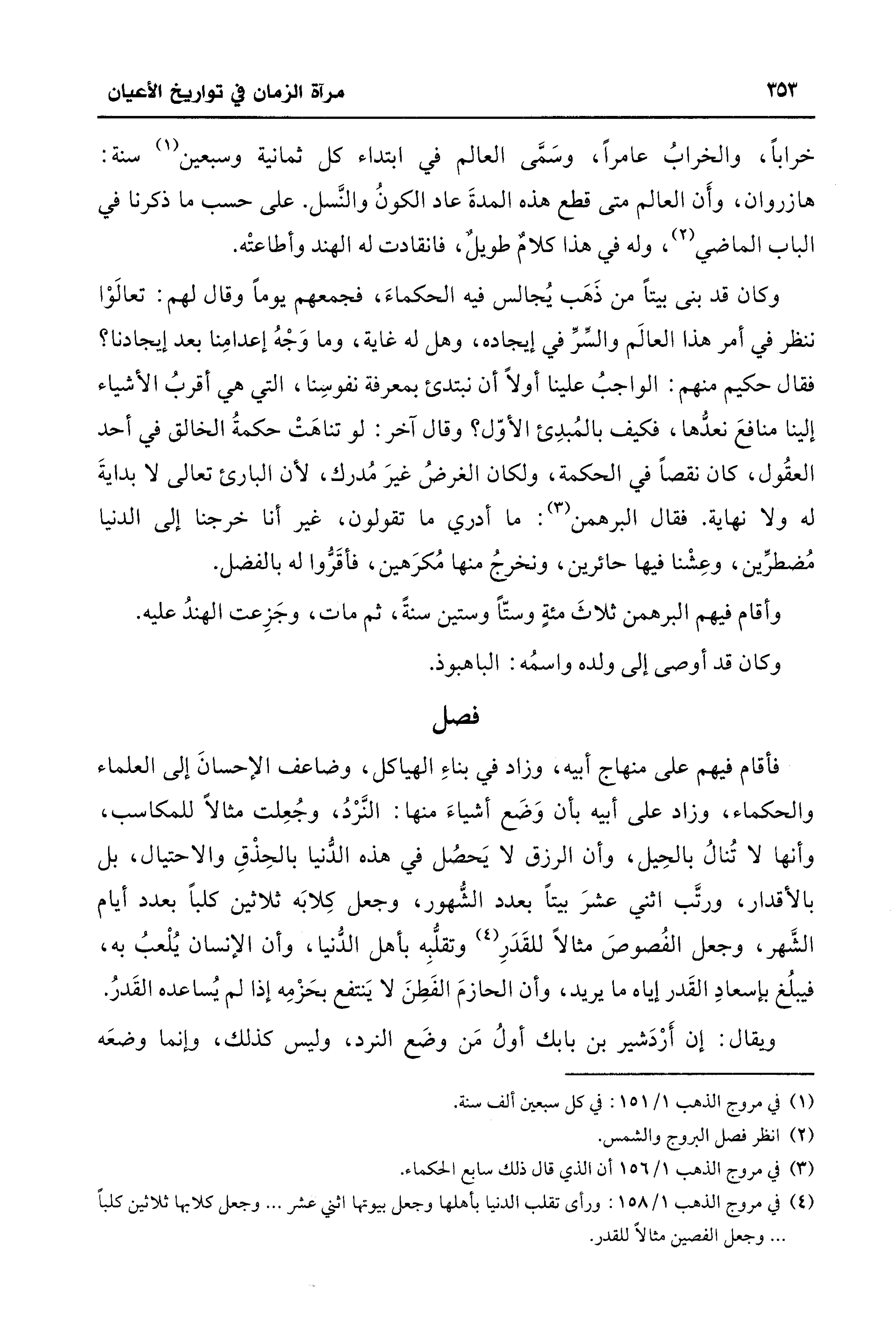 (¬4) في مروج الذهب 1/ 158: ورأى تقلب الدنيا بأهلها وجعل بيوتها اثني عشر. . . وجعل كلابها ثلاثين كلبًا. . . وجعل الفصين مثالًا للقدر.