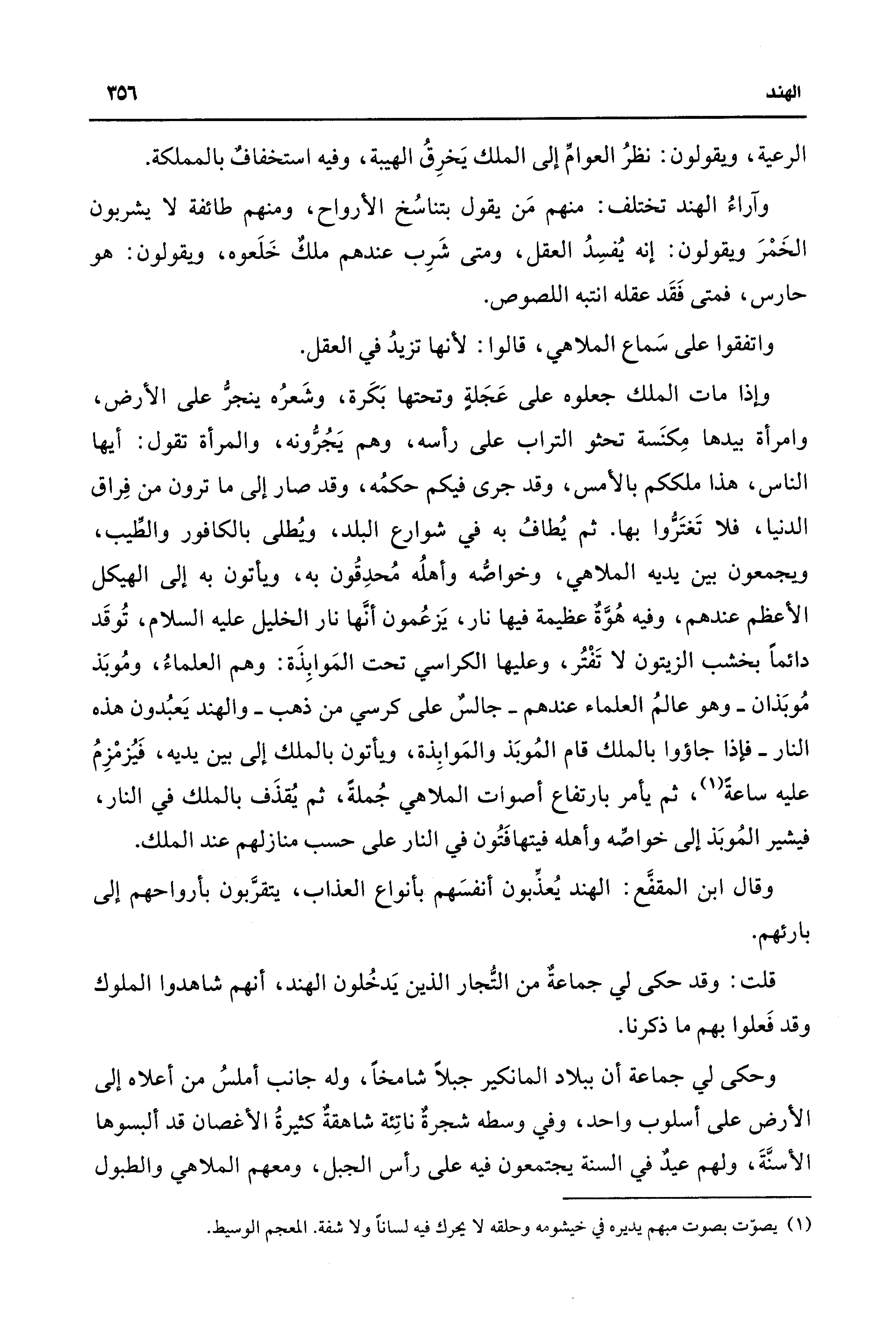 وآراءُ الهند تختلف: منهم مَن يقول بتناسُخ الأرواح، ومنهم طائفة لا يشربون الخَمْرَ ويقولون: إنه يُفسِدُ العقل، ومتى شَرِب عندهم ملكٌ خَلَعوه، ويقولون: هو حارس، فمتى فَقَد عقله انتبه اللصوص.