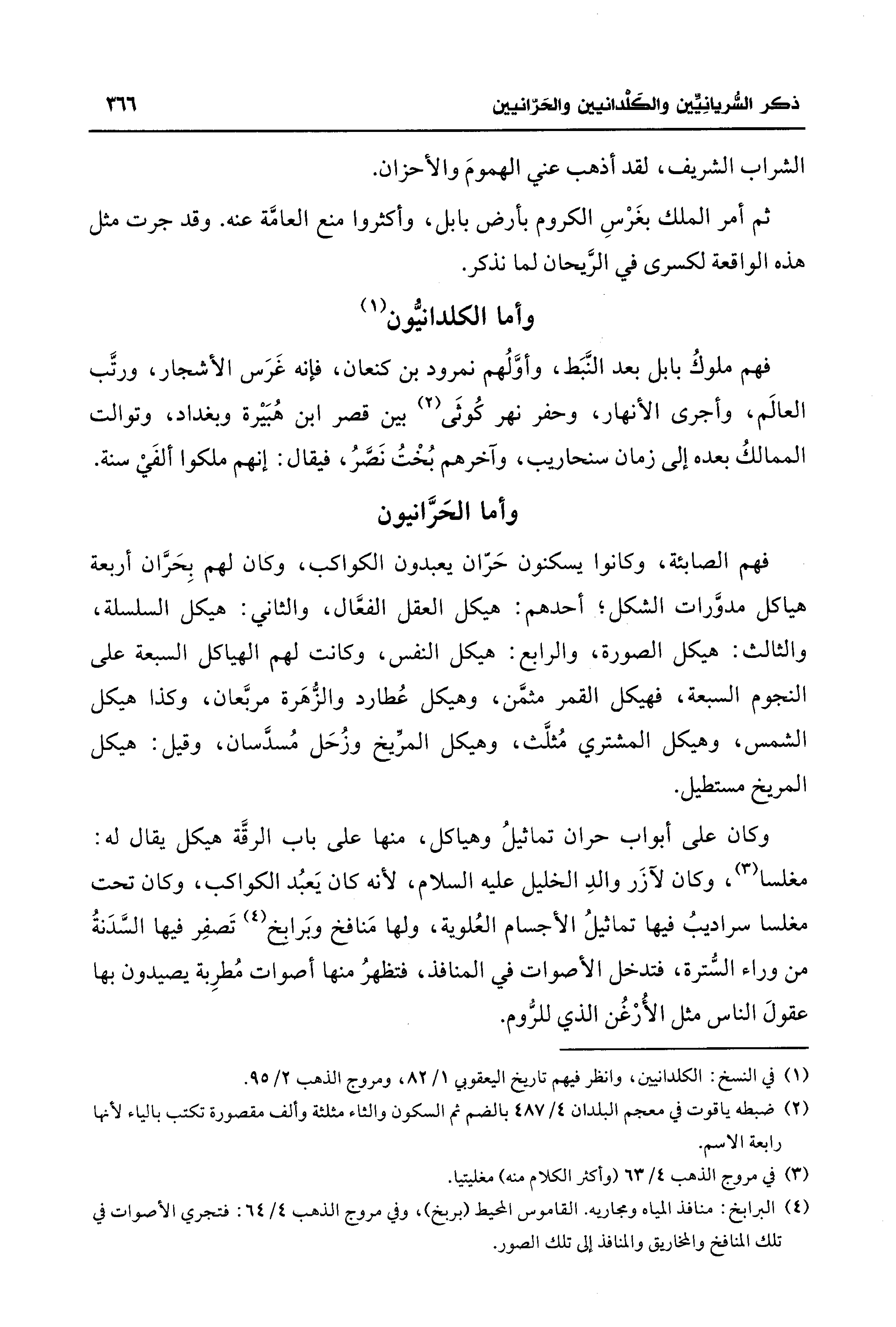 وكان على أبواب حران تماثيلُ وهياكل، منها على باب الرقَّة هيكل يقال له: مغلسا (¬3)، وكان لآزَر والدِ الخليل عليه السلام، لأنه كان يَعبُد الكواكب، وكان تحت مغلسا سراديبُ فيها تماثيلُ الأجسام العُلوية، ولها مَنافخ وبَرابخ (¬4) تَصفِر فيها السَّدَنةُ من وراء السُّترة، فتدخل الأصوات في المنافذ، فتظهرُ منها أصوات مُطرِبة يصيدون بها عقولَ الناس مثل الأُرْغُن الذي للرُّوم.