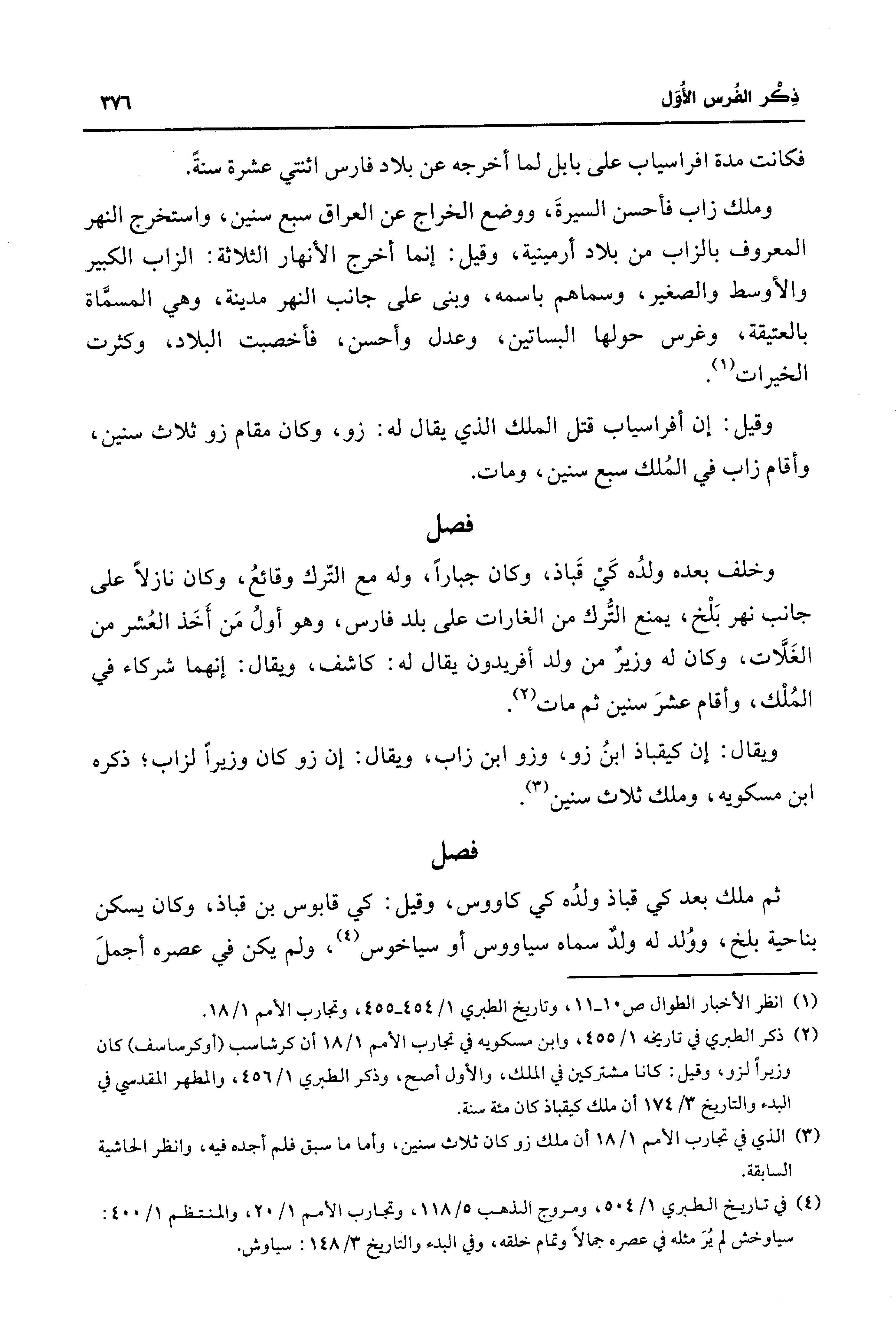 (¬2) ذكر الطبري في تاريخه 1/ 455، وابن مسكويه في تجارب الأمم 1/ 18 أن كرشاسب (أوكرساسف) كان وزيرًا لزو، وقيل: كانا مشتركين في الملك، والأول أصح، وذكر الطبري 1/ 456، والمطهر المقدسي في البدء والتاريخ 3/ 174 أن ملك كيقباذ كان مئة سنة.