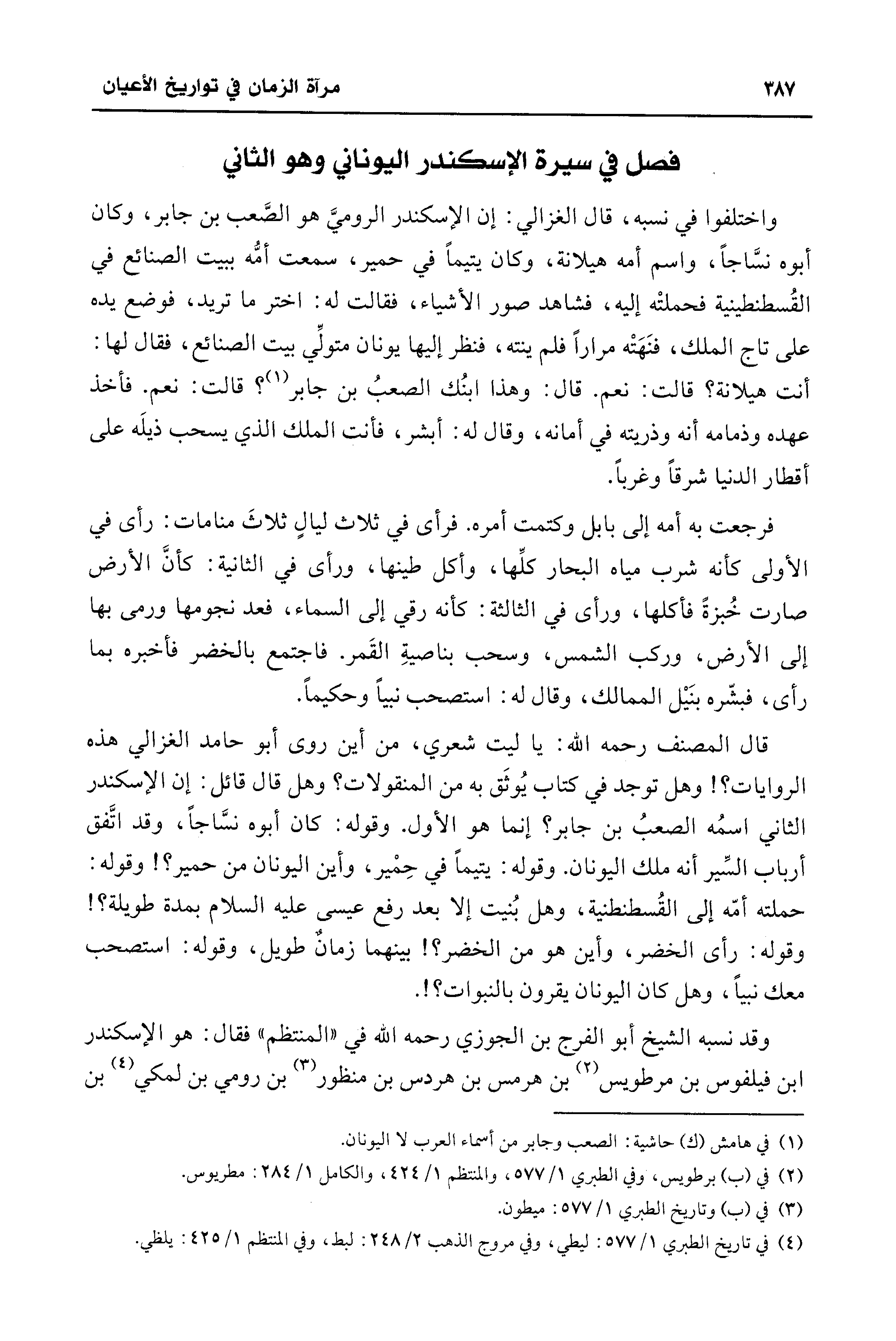 قال المصنف رحمه الله: يا ليت شعري، من أين روى أبو حامد الغزالي هذه الروايات؟ ! وهل توجد في كتاب يُوثَق به من المنقولات؟ وهل قال قائل: إن الإسكندر الثاني اسمُه الصعبُ بن جابر؟ إنما هو الأول. وقوله: كان أبوه نسَّاجًا، وقد اتَّفق أرباب السِّير أنه ملك اليونان. وقوله: يتيمًا في حِمْير، وأين اليونان من حمير؟ ! وقوله: حملته أمّه إلى القُسطنطنية، وهل بُنيت إلا بعد رفع عيسى عليه السلام بمدة طويلة؟ ! وقوله: رأى الخضر، وأين هو من الخضر؟ ! بينهما زمانٌ طويل، وقوله: استصحب معك نبيًا، وهل كان اليونان يقرون بالنبوات؟ ! .