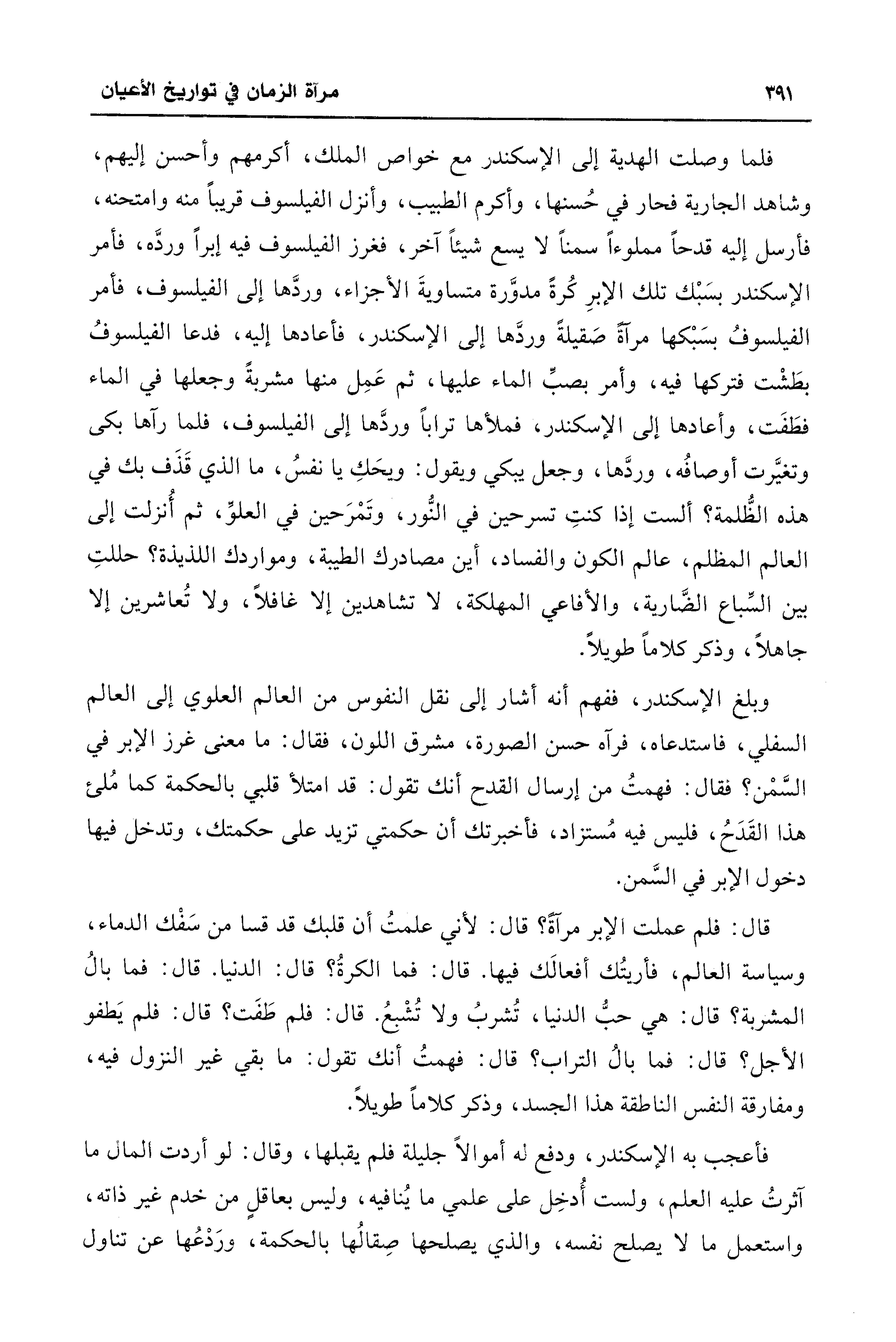 فلما وصلت الهدية إلى الإسكندر مع خواص الملك، أكرمهم وأحسن إليهم، وشاهد الجارية فحار في حُسنها، وأكرم الطبيب، وأنزل الفيلسوف قريبًا منه وامتحنه، فأرسل إليه قدحًا مملوءًا سمنًا لا يسع شيئًا آخر، فغرز الفيلسوف فيه إبرًا وردَّه، فأمر الإسكندر بسَبْك تلك الإبرِ كُرةً مدوَّرة متساويةَ الأجزاء، وردَّها إلى الفيلسوف، فأمر الفيلسوفُ بسَبْكها مرآةً صقيلةً وردَّها إلى الإسكندر، فأعادها إليه، فدعا الفيلسوفُ بطَشْت فتركها فيه، وأمر بصبِّ الماء عليها، ثم عَمِل منها مشربةً وجعلها في الماء فطَفَت، وأعادها إلى الإسكندر، فملأها ترابًا وردَّها إلى الفيلسوف، فلما رآها بكى وتغيَّرت أوصافُه، وردَّها، وجعل يبكي ويقول: ويحَكِ يا نفسُ، ما الذي قَذَف بك في هذه الظُّلمة؟ ألست إذا كنتِ تسرحين في النُّور، وتَمْرَحين في العلوِّ، ثم أُنزلت إلى العالم المظلم، عالم الكون والفساد، أين مصادرك الطيبة، ومواردك اللذيذة؟ حللتِ بين السِّباع الضَّارية، والأفاعي المهلكة، لا تشاهدين إلا غافلًا، ولا تُعاشرين إلا جاهلًا، وذكر كلامًا طويلًا.