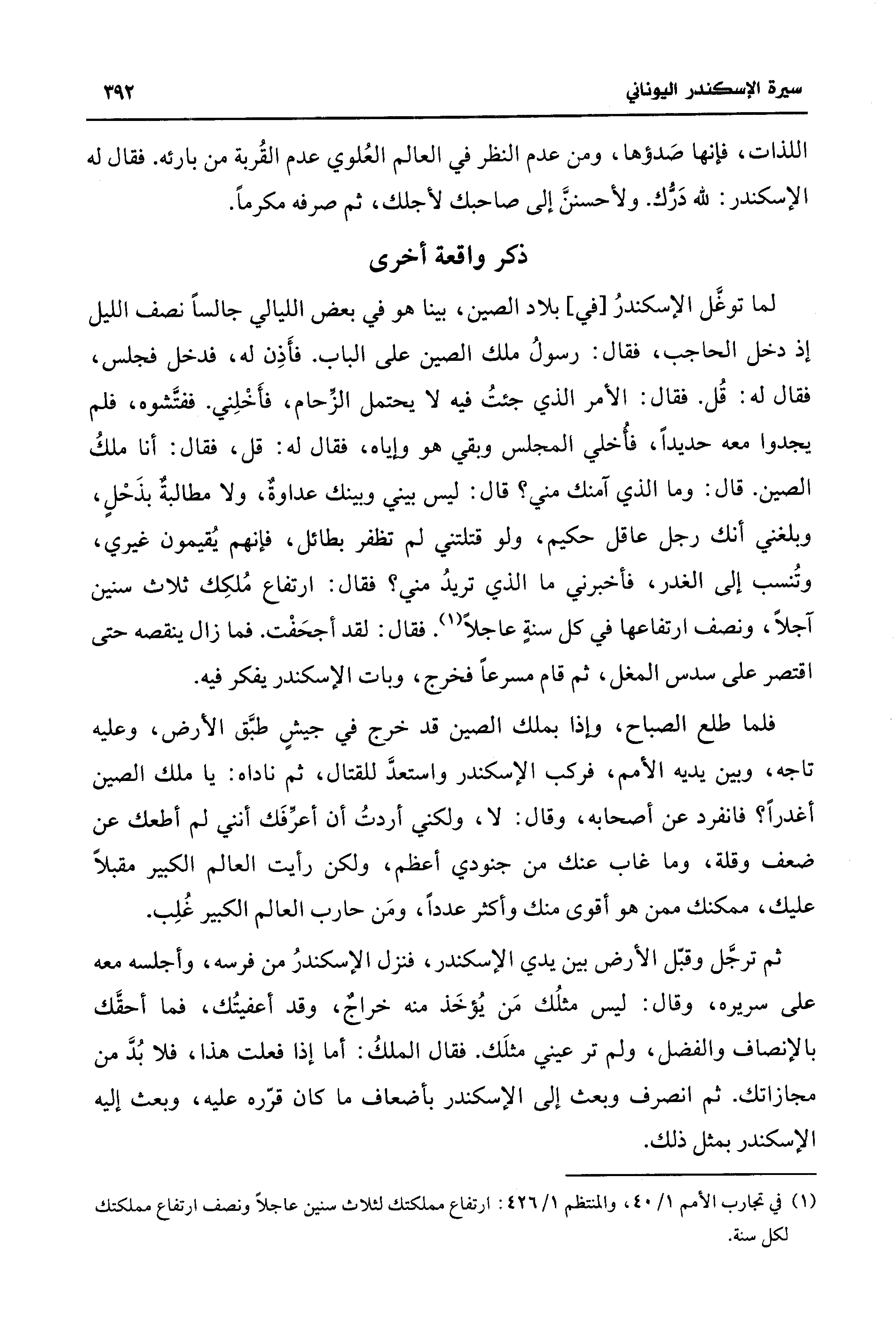 فلما طلع الصباح، وإذا بملك الصين قد خرج في جيشٍ طبَّق الأرض، وعليه تاجه، وبين يديه الأمم، فركب الإسكندر واستعدَّ للقتال، ثم ناداه: يا ملك الصين أغدرًا؟ فانفرد عن أصحابه، وقال: لا، ولكني أردتُ أن أعرِّفَك أنني لم أطعك عن ضعف وقلة، وما غاب عنك من جنودي أعظم، ولكن رأيت العالم الكبير مقبلًا عليك، ممكنك ممن هو أقوى منك وأكثر عددًا، ومَن حارب العالم الكبير غُلِب.