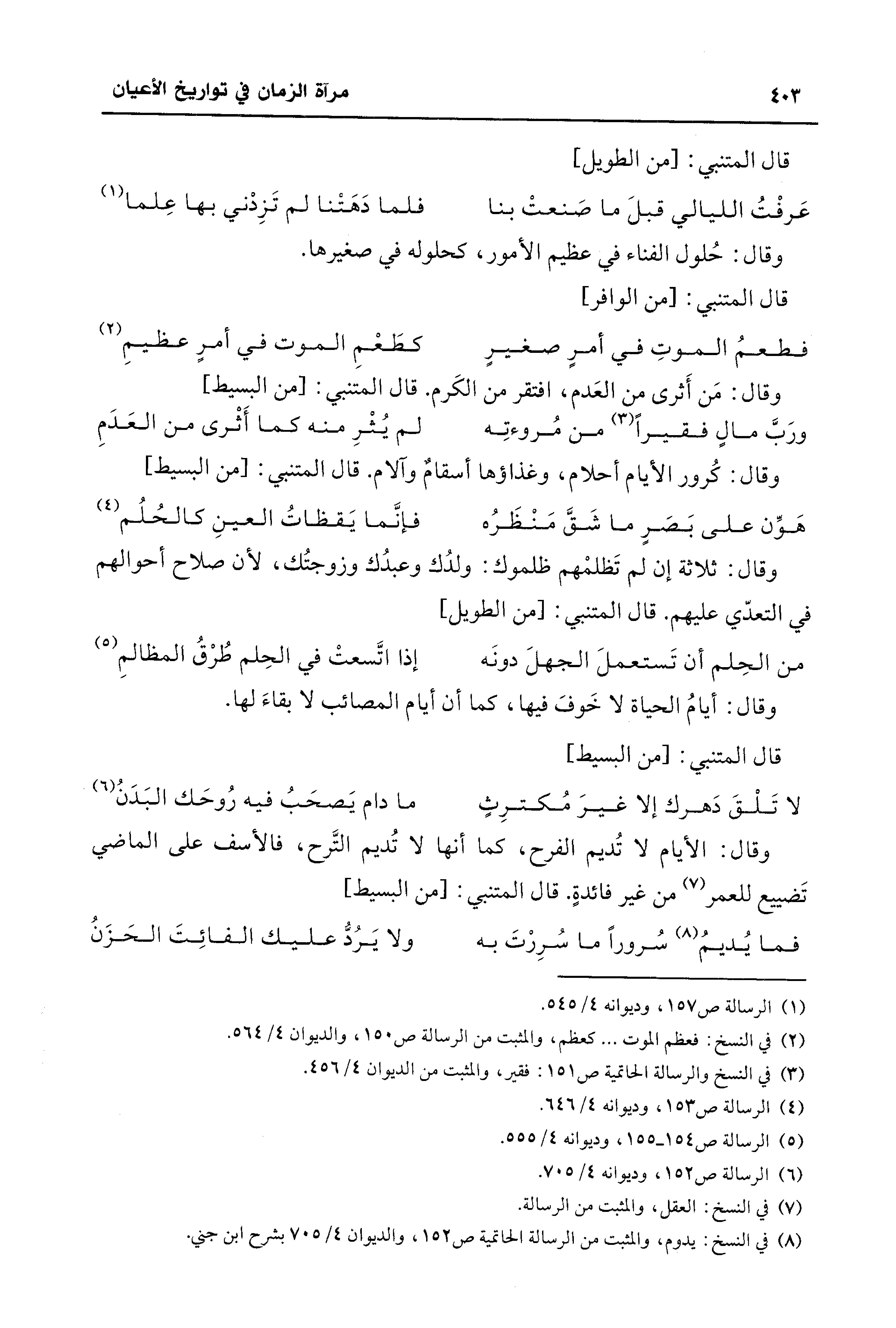 وقال: الأيام لا تُديم الفرح، كما أنها لا تُديم التَّرح، فالأسف على الماضي تَضييع للعمر (¬7) من غير فائدةٍ. قال المتنبي: [من البسيط]