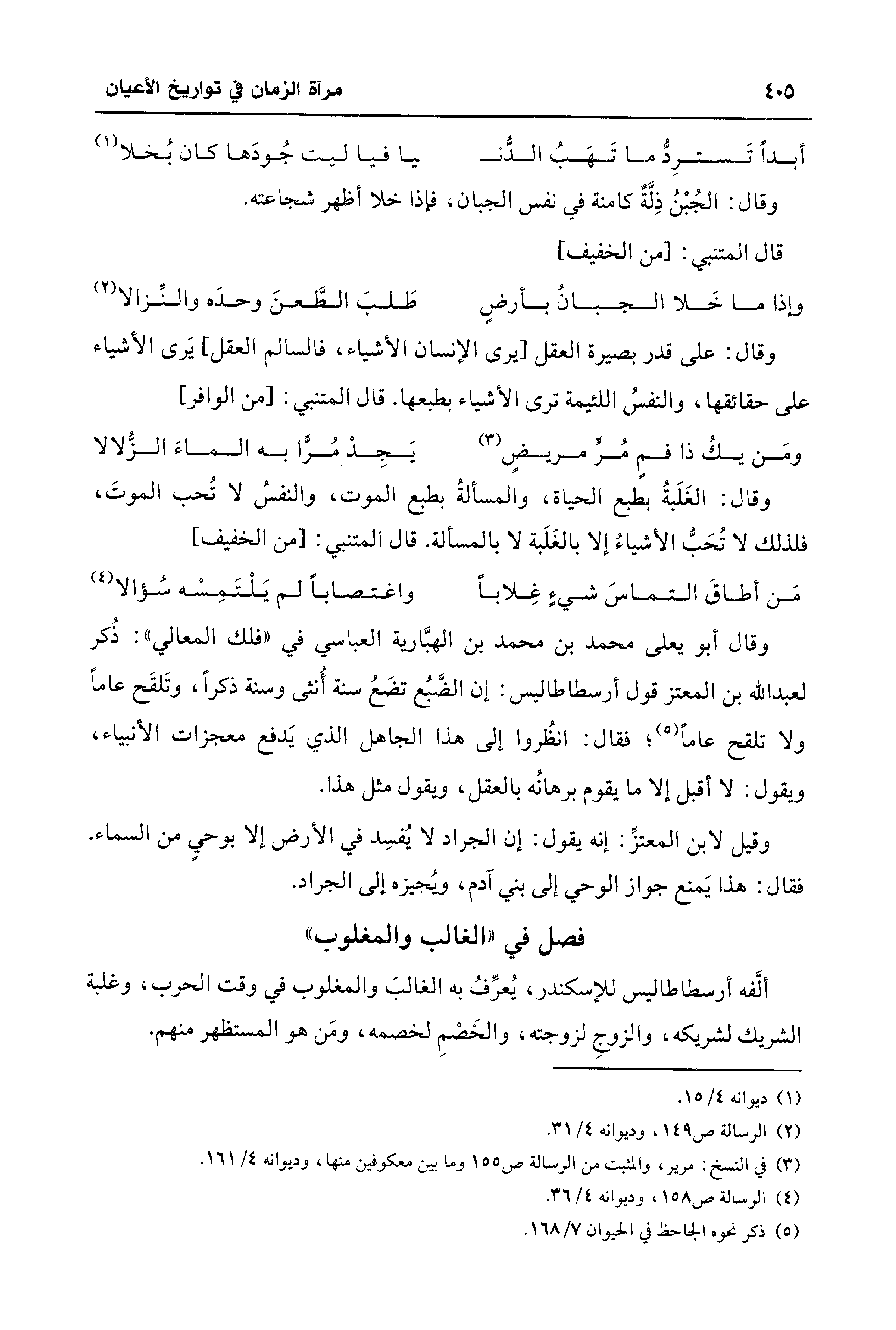 وقال أبو يعلى محمد بن محمد بن الهبَّارية العباسي في "فلك المعالي": ذُكر لعبد الله بن المعتز قول أرسطاطاليس: إن الضَّبُع تضَعُ سنة أُنثى وسنة ذكرًا، وتَلقَح عامًا ولا تلقح عامًا (¬5)، فقال: انظُروا إلى هذا الجاهل الذى يَدفع معجزات الأنبياء، ويقول: لا أقبل إلا ما يقوم برهانُه بالعقل، ويقول مثل هذا.