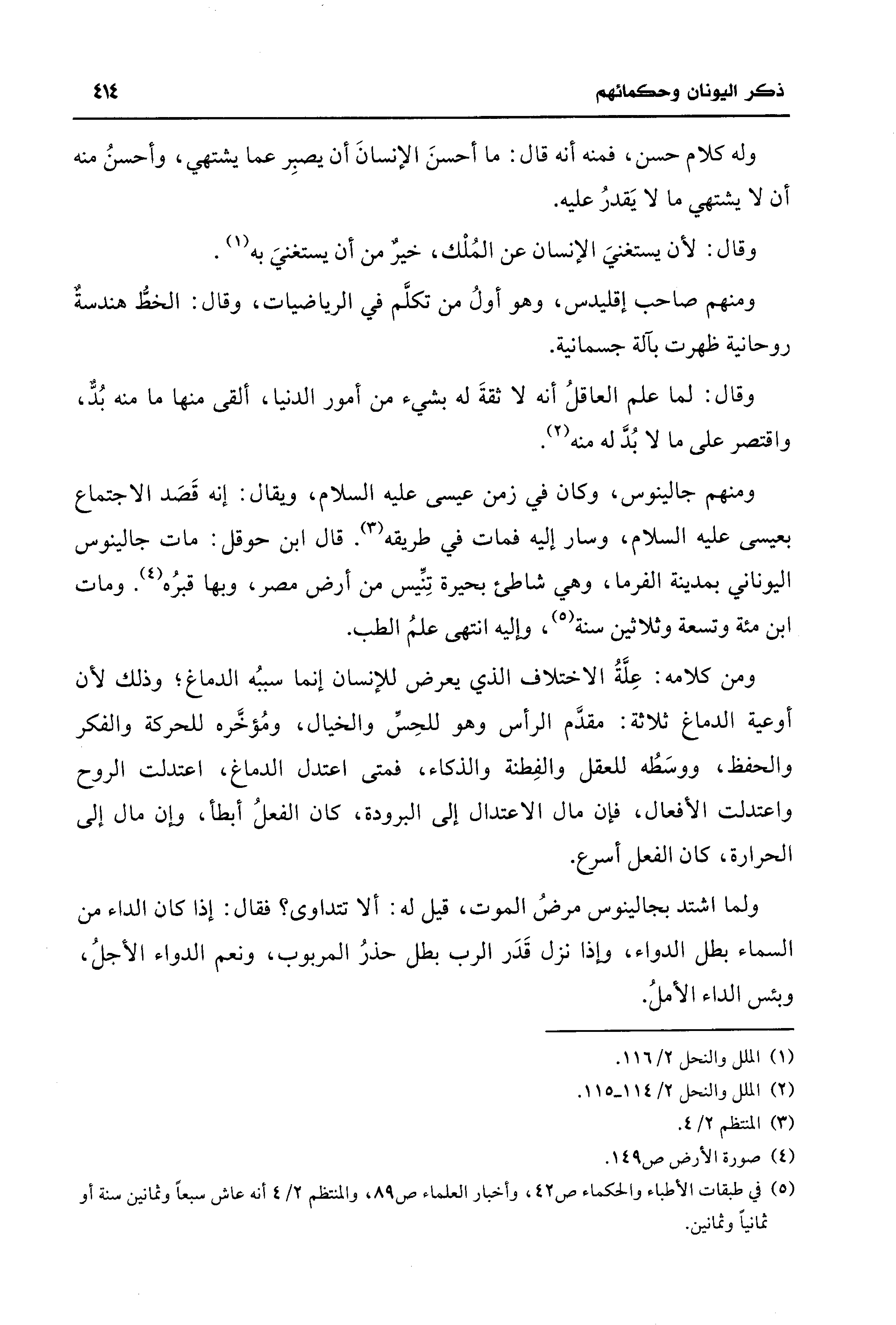 (¬5) في طبقات الأطباء والحكماء ص 42، وأخبار العلماء ص 89، والمنتظم 2/ 4 أنه عاش سبعًا وثمانين سنة أو ثمانيًا وثمانين.