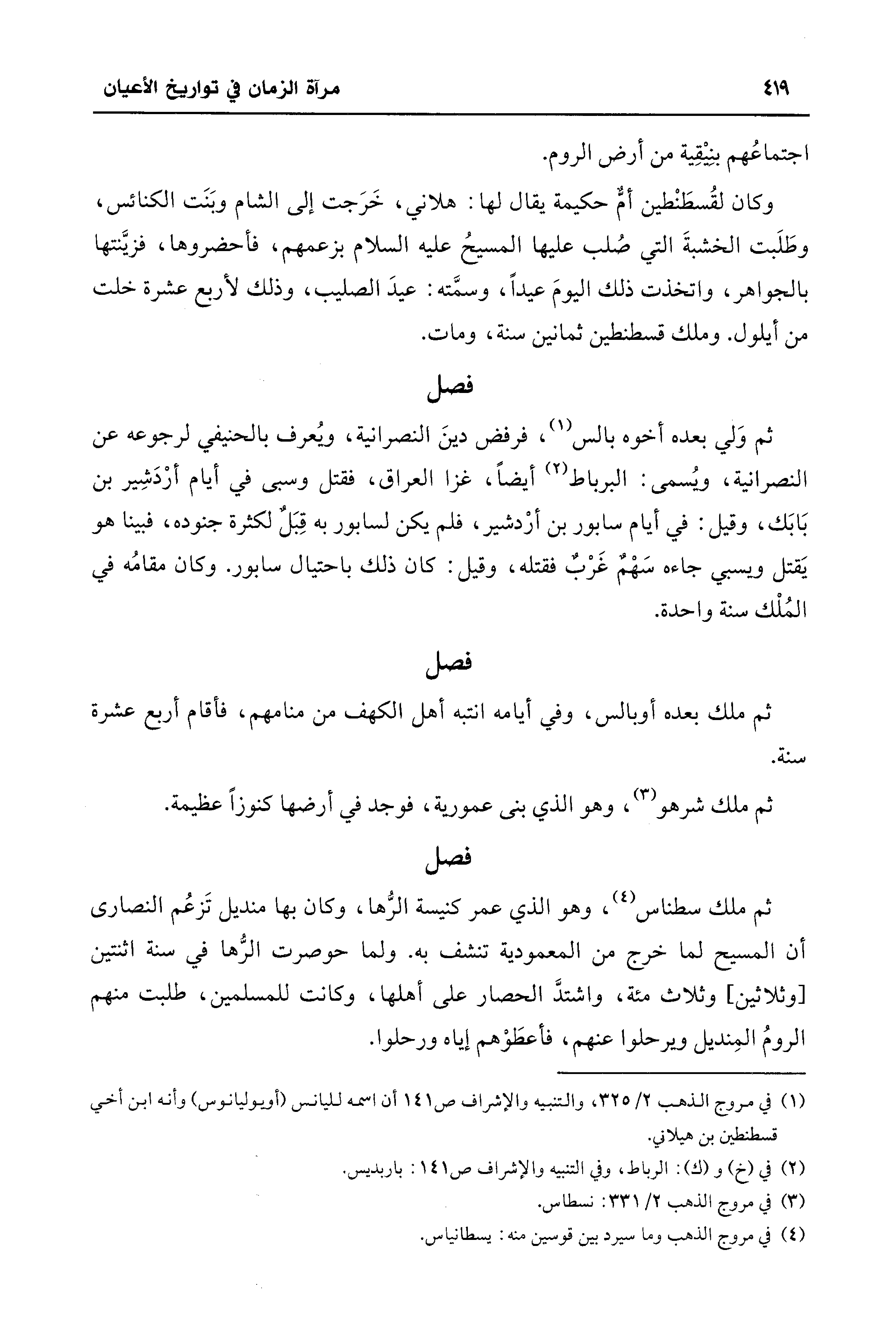 ثم ملك سطناس (¬4)، وهو الذي عمر كنيسة الرُّها، وكان بها منديل تَزعُم النصارى أن المسيح لما خرج من المعمودية تنشف به. ولما حوصرت الرُّها في سنة اثنتين [وثلاثين] وثلاث مئة، واشتدَّ الحصار على أهلها، وكانت للمسلمين، طلبت منهم الرومُ المِنديل ويرحلوا عنهم، فأعطَوْهم إياه ورحلوا.
