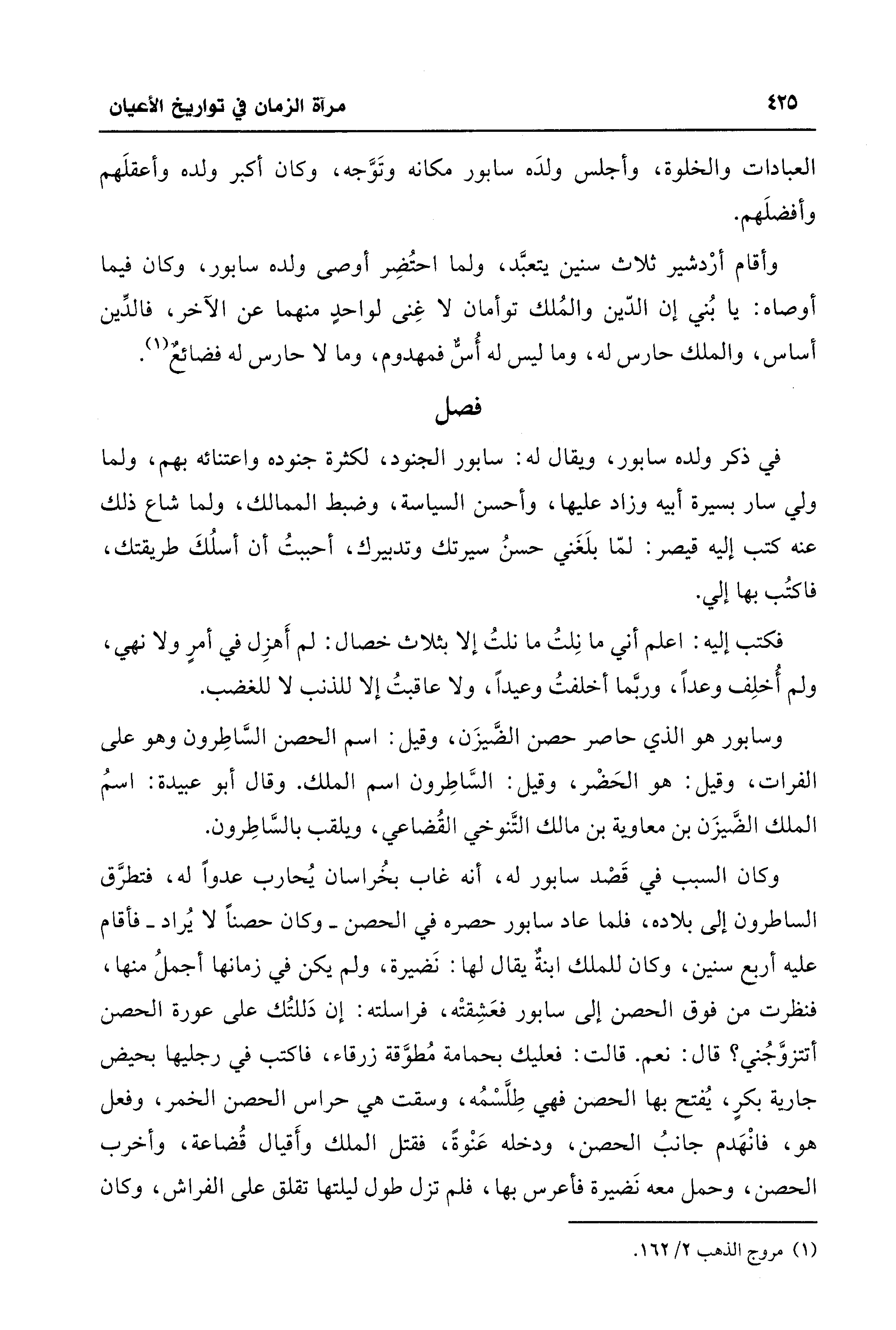 في ذكر ولده سابور، ويقال له: سابور الجنود، لكثرة جنوده واعتنائه بهم، ولما ولي سار بسيرة أبيه وزاد عليها، وأحسن السياسة، وضبط الممالك، ولما شاع ذلك عنه كتب إليه قيصر: لمّا بلَغَني حسنُ سيرتك وتدبيرك، أحببتُ أن أسلُكَ طريقتك، فاكتُب بها إلي.