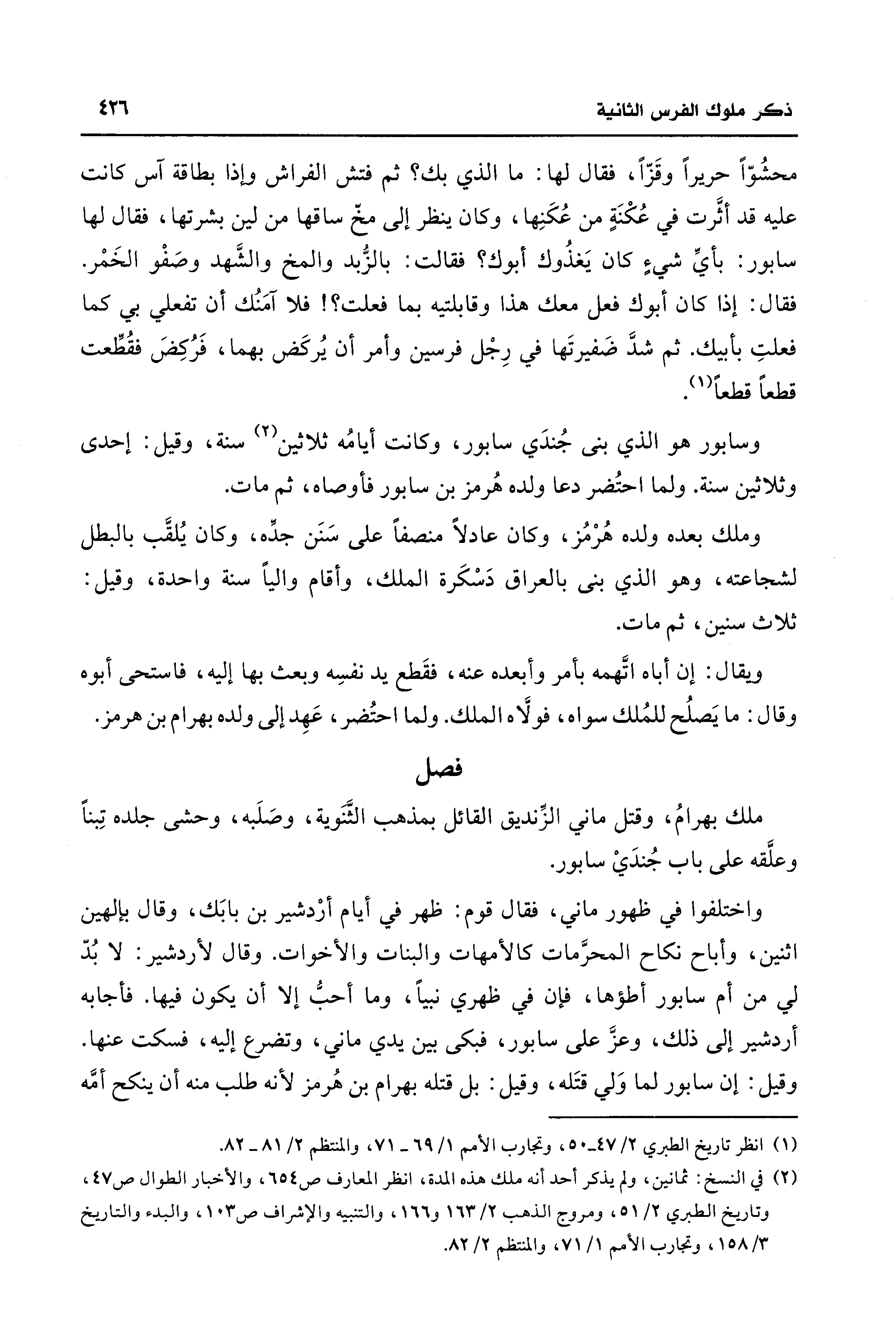 محشُوًّا حريراً وقَزّاً، فقال لها: ما الذي بك؟ ثم فتش الفراش وإذا بطاقة آس كانت عليه قد أثَرت في عُكْنَةٍ من عُكَنِها، وكان ينظر إلى مخّ ساقها من لين بشرتها، فقال لها سابور: بأي شيءٍ كان يَغذُوك أبوك؟ فقالت: بالزُّبد والمخ والشَّهد وصَفْو الخَمْر. فقال: إذا كان أبوك فعل معك هذا وقابلتيه بما فعلت؟ ! فلا آمَنُك أن تفعلي بي كما فعلتِ بأبيك. ثم شدَّ ضَفيرتَها في رِجْل فرسين وأمر أن يُركَض بهما، فَرُكِضَ فقُطِّعت قطعاً قطعاً (¬1).