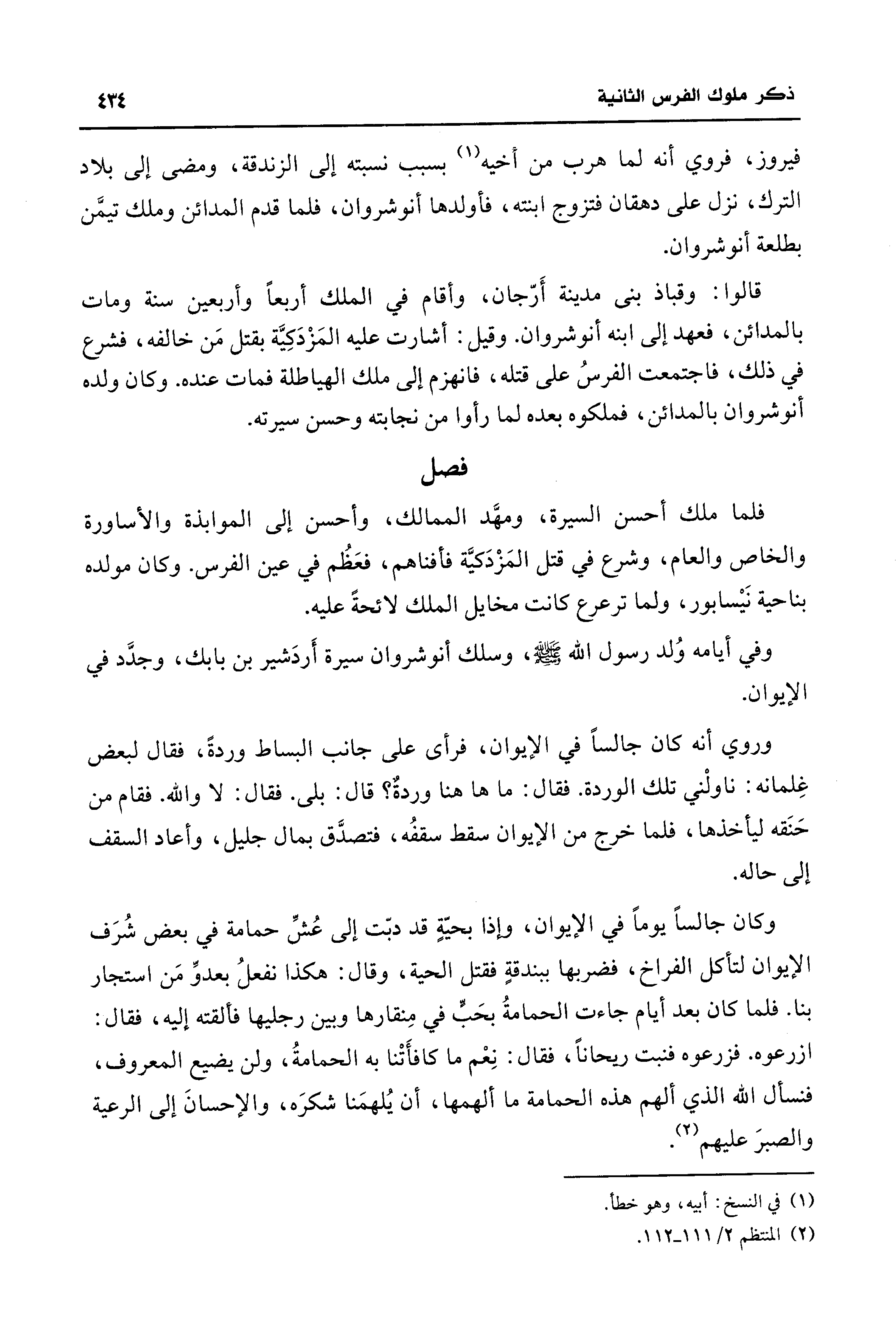 وفي أيامه وُلد رسول الله - صلى الله عليه وسلم -، وسلك أنوشروان سيرة أَردَشير بق بابك، وجدَّد في الإيوان.