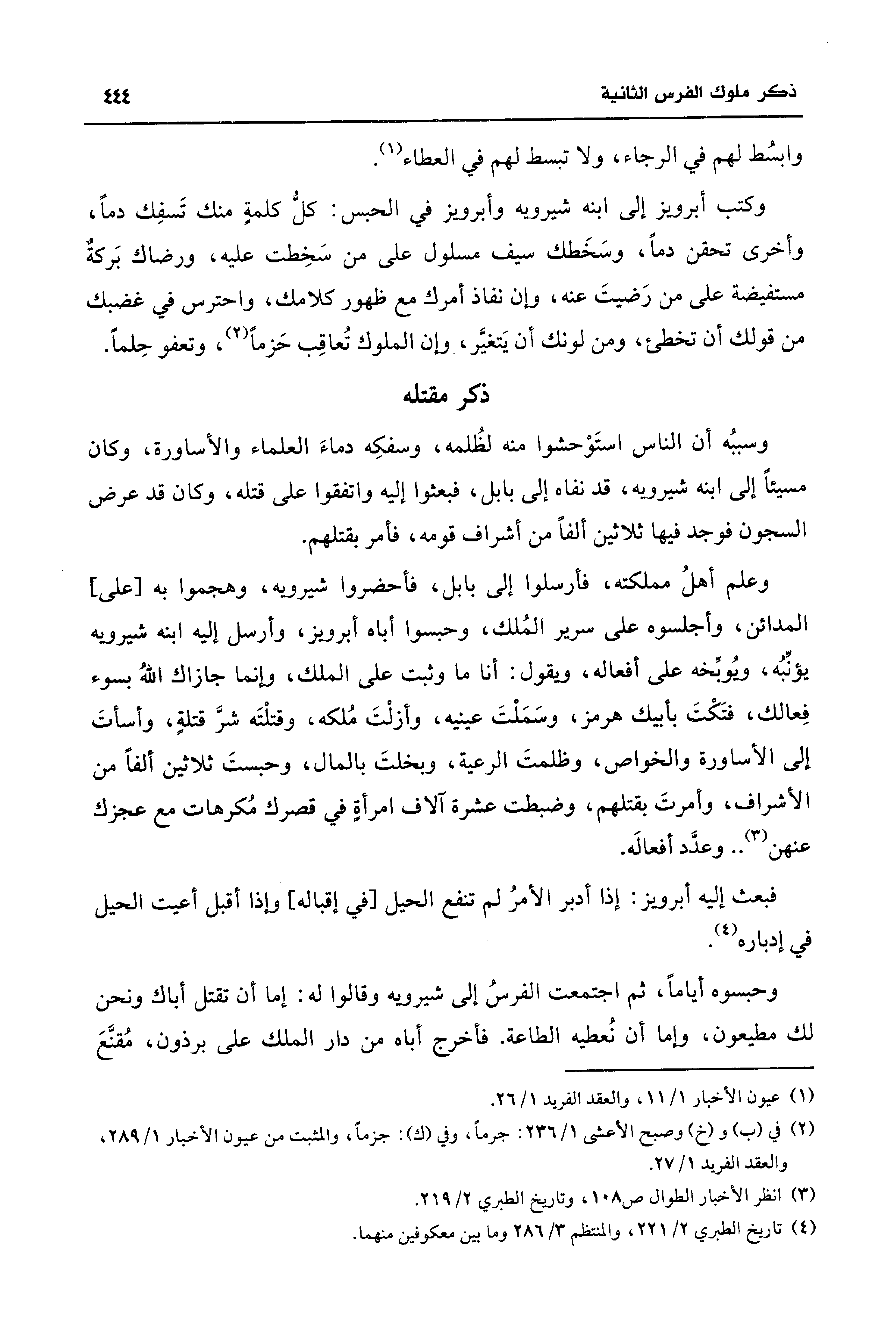 وكتب أبرويز إلى ابنه شيرويه وأبرويز في الحبس: كلُّ كلمةٍ منك تسفِك دماً، وأخرى تحقن دماً، وسَخَطك سيف مسلول على من سَخِطت عليه، ورضاك بَركة مستفيضة على من رَضيتَ عنه، وإن نفاذ أمرك مع ظهور كلامك، واحترس في غضبك من قولك أن تخطئ، ومن لونك أن يَتغير، وإن الملوك تُعاقِب حَزماً (¬2)، وتعفو حِلماً.