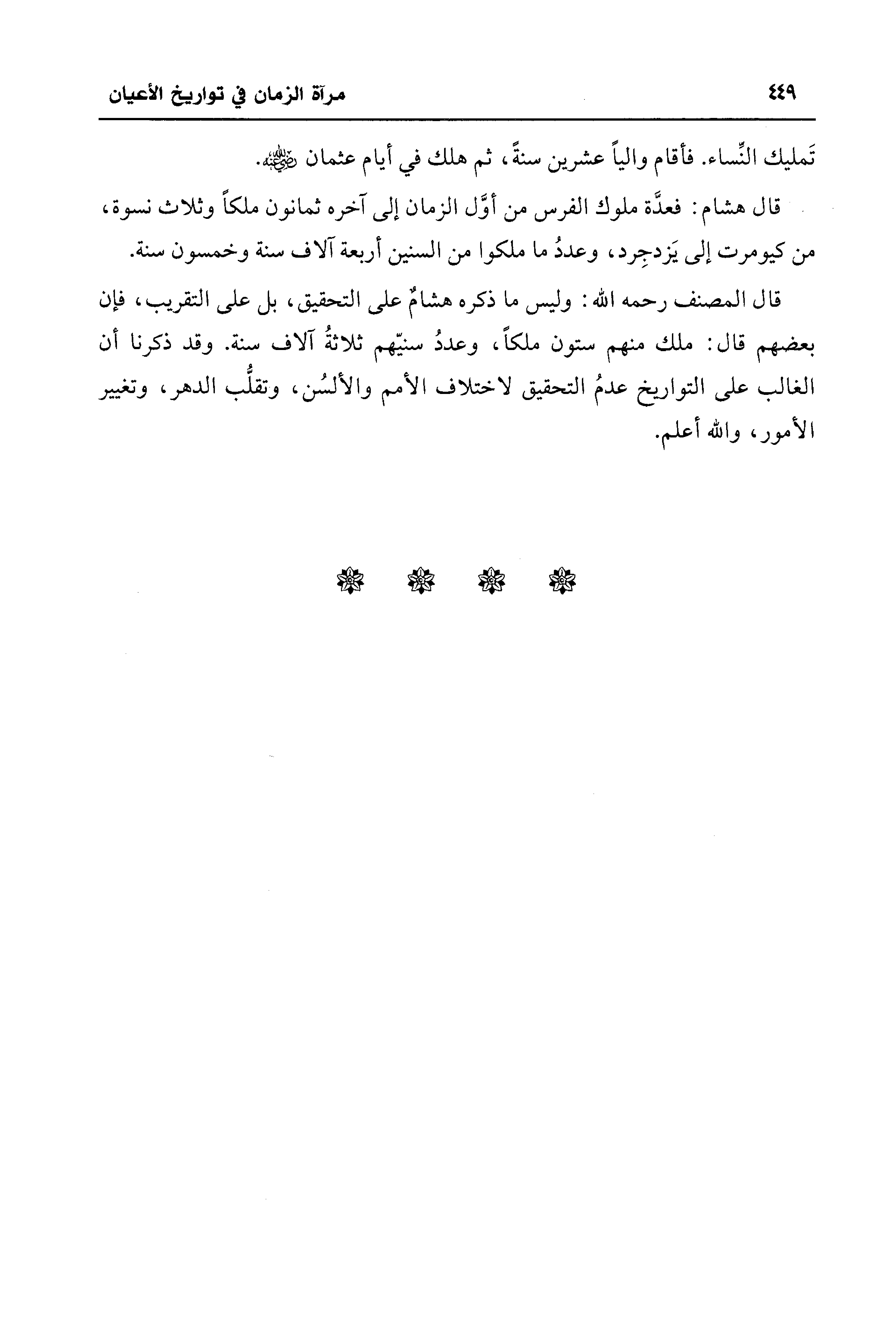 قال هشام: فعدَّة ملوك الفرس من أوَّل الزمان إلى آخره ثمانون ملكاً وثلاث نسوة، من كيومرت إلى يَزدجِرد، وعددُ ما ملكوا من السنين أربعة آلاف سنة وخمسون سنة.