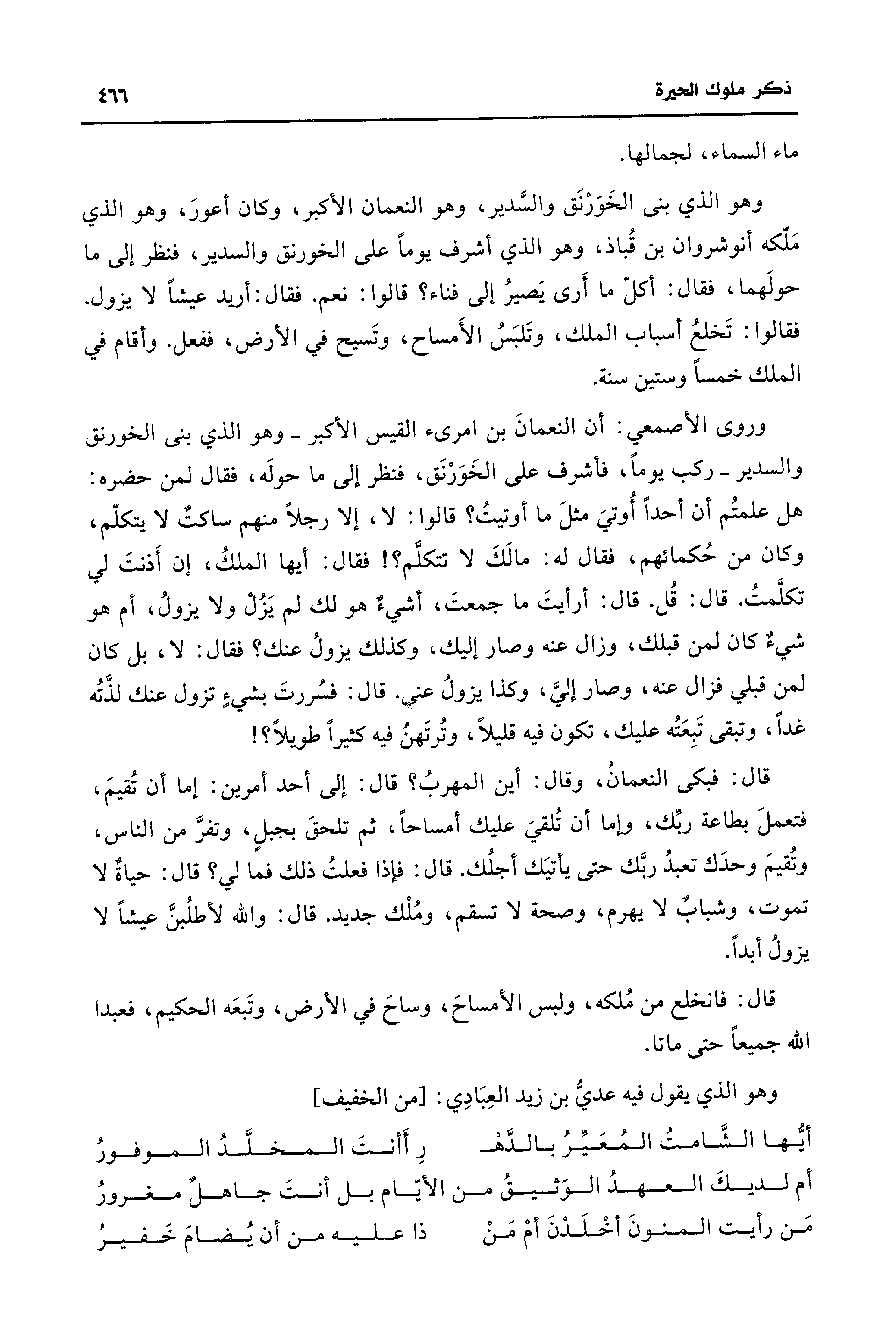وروى الأصمعي: أن النعمانَ بن امرئ القيس الأكبر -وهو الذي بنى الخورنق والسدير- ركب يوماً، فأشرف على الخَوَرْنَق، فنظر إلى ما حولَه، فقال لمن حضره: هل علمتُم أن أحداً أُوتيَ مثلَ ما أوتيتُ؟ قالوا: لا، إلا رجلاً منهم ساكت لا يتكلّم، وكان من حُكمائهم، فقال له: مالَكَ لا تتكلَّم؟ ! فقال: أيها الملكُ، إن أَذنتَ لي تكلَّمتُ. قال: قُل. قال: أرأيتَ ما جمعتَ، أشيء هو لك لم يَزُلْ ولا يزولُ، أم هو شيءٌ كان لمن قبلك، وزال عنه وصار إليك، وكذلك يزولُ عنك؟ فقال: لا، بل كان لمن قبلي فزال عنه، وصار إليَّ، وكذا يزولُ عني. قال: فسُررتَ بشيءٍ تزول عنك لذتُه غداً، وتبقى تَبِعَتُه عليك، تكون فيه قليلاً، وتُرتَهنُ فيه كثيراً طويلاً؟ !