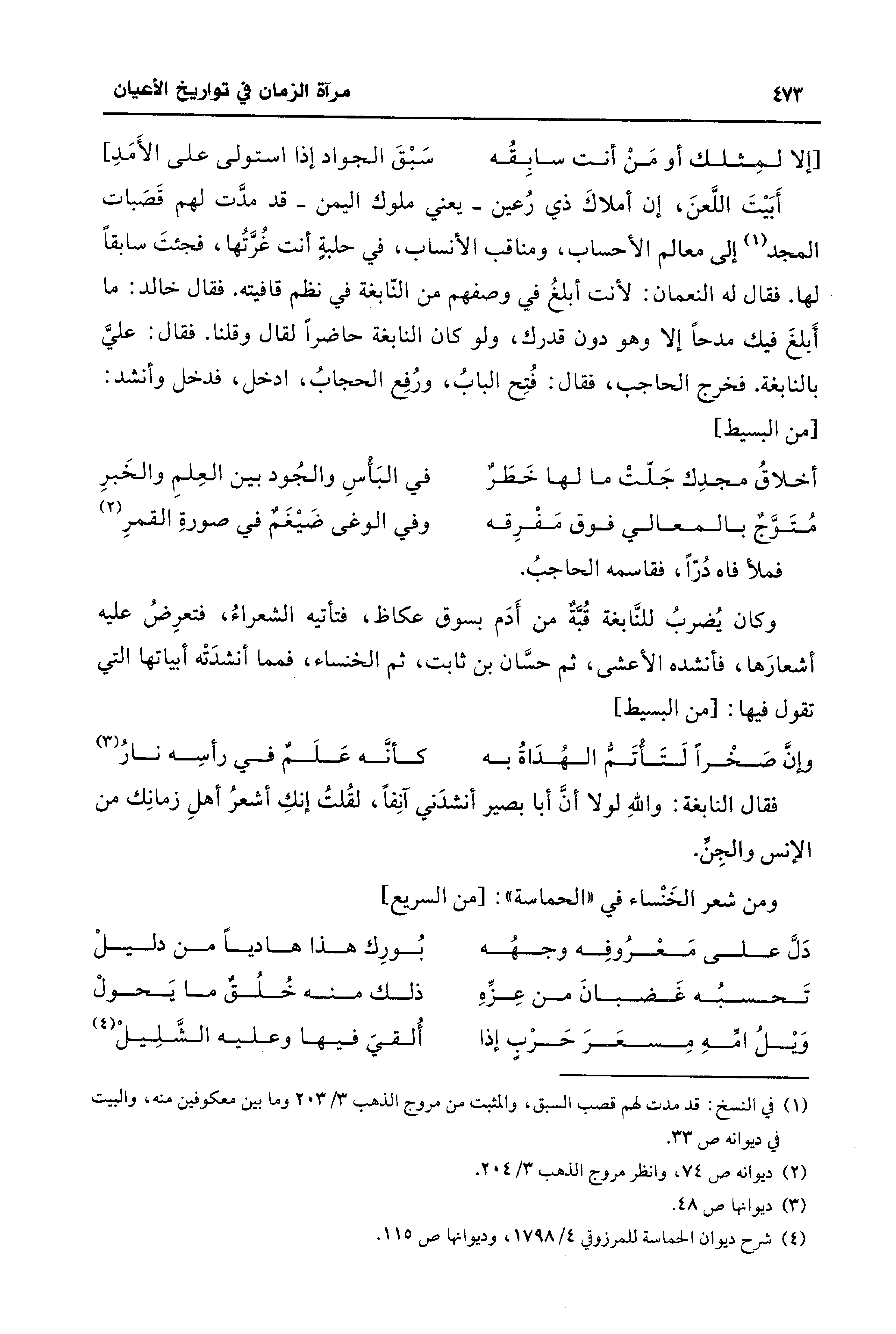 أَبَيْتَ اللَّعنَ، إن أملاكَ ذي رُعين -يعني ملوك اليمن- قد مدَّت لهم قَصَبات المجد (¬1) إِلى معالم الأحساب، ومناقب الأنساب، في حلبةٍ أنت غُرَّتُها، فجئتَ سابقًا لها. فقال له النعمان: لأنت أبلغُ في وصفهم من النّابغة في نظم قافيته. فقال خالد: ما أَبلغَ فيك مدحًا إلا وهو دون قدرك، ولو كان النابغة حاضرًا لقال وقلنا. فقال: عليَّ بالنابغة. فخرج الحاجب، فقال: فُتِح البابُ، ورُفِع الحجابُ، ادخل، فدخل وأنشد: [من البسيط]