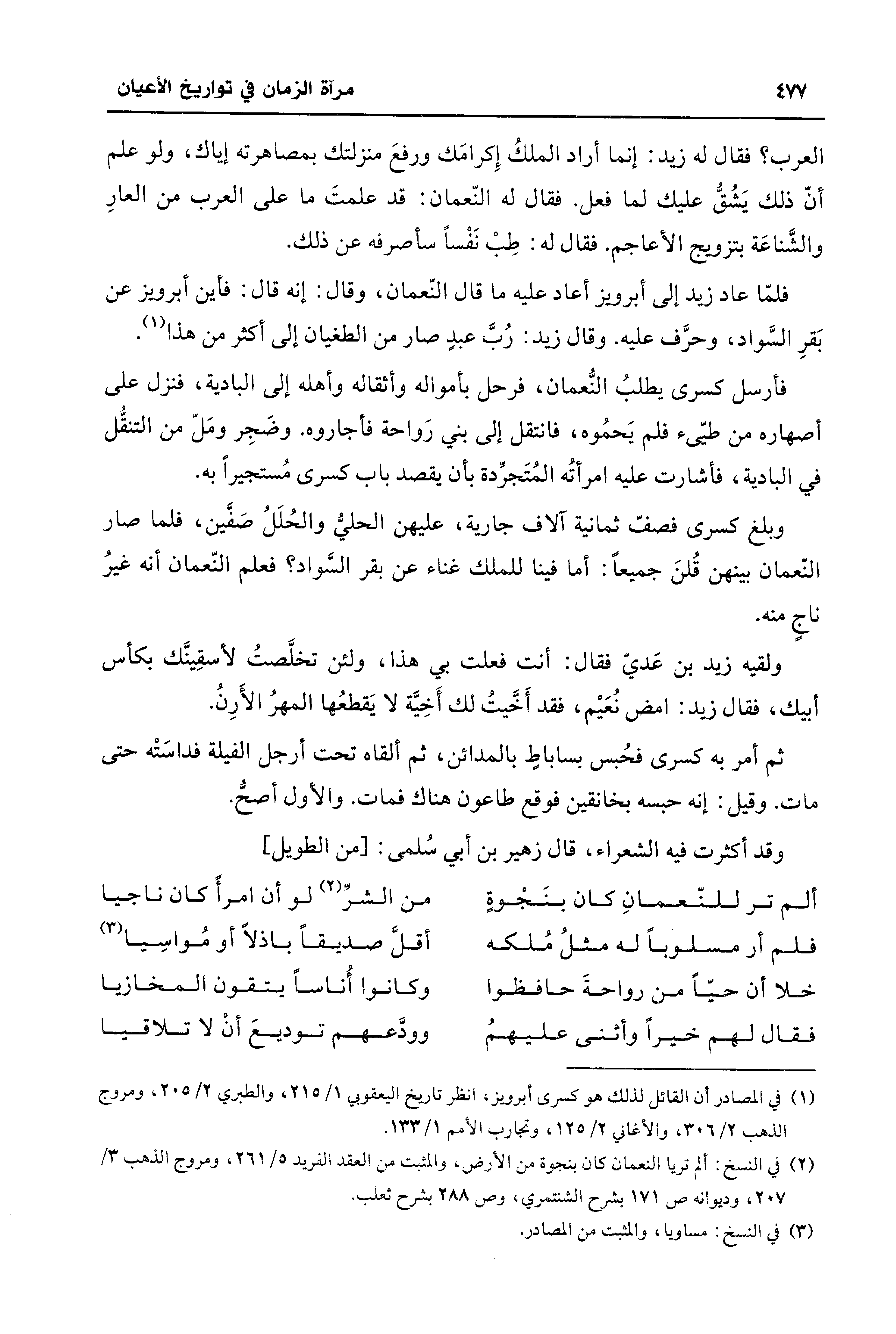 العرب؟ فقال له زيد: إنما أراد الملكُ إِكرامَك ورفعَ منزلتك بمصاهرته إياك، ولو علم أنّ ذلك يَشُقُّ عليك لما فعل. فقال له النعمان: قد علمتَ ما على العرب من العارِ والشَّناعَة بتزويج الأعاجم. فقال له: طِبْ نَفْسًا سأصرفه عن ذلك.