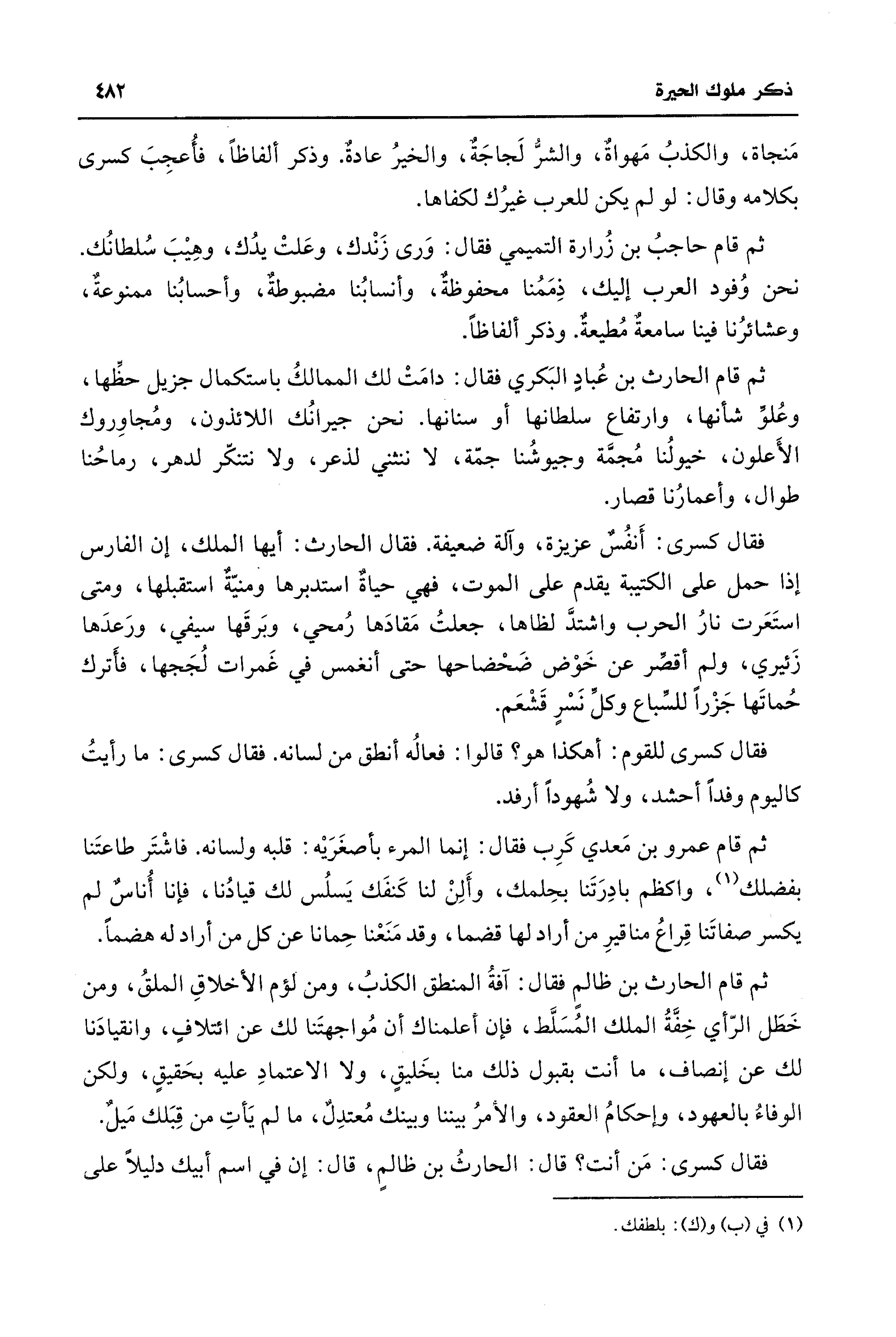 ثم قام الحارث بن عُبادٍ البَكري فقال: دامَتْ لك الممالكُ باستكمال جزيل حظِّها، وعُلوِّ شأنها، وارتفاع سلطانها أو سنانها. نحن جيرانُك اللائذون، ومُجاوِروك الأَعلون، خيولُنا مُجمَّة وجيوشُنا جمّة، لا ننثني لذعر، ولا نتنكر لدهر، رماحُنا طوال، وأعمارُنا قصار.