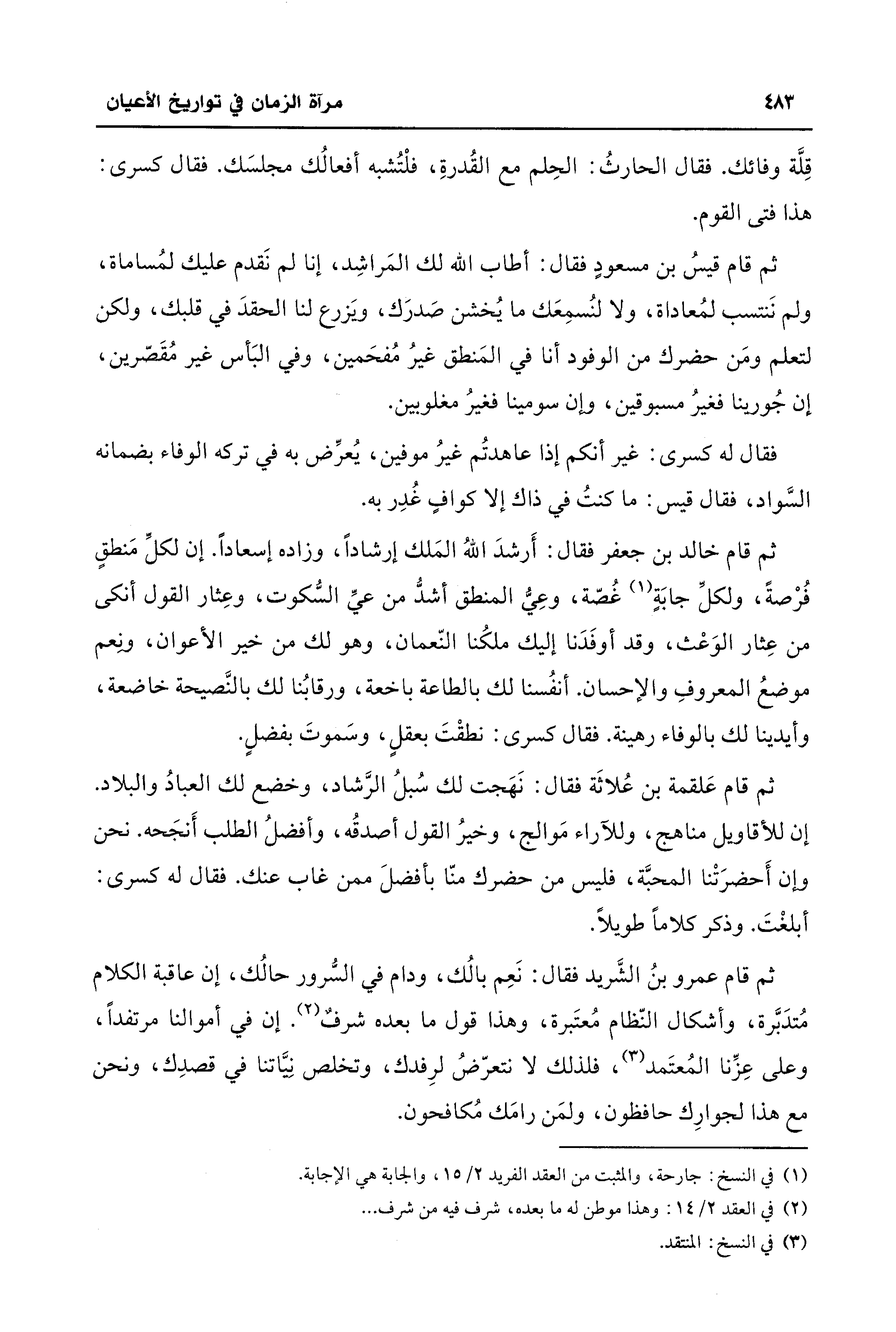 ثم قام قيسُ بن مسعودٍ فقال: أطاب الله لك المَراشِد، إنا لم نَقدم عليك لمُساماة، ولم نَنتسب لمُعاداة، ولا لنُسمِعَك ما يُخشن صَدرَك، وَيزرع لنا الحقدَ في قلبك، ولكن لتعلم ومَن حضرك من الوفود أنا في المَنطق غيرُ مُفحَمين، وفي البَأس غير مُقَصرين، إن جُورينا فغيرُ مسبوقين، وإن سومينا فغيرُ مغلوبين.