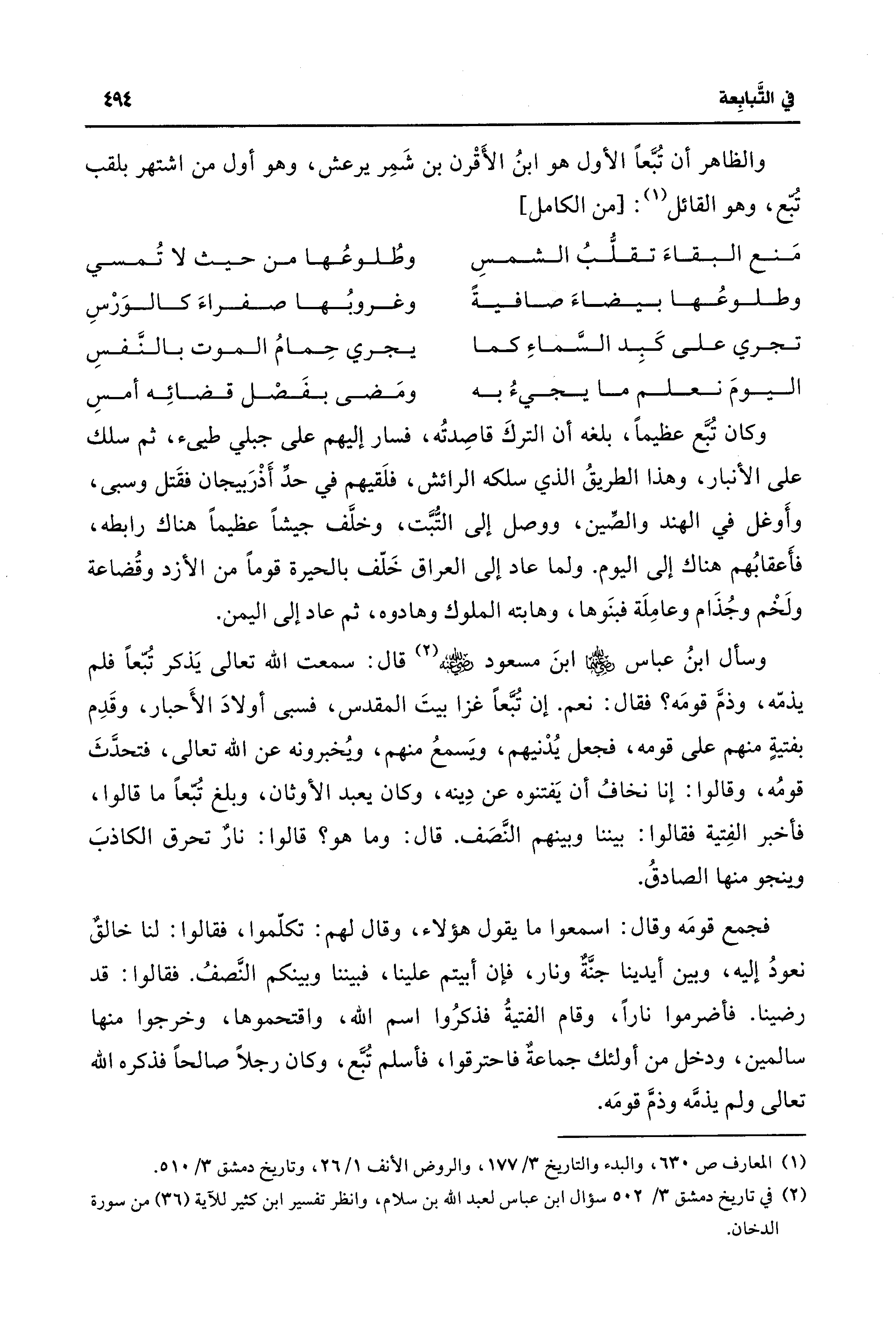 وسأل ابنُ عباس - رضي الله عنه - ابنَ مسعود - رضي الله عنه - (¬2) قال: سمعت الله تعالى يَذكر تُبّعًا فلم يذمّه، وذمَّ قومَه؟ فقال: نعم. إن تُبَّعًا غزا بيتَ المقدس، فسبى أولادَ الأَحبار، وقَدِم بفتيةٍ منهم على قومه، فجعل يُدْنيهم، وَيسمعُ منهم، ويُخبرونه عن الله تعالى، فتحدَّثَ قومُه، وقالوا: إنا نخافُ أن يَفتنوه عن دِينه، وكان يعبد الأوثان، وبلغ تُبعًا ما قالوا، فأخبر الفِتية فقالوا: بيننا وبينهم النَّصَف. قال: وما هو؟ قالوا: نارٌ تحرق الكاذبَ وينجو منها الصادقُ.