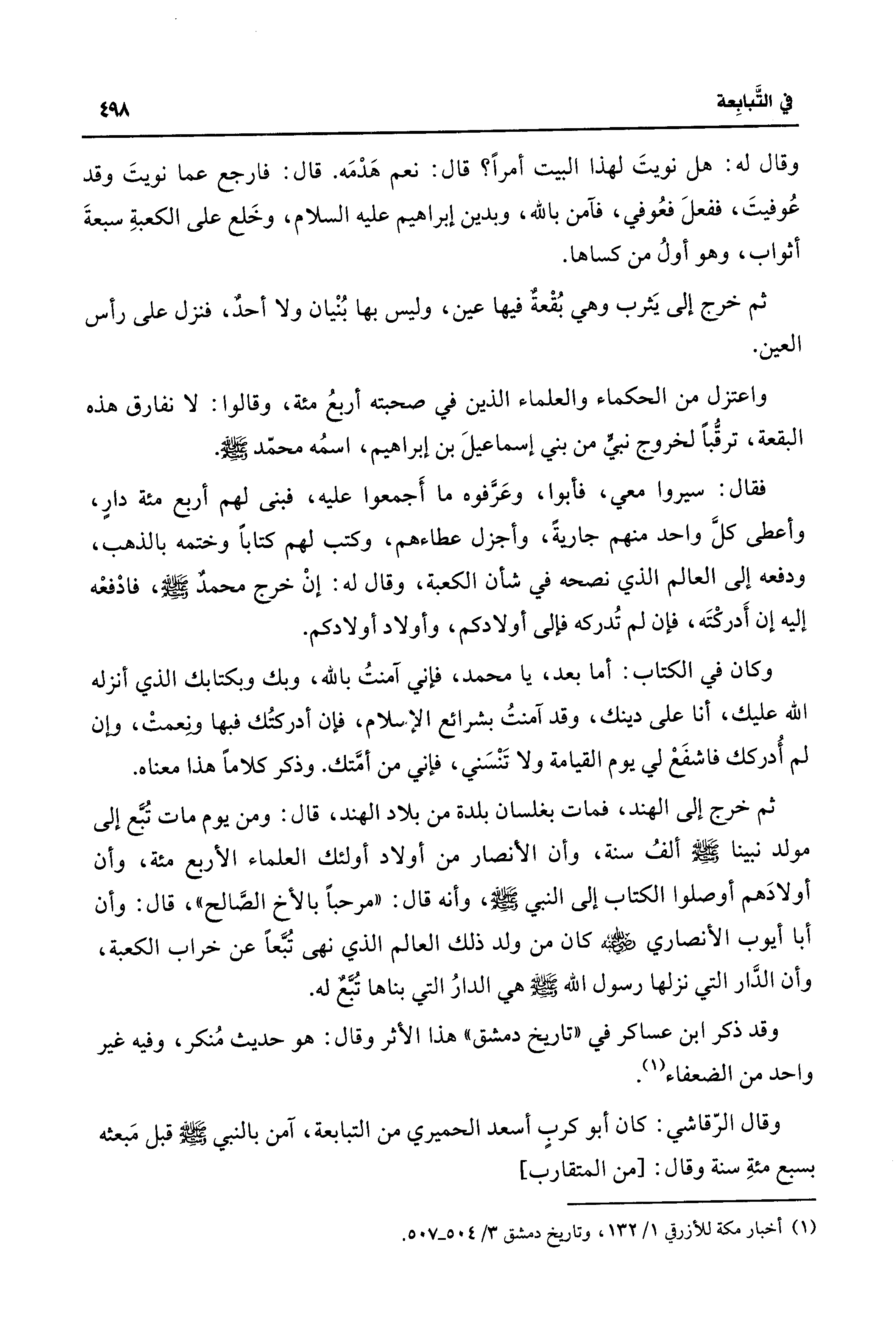 فقال: سيروا معي، فأبوا، وعَرَّفوه ما أَجمعوا عليه، فبنى لهم أربع مئة دارٍ، وأعطى كل واحد منهم جاريةً، وأجزل عطاءهم، وكتب لهم كتابًا وختمه بالذهب، ودفعه إلى العالم الذي نصحه في شأن الكعبة، وقال له: إنْ خرج محمدٌ - صلى الله عليه وسلم - , فادْفعْه إليه إن أَدركْتَه، فإن لم تُدركه فإلى أولادكم، وأولاد أولادكم.