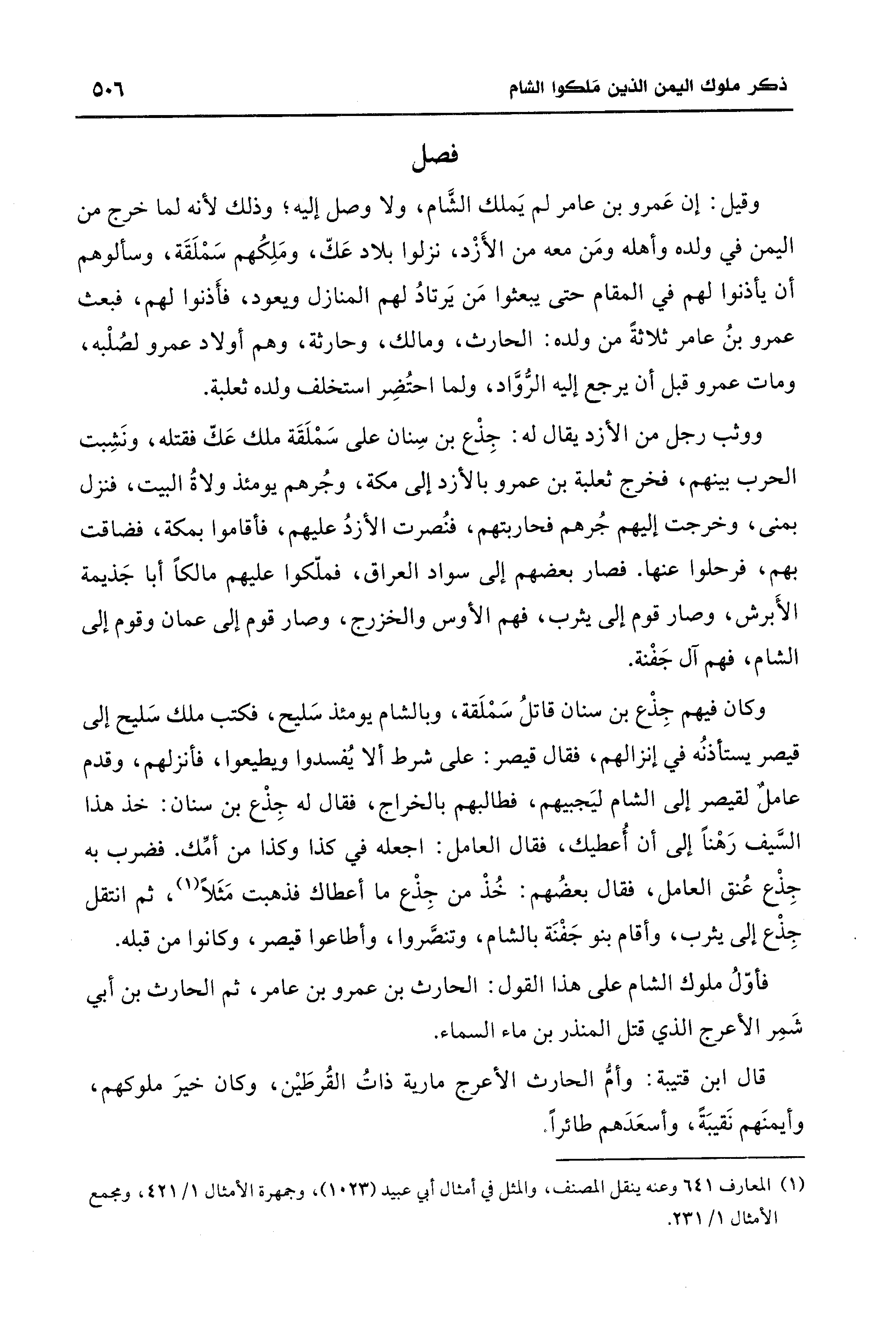 وكان فيهم جِذْع بن سنان قاتلُ سَمْلَقة، وبالشام يومئذ سَليح، فكتب ملك سَليح إلى قيصر يستأذنُه في إنزالهم، فقال قيصر: على شرط ألا يُفسدوا ويطيعوا، فأنزلهم، وقدم عاملٌ لقيصر إلى الشام ليَجبيهم، فطالبهم بالخراج، فقال له جِذْع بن سنان: خذ هذا السَّيف رَهْنًا إلى أن أُعطيك، فقال العامل: اجعله في كذا وكذا من أمّك. فضرب به جِذْع عُنق العامل، فقال بعضُهم: خُذْ من جِذْع ما أعطاك فذهبت مَثَلًا (¬1)، ثم انتقل جِذْع إلى يثرب، وأقام بنو جَفْنَة بالشام، وتنصَّروا، وأطاعوا قيصر، وكانوا من قبله.
