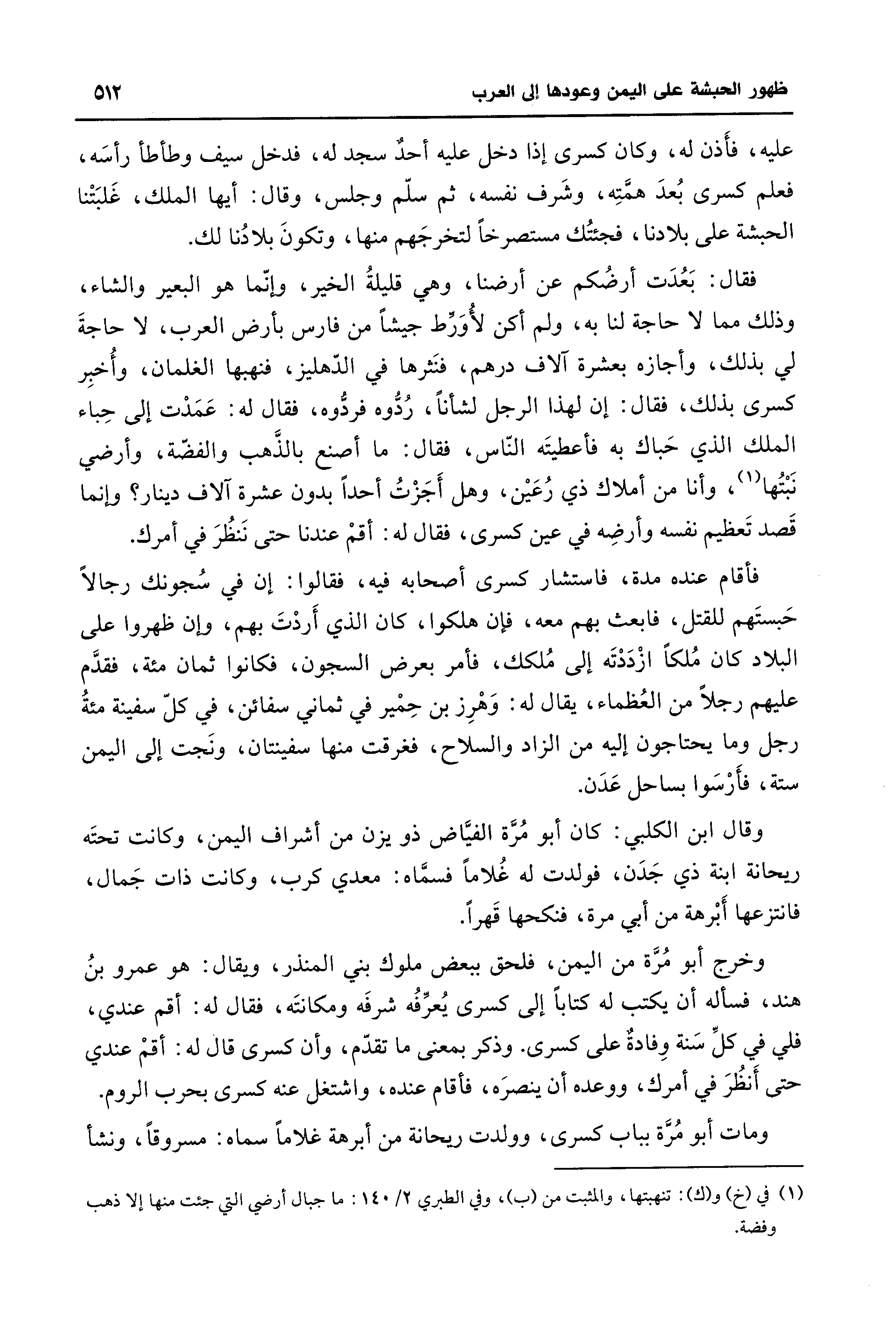 فقال: بَعُدَت أرضُكم عن أرضنا، وهي قليلةُ الخير، وإنّما هو البعير والشاء، وذلك مما لا حاجة لنا به، ولم أكن لأُوَرِّط جيشًا من فارس بأرض العرب، لا حاجةَ لي بذلك، وأجازه بعشرة آلاف درهم، فنَثرها في الدّهليز، فنهبها الغلمان، وأُخبِر كسرى بذلك، فقال: إن لهذا الرجل لشأنًا، رُدُّوه فردُّوه، فقال له: عَمَدْت إلى حِباء الملك الذي حَباك به فأعطيتَه النّاس، فقال: ما أصنع بالذَّهب والفضة، وأرضي نَبْتُها (¬1)، وأنا من أملاك ذي رُعَيْن، وهل أَجَزْتُ أحدًا بدون عشرة آلاف دينار؟ وإنما قَصد تَعظيم نفسه وأرضِه في عين كسرى، فقال له: أقمْ عندنا حتى نَنظُرَ في أمرك.