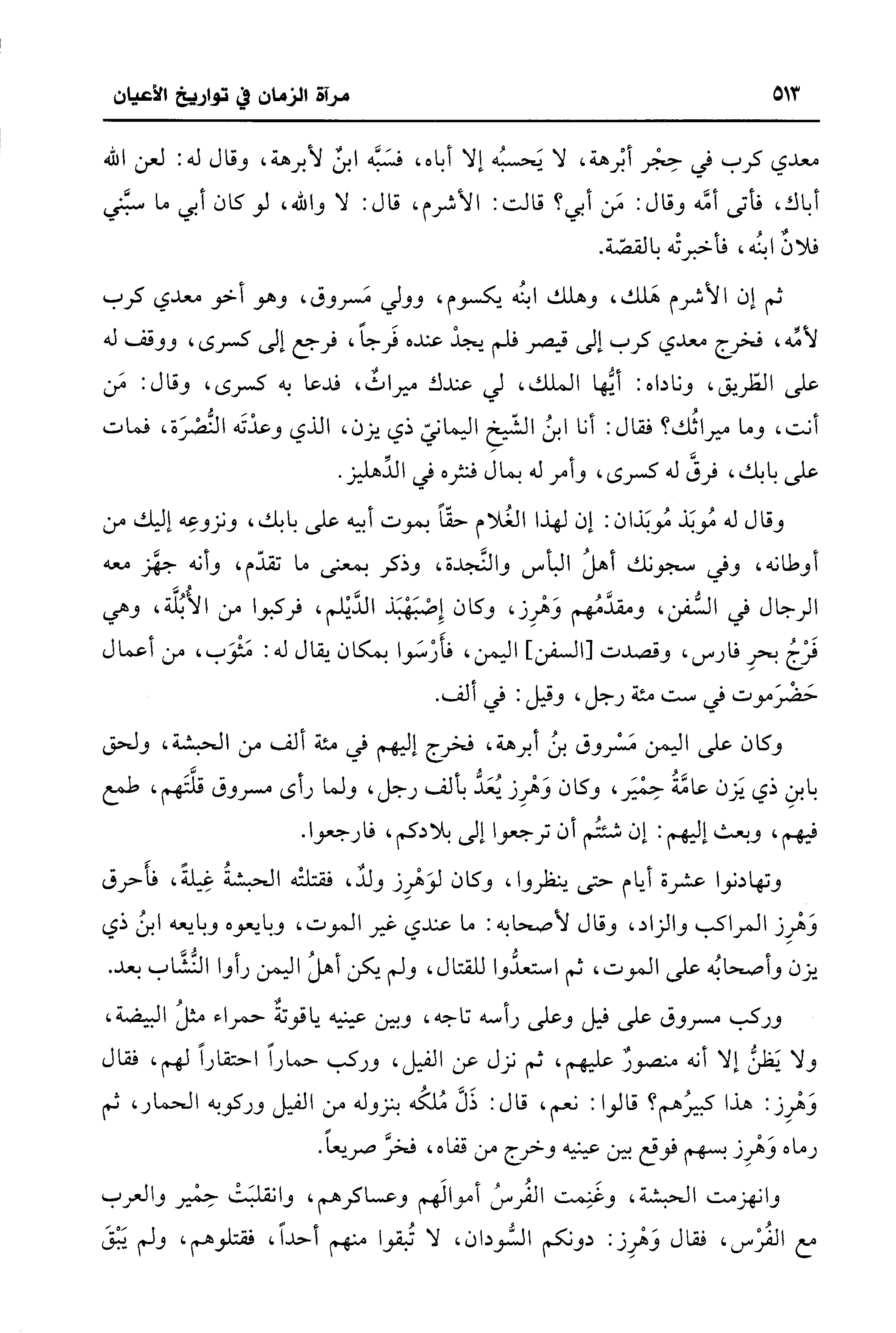 ثم إن الأشرم هَلك، وهلك ابنُه يكسوم، وولي مَسروق، وهو أخو معدي كرب لأمّه، فخرج معدي كرب إلى قيصر فلم يجدْ عنده فَرجًا، فرجع إلى كسرى، ووقف له على الطّريق، وناداه: أيُّها الملك، لي عندك ميراثٌ، فدعا به كسرى، وقال: مَن أنت، وما ميراثُك؟ فقال: أنا ابنُ الشّيخِ اليمانيّ ذي يزن، الذي وعدْتَه النُّصْرَة، فمات على بابك، فرقَّ له كسرى، وأمر له بمال فنثره في الدِّهليز.