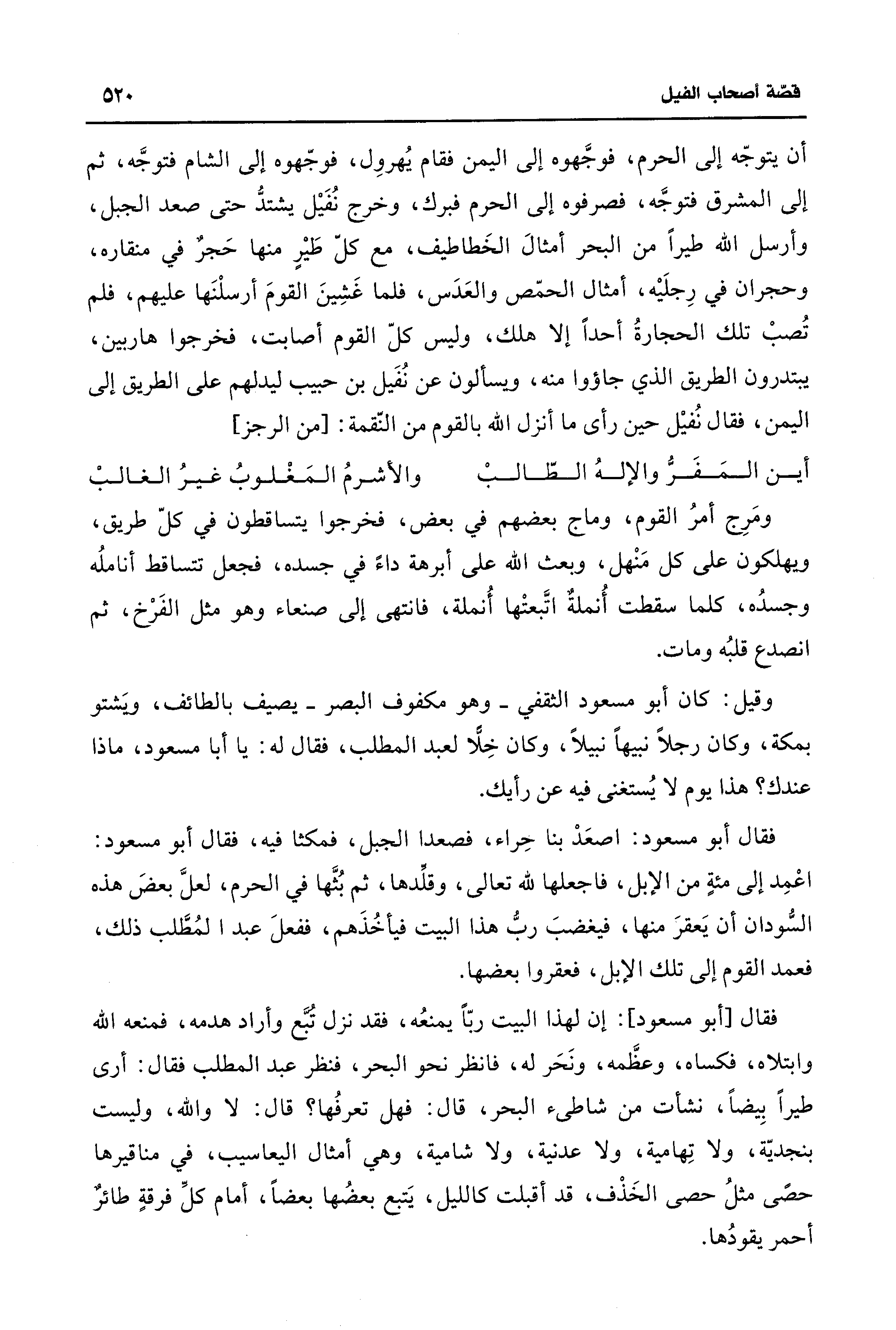 فقال [أبو مسعود]: إن لهذا البيت ربّاً يمنعُه، فقد نزل تُبَّع وأراد هدمه، فمنعه الله وابتلاه، فكساه، وعظَّمه، ونَحَر له، فانظر نحو البحر، فنظر عبد المطّلب فقال: أرى طيراً بِيضاً، نشأت من شاطئ البحر، قال: فهل تعرفُها؟ قال: لا والله، وليست بنجديّة، ولا تِهامية، ولا عدنية، ولا شامية، وهي أمثال اليعاسيب، في مناقيرها حصًى مثلُ حصى الخَذْف، قد أقبلت كالليل، يَتبع بعضُها بعضاً، أمام كلِّ فرقةٍ طائرٌ أحمر يقودُها.