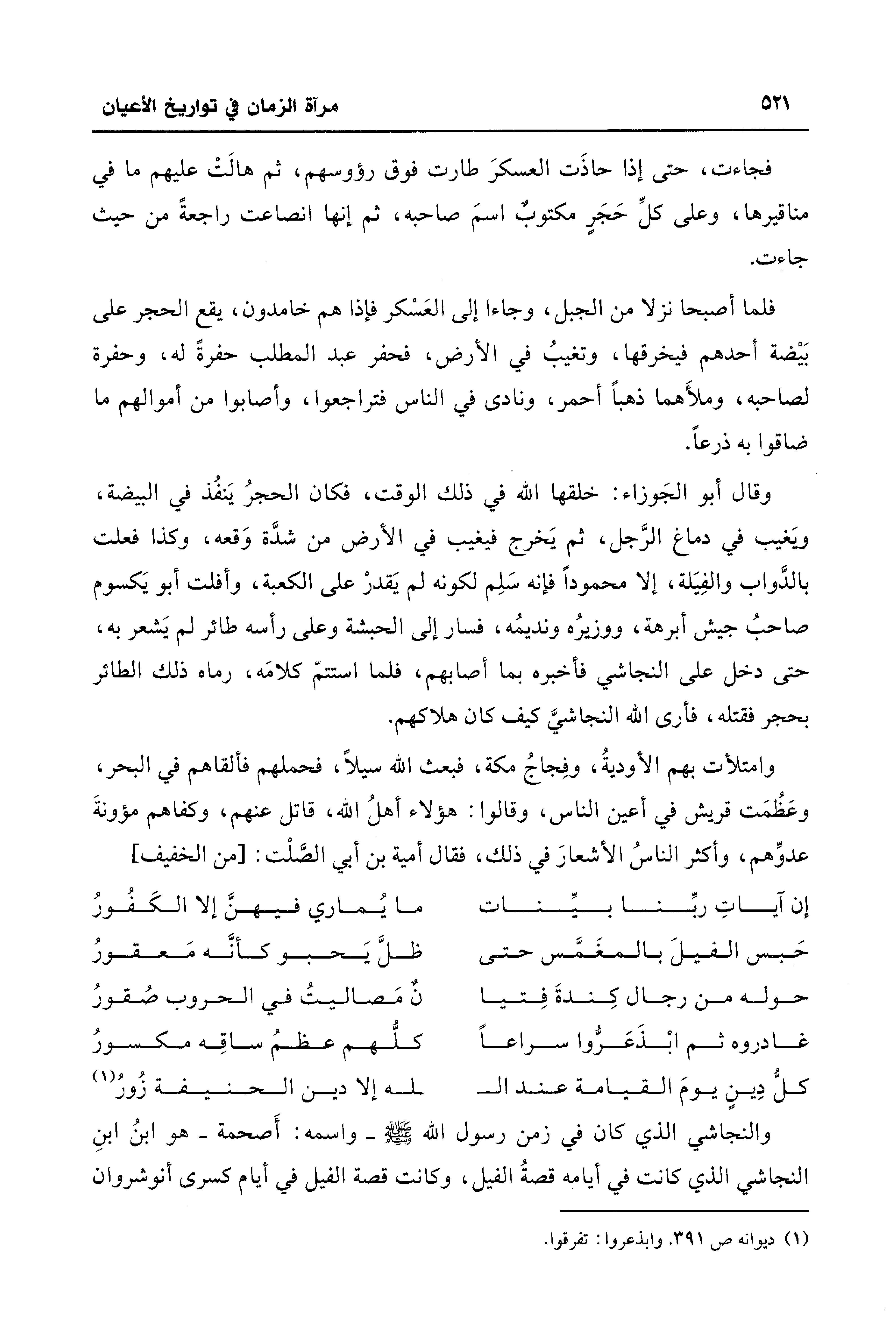 وقال أبو الجَوزاء: خلقها الله في ذلك الوقت، فكان الحجرُ يَنفُذ في البيضة، وَيغيب في دماغ الرَّجل، ثم يَخرج فيغيب في الأرض من شدَّة وَقعه، وكذا فعلت بالدَّواب والفِيَلة، إلَّا محموداً فإنَّه سَلِم لكونه لم يَقدرْ على الكعبة، وأفلت أبو يَكسوم صاحبُ جيش أبرهة، ووزيرُه ونديمُه، فسار إلى الحبشة وعلى رأسه طائر لم يَشعر به، حتَّى دخل على النجاشي فأخبره بما أصابهم، فلما استتمّ كلامَه، رماه ذلك الطائر بحجر فقتله، فأرى الله النجاشي كيف كان هلاكهم.