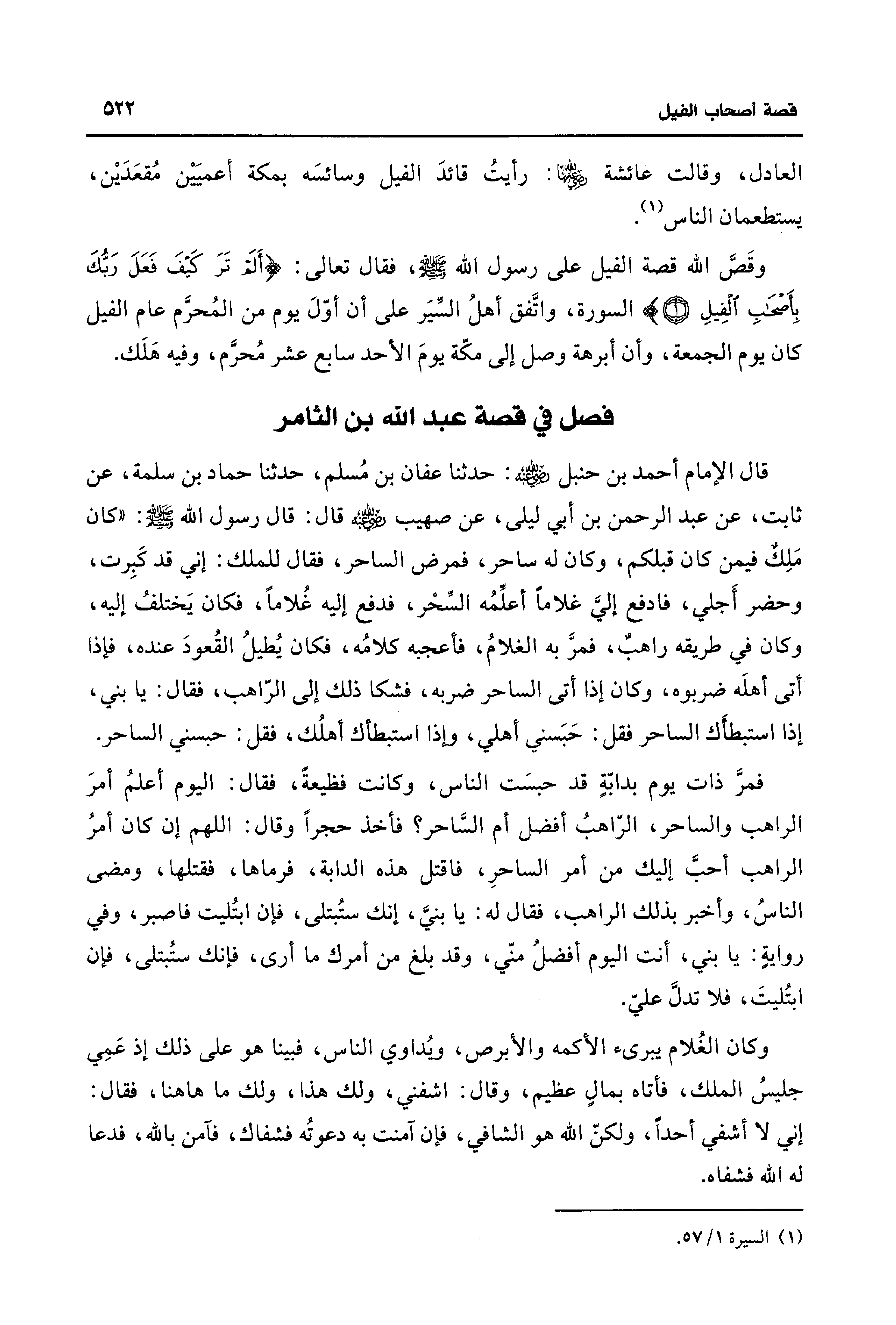 قال الإمام أحمد بن حنبل - رضي الله عنه -: حدّثنا عفَّان بن مُسلم، حدّثنا حماد بن سلمة، عن ثابت، عن عبد الرحمن بن أبي ليلى، عن صهيب - رضي الله عنه - قال: قال رسول الله - صلى الله عليه وسلم -: "كان مَلِكٌ فيمن كان قبلكم، وكان له ساحر، فمرض الساحر، فقال للملك: إنِّي قد كَبِرت، وحضر أَجلي، فادفع إليَّ غلاماً أعلِّمُه السِّحْر، فدفع إليه غُلاماً، فكان يَختلفُ إليه، وكان في طريقه راهبٌ، فمرَّ به الغلامُ، فأعجبه كلامُه، فكان يُطيلُ القُعودَ عنده، فإذا أتى أهلَه ضربوه، وكان إذا أتى الساحر ضربه، فشكا ذلك إلى الرّاهب، فقال: يا بني، إذا استبطأَك الساحر فقل: حَبَسني أهلي، وإذا استبطأك أهلُك، فقل: حبسني الساحر.