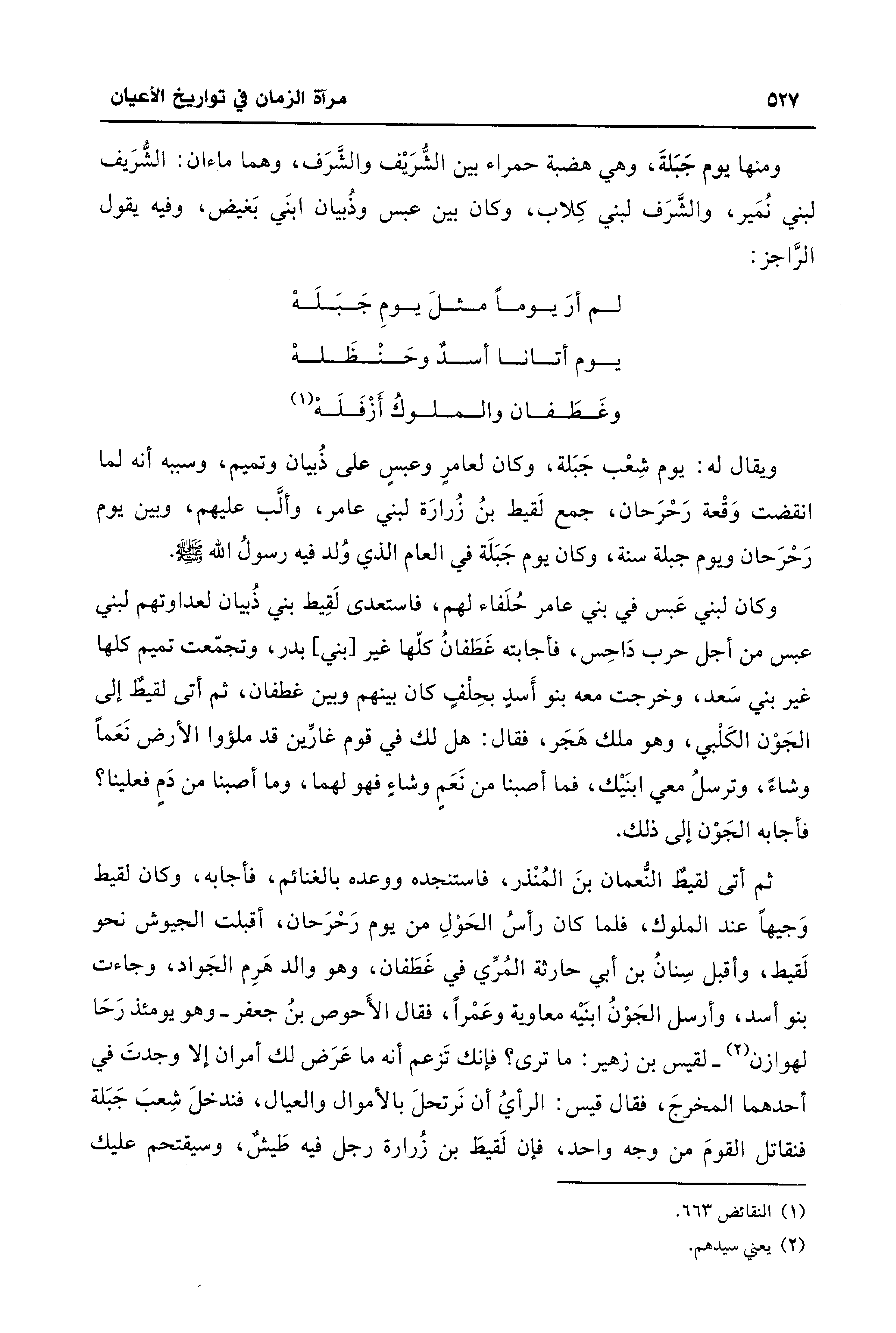 ومنها يوم جَبَلةَ، وهي هضبة حمراء بين الشُّرَيْف والشَّرَف، وهما ماءان: الشُّرَيف لبني نُمَير، والشَّرَف لبني كِلاب، وكان بين عبس وذُبيان ابنَي بَغيض، وفيه يقول الرَّاجز: