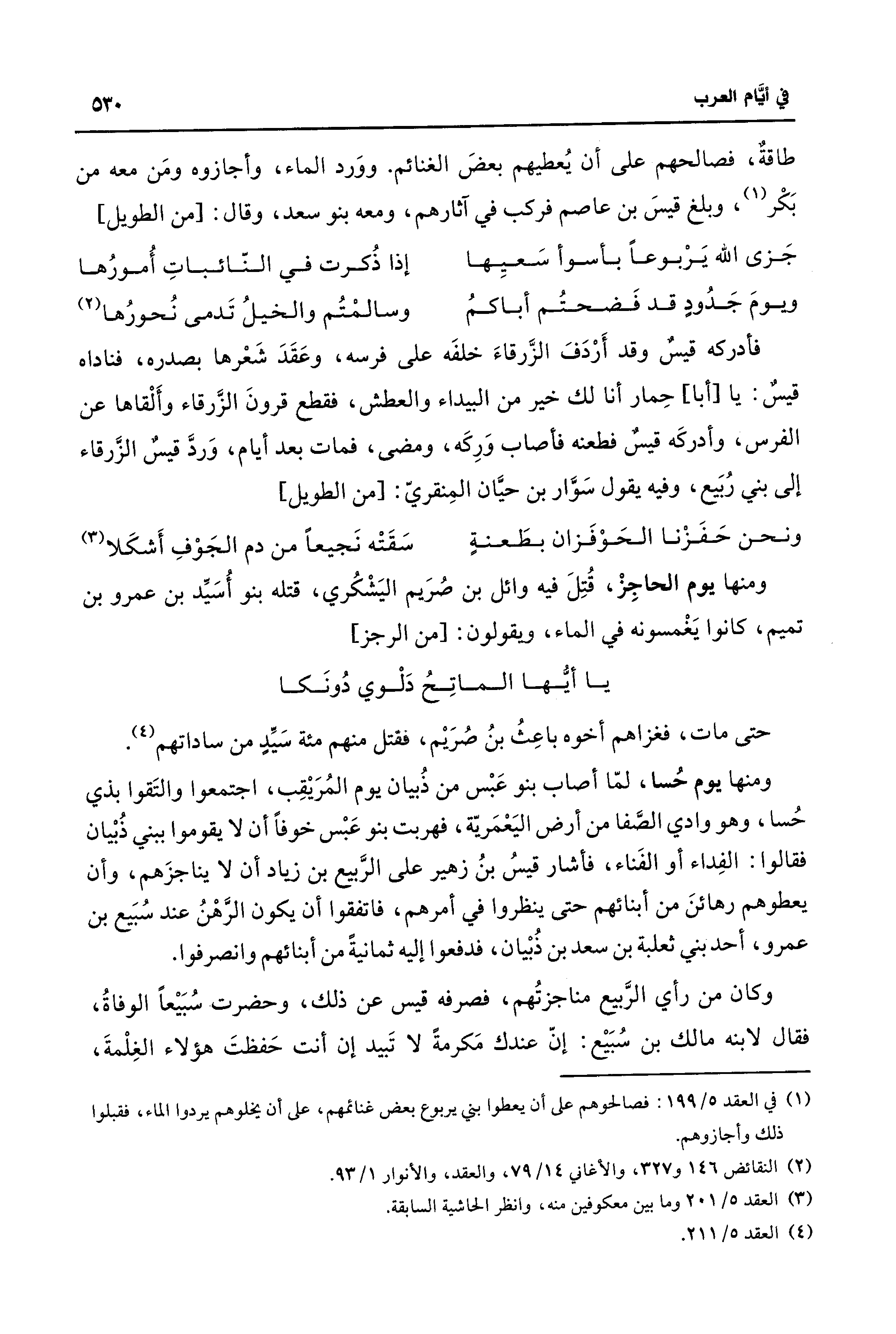 طاقةٌ، فصالحهم على أن يُعطيهم بعضَ الغنائم. ووَرد الماء، وأجازوه ومَن معه من بَكْر (¬1)، وبلغ قيسَ بن عاصم فركب في آثارهم، ومعه بنو سعد، وقال: [من الطَّويل]